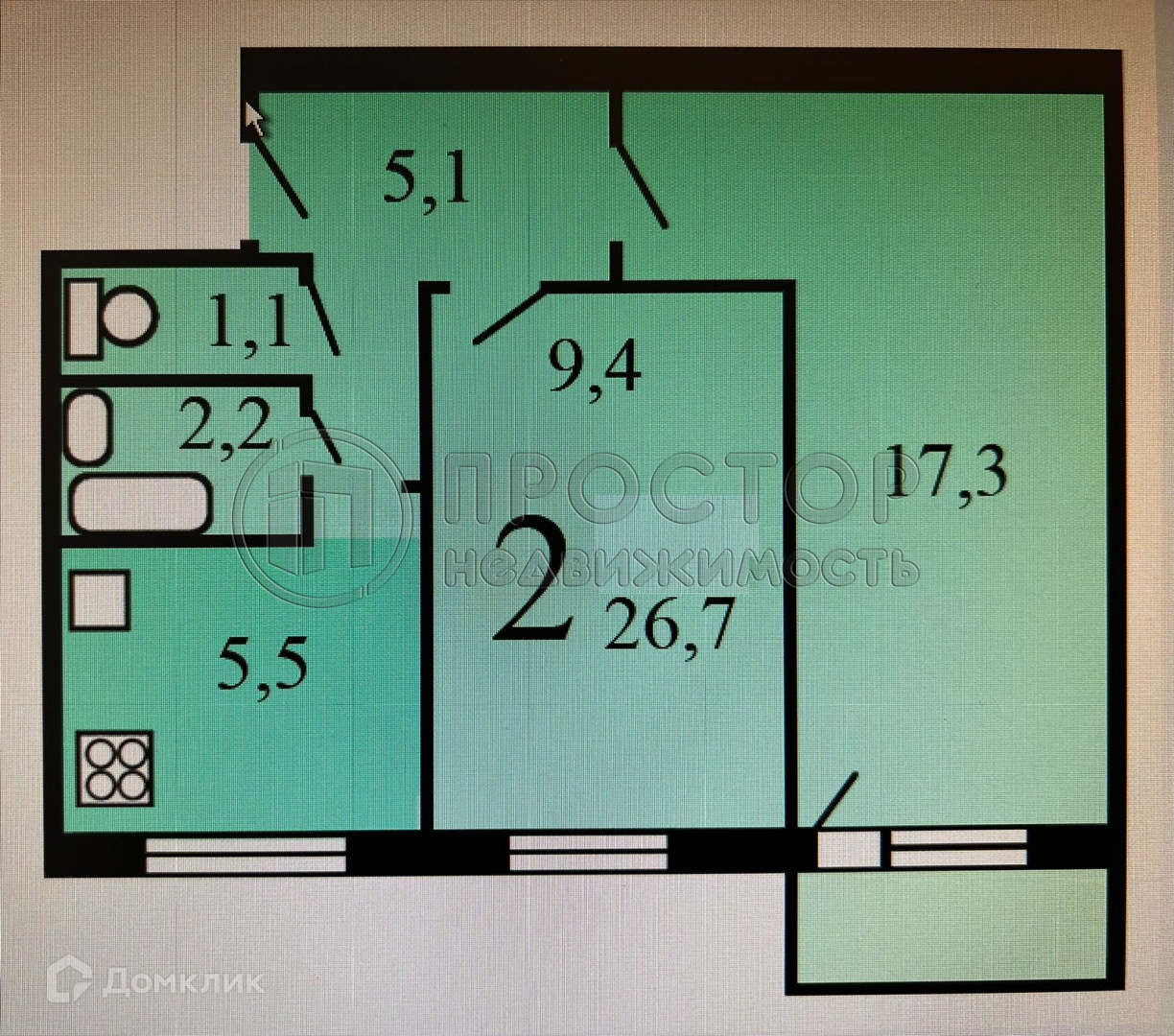 Жилая площадь 26.7 м2