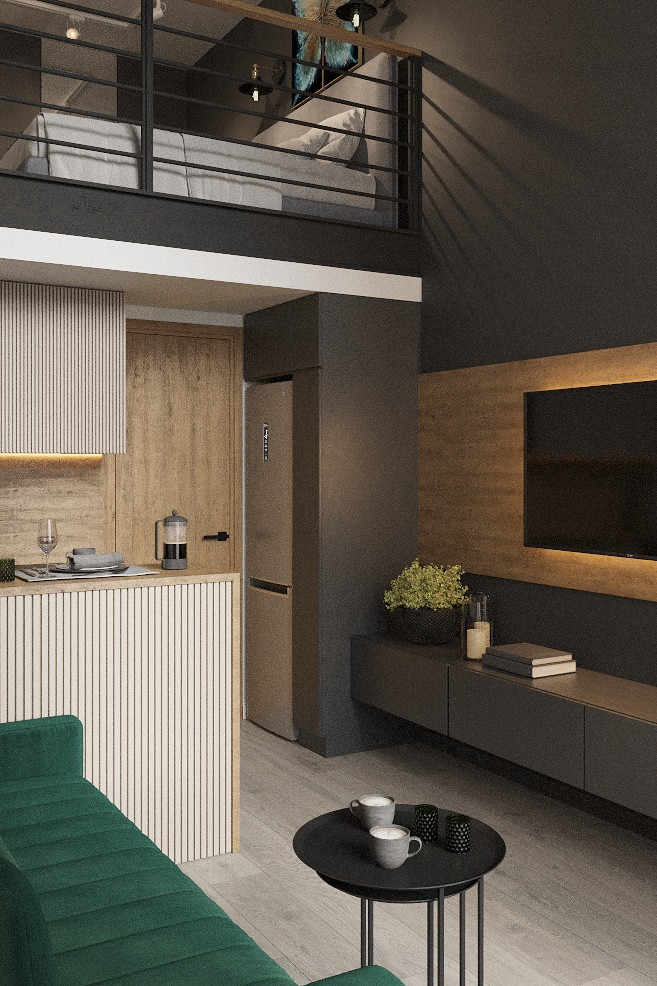 ✔Двух уровневая студия с высотой потолков 4.5 м. – идеально подходит для сдачи посуточно и в долгосрок.