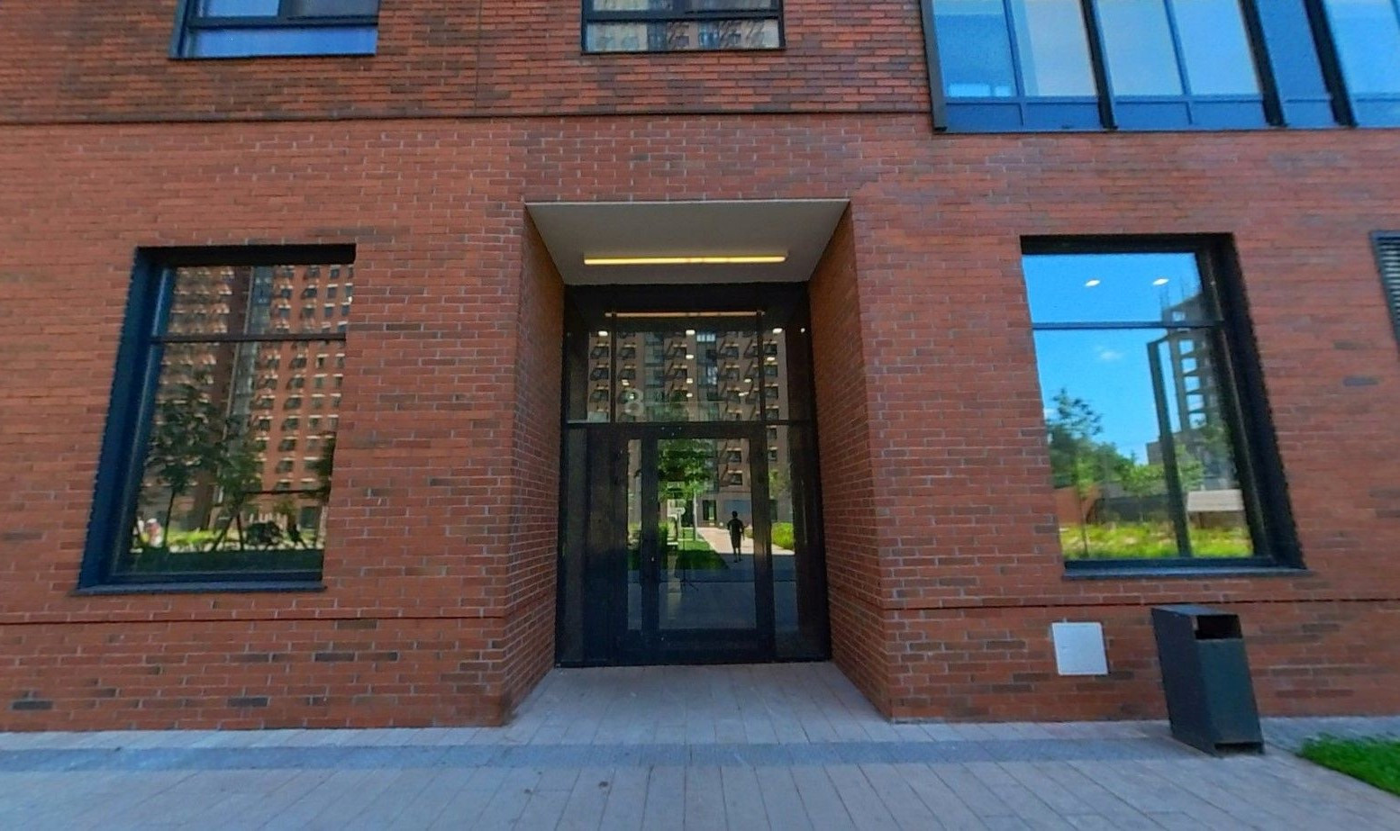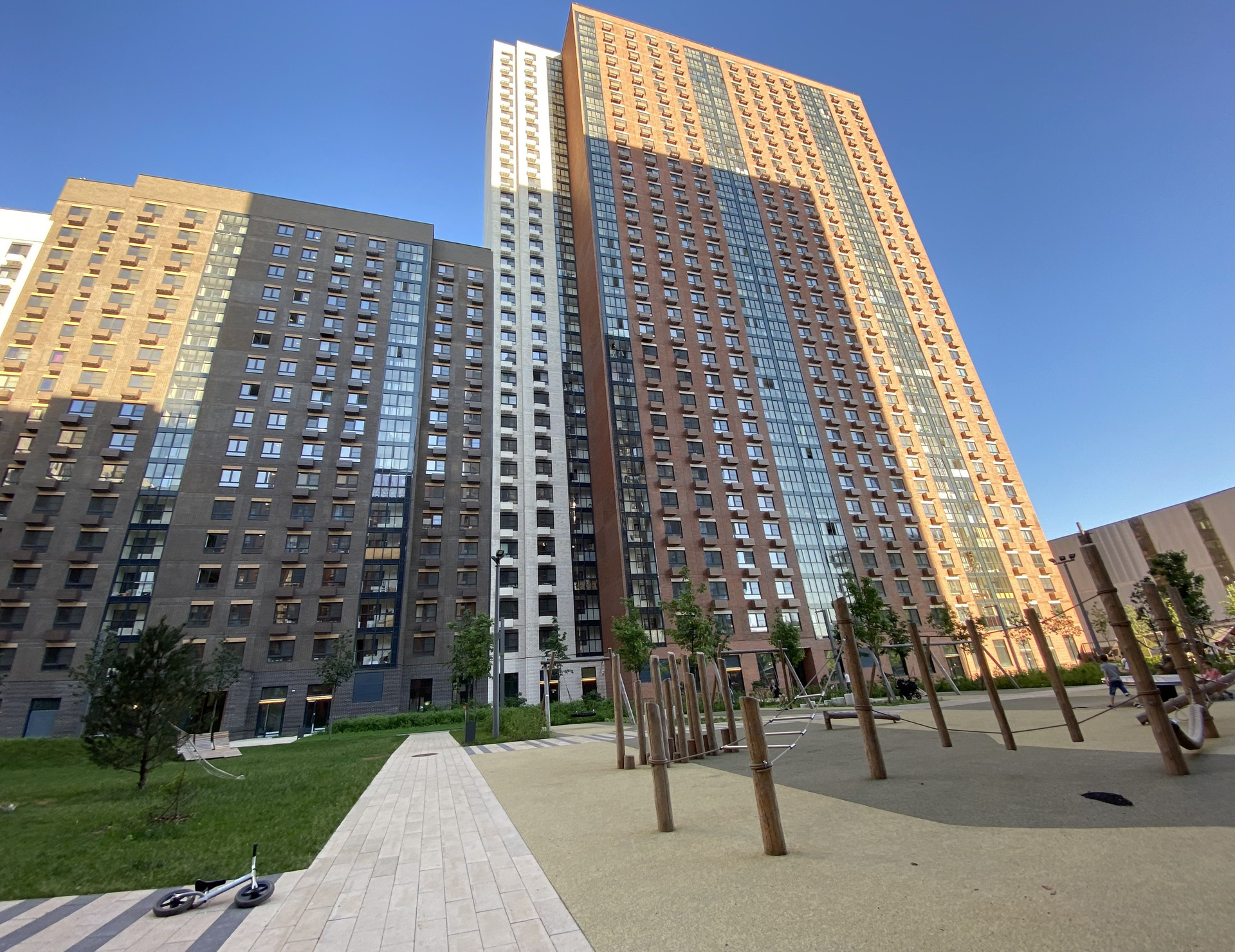 Охраняемая под видеонаблюдением территория. Внутренняя территория свободна от машин - дворы-парки. Во дворах современные игровые и спортивные площадки. Высажены деревья, кустарники , цветы, установлены скамейки для отдыха, проложены тротуары для прогулок.