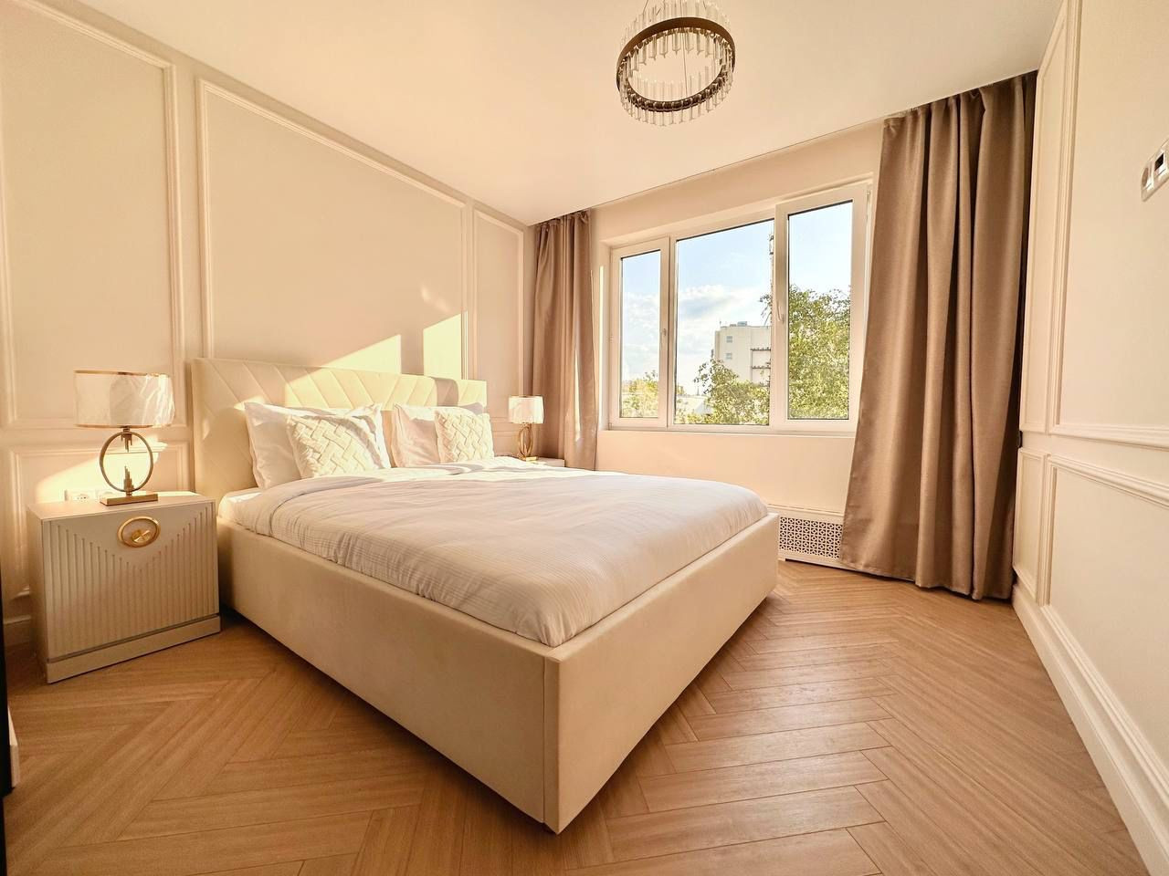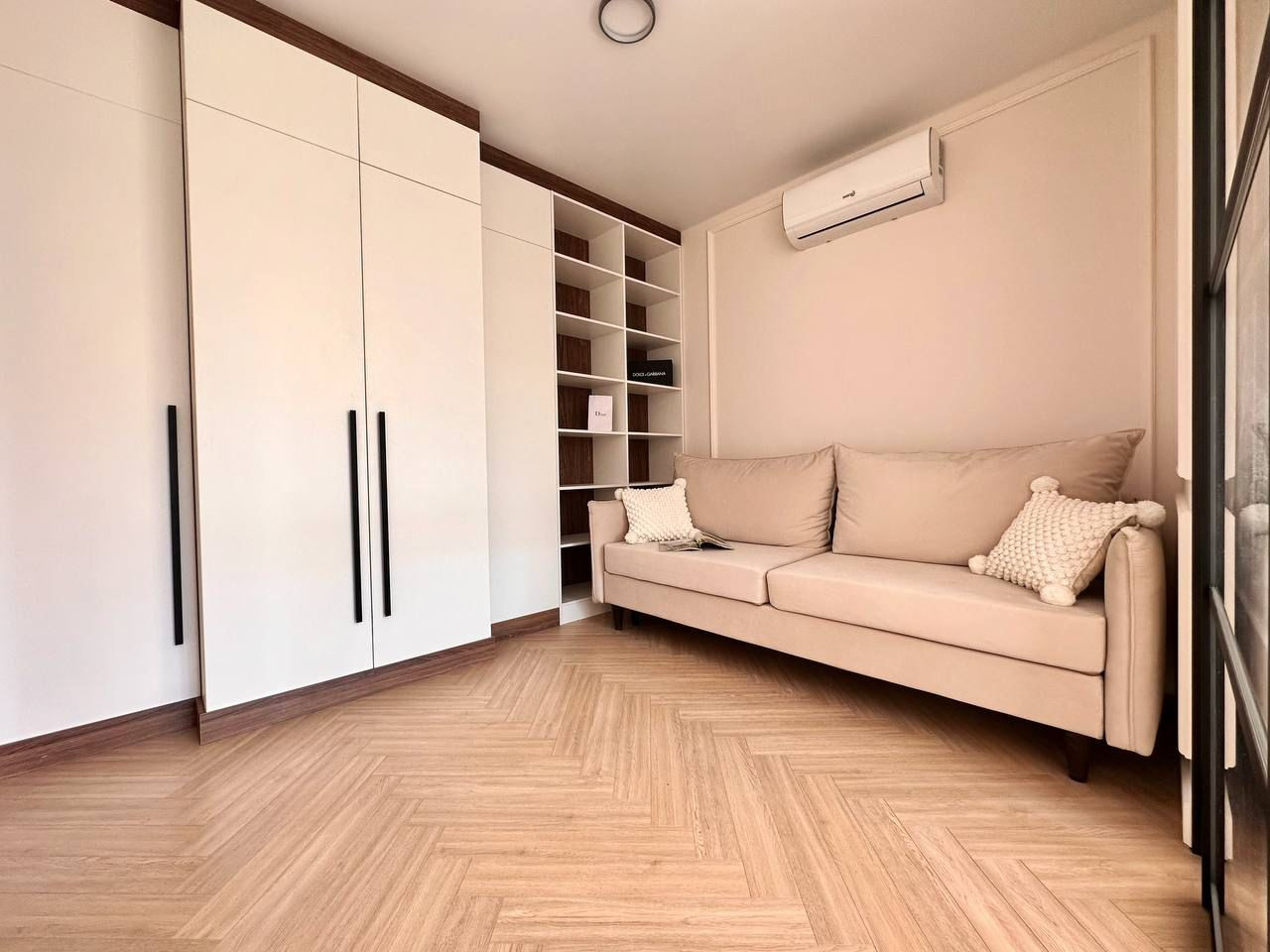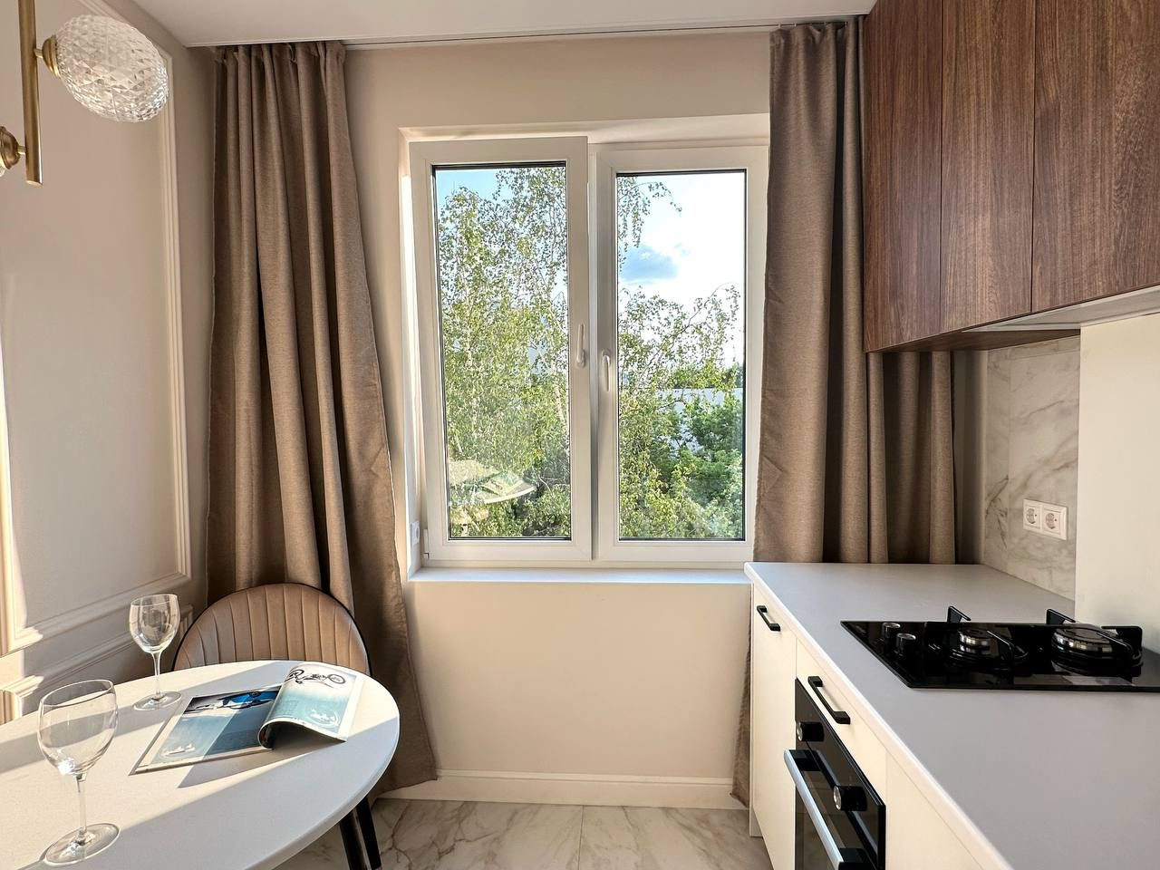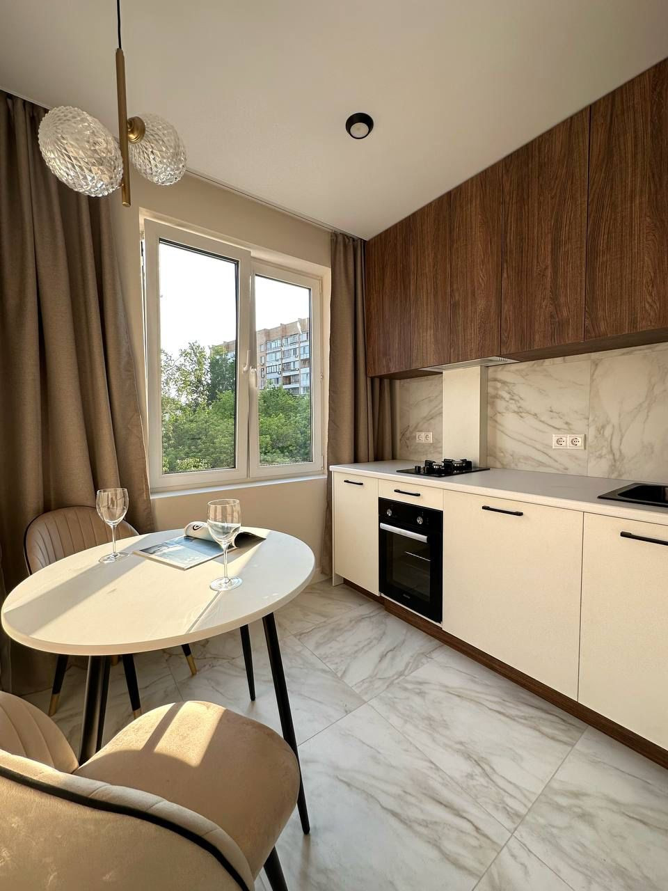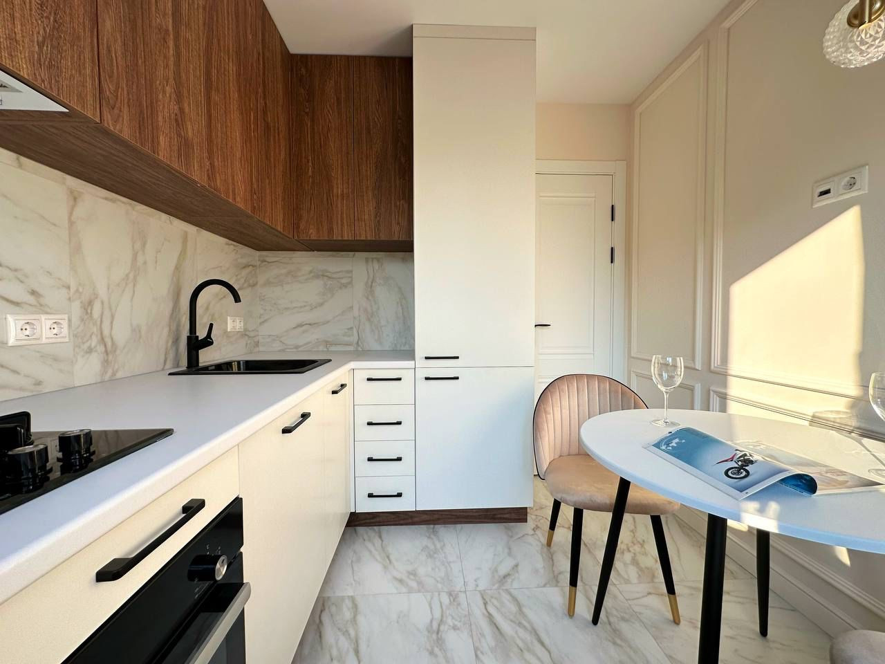 Продаётся дизайнерская однокомнатная квартира, разделённая на зоны: отдельная спальня с перегородкой, гостиная с раскладным диваном, встроенным шкафом и телевизором, встроенная кухня с новой техникой: стиральная машинка с сушкой, посудомоечная машинка, варочная панель на 2 конфорки, духовой шкаф, холодильник, вытяжка.