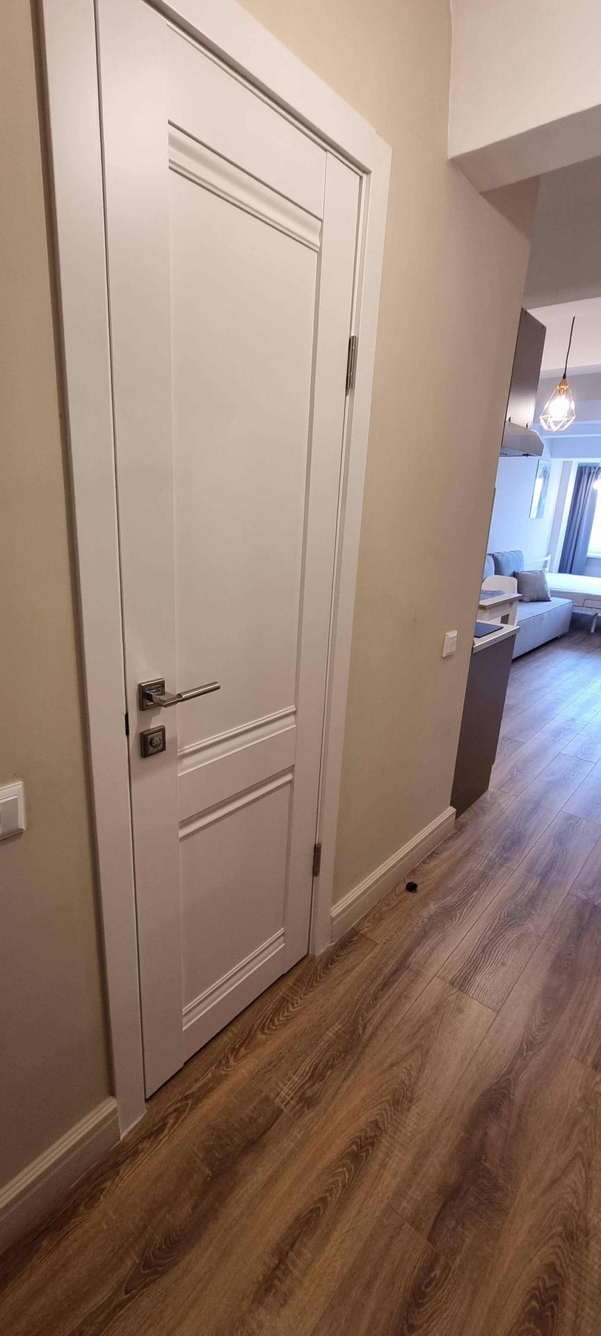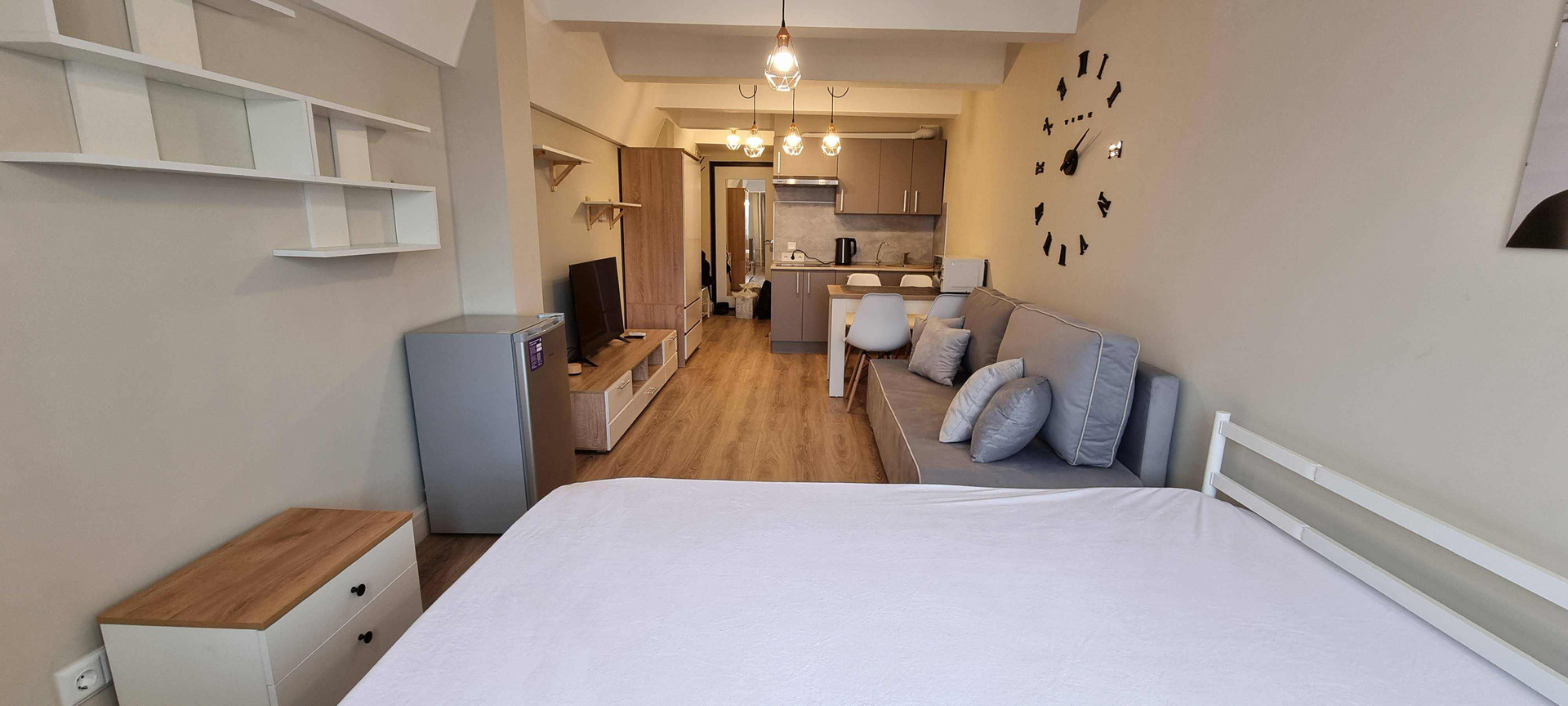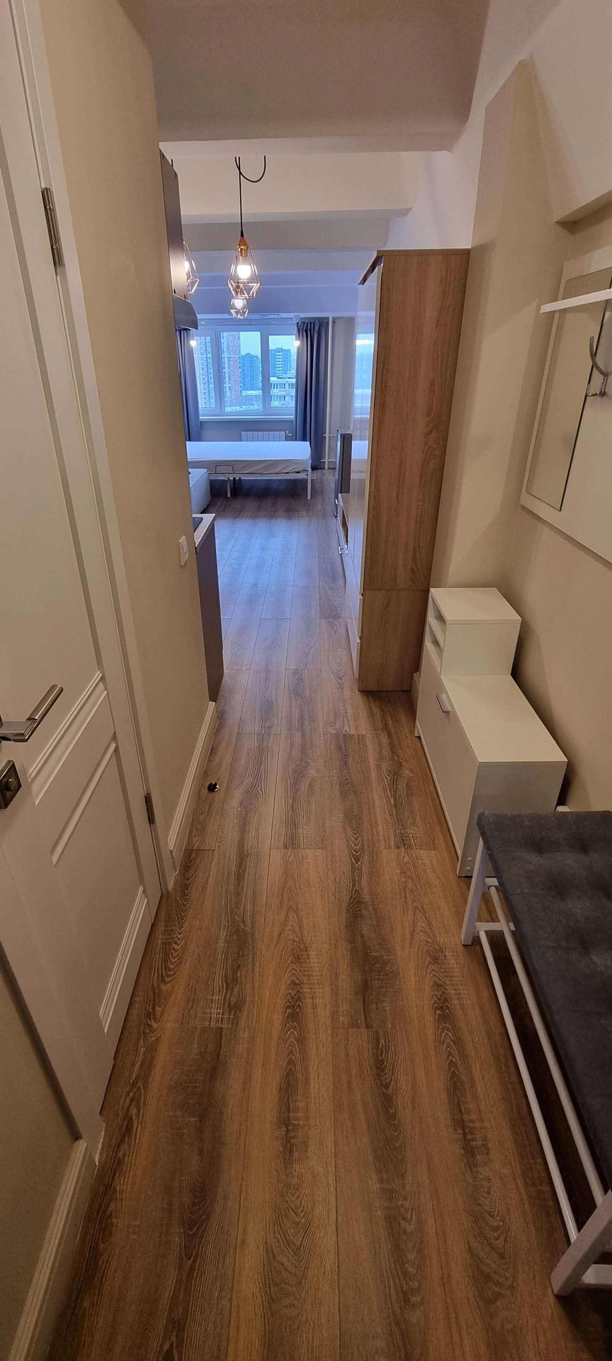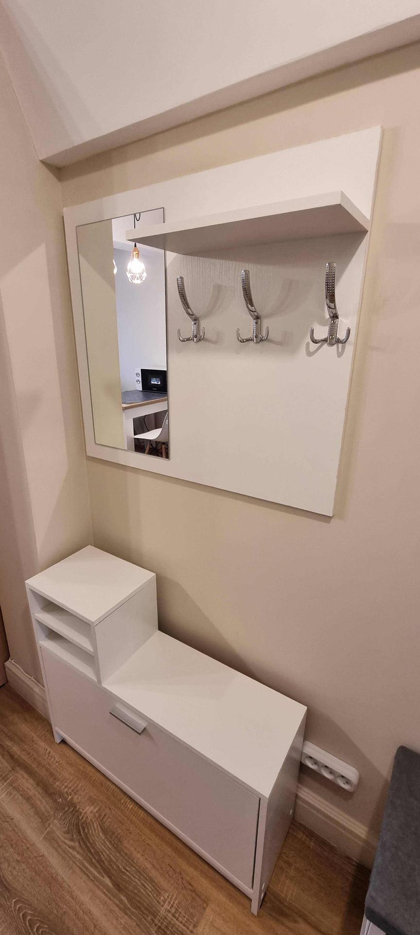 Новая мебель: кухонный гарнитур, обеденный стол, раскладной диван, двуспальная кровать с ортопедическим матрасом, платяной шкаф, тумба, 3 настенные полки, тумба под ТВ, банкетка, настенная вешалка с зеркалом и тумбой
