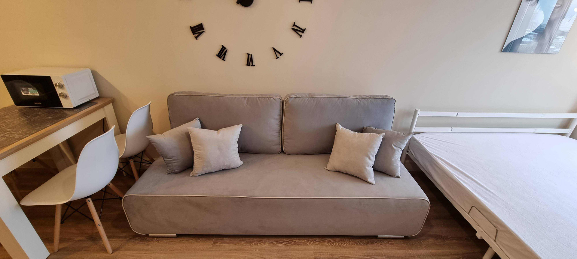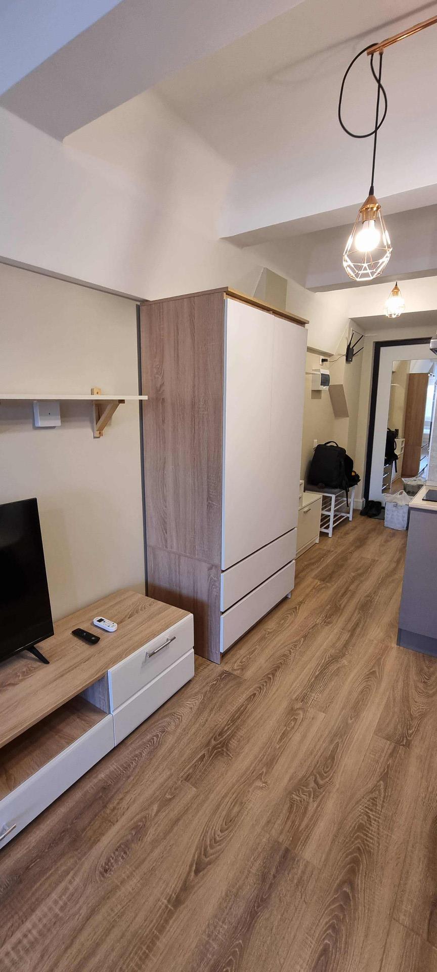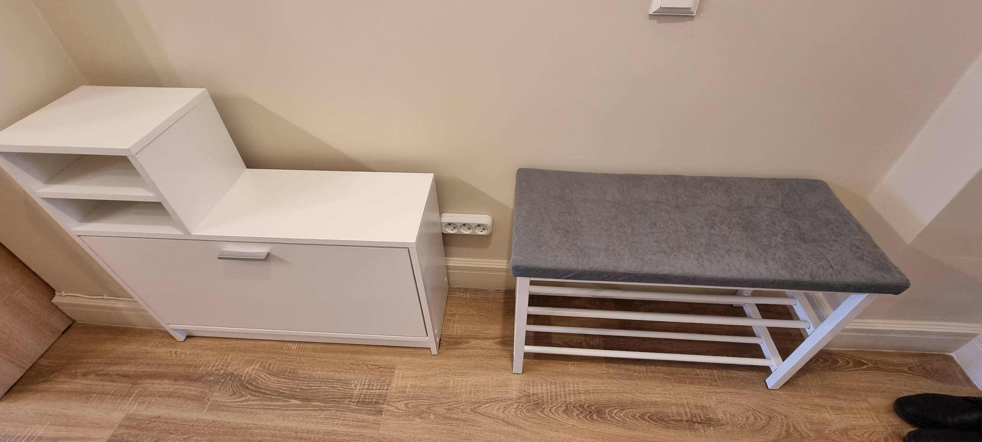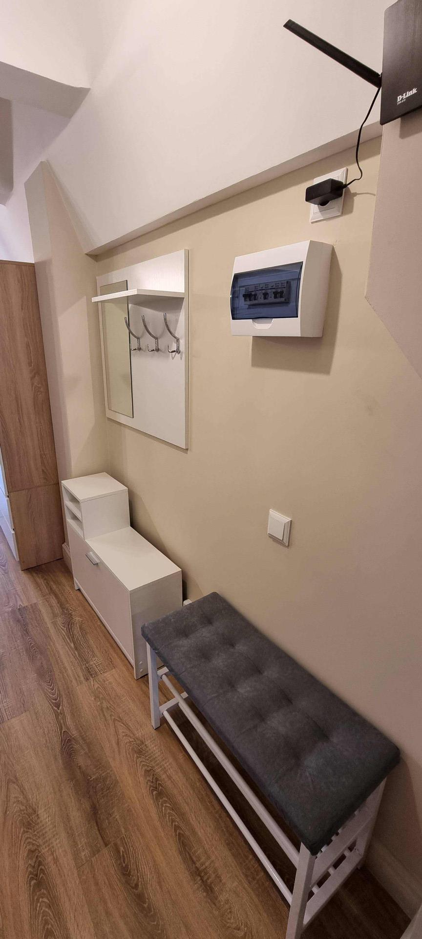 Новая мебель: кухонный гарнитур, обеденный стол, раскладной диван, двуспальная кровать с ортопедическим матрасом, платяной шкаф, тумба, 3 настенные полки, тумба под ТВ, банкетка, настенная вешалка с зеркалом и тумбой