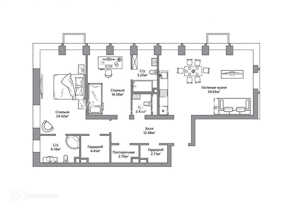 Функциональная планировка квартиры включает кухню-гостиную, мастер-блок с собственной гардеробной и санузлом, вторую спальню, ванную комнату, гардеробную и постирочную.