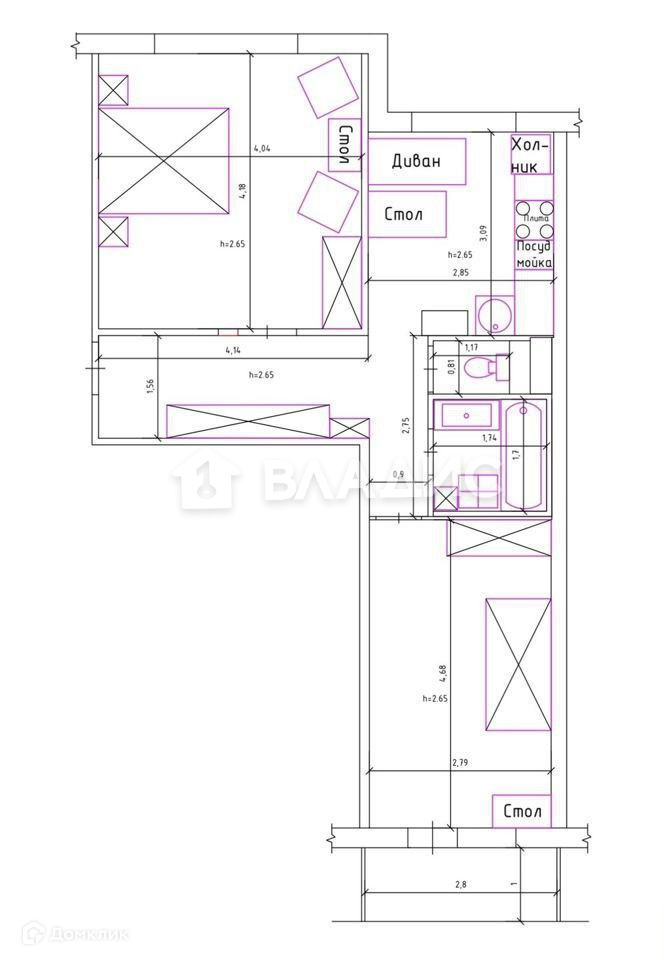 Высота потолков 2.64 м