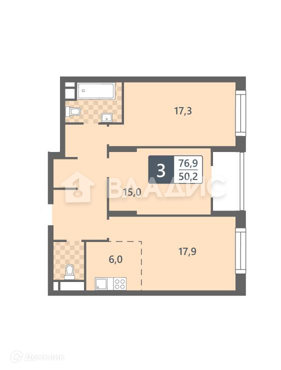 Общая площадь 76.9 м2