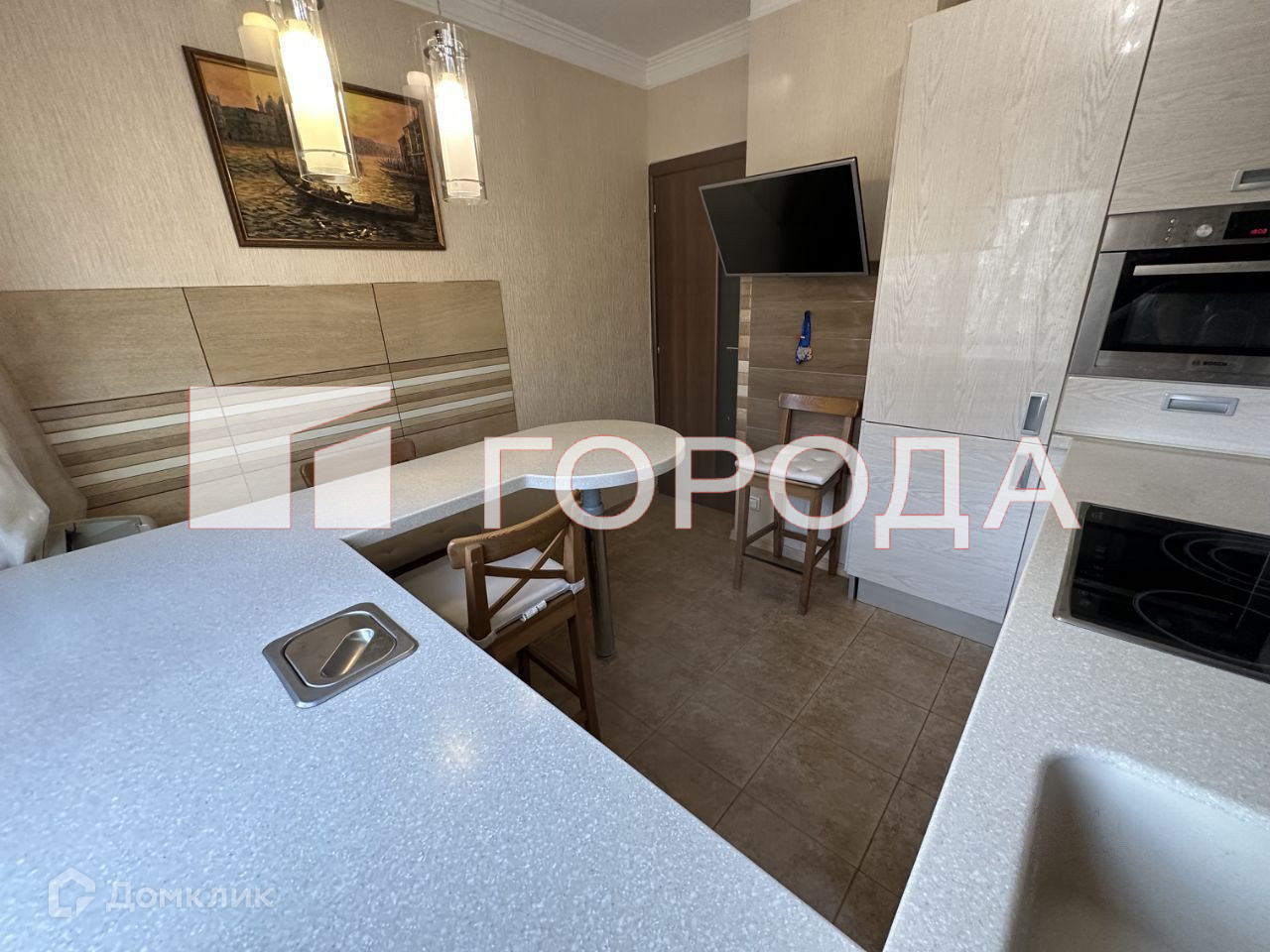 Кухня с барной стойкой, мраморной столешницей, полностью оборудованная встроенной техникой Bosh: