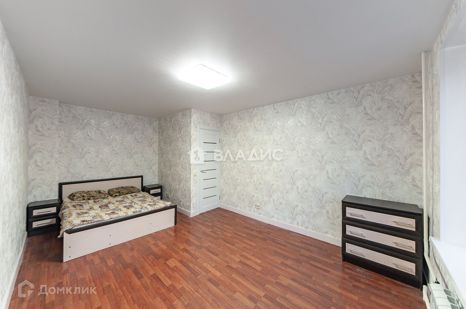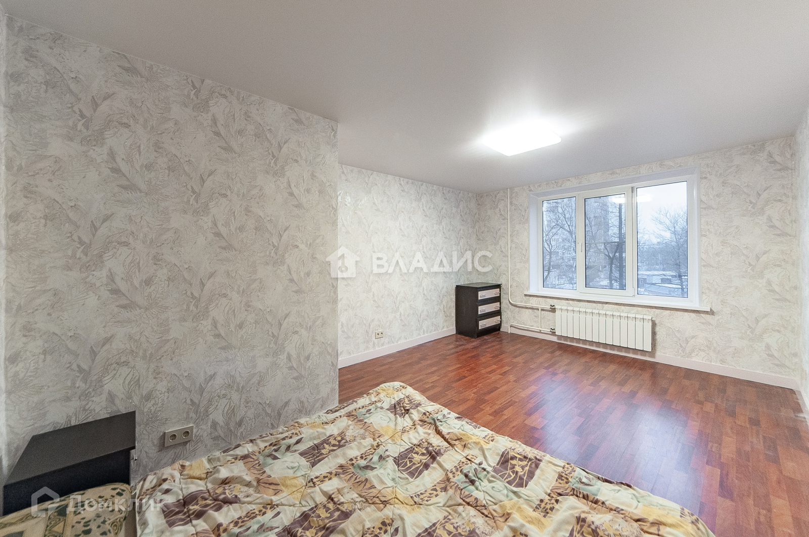 В жилой комнате большое пространство для ремонта, стоит двуспальная кровать а так же комоды для хранения