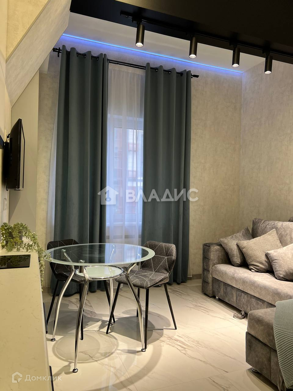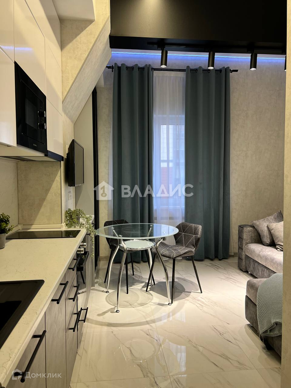 Студия обставлена новой мебелью и техникой (телевизор, микроволновая печь, духовой шкаф, индукционная плита, чайник, раскладной диван).