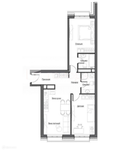Планировка: кухня-гостиная, две изолированные комнаты, два с/у, прихожая.