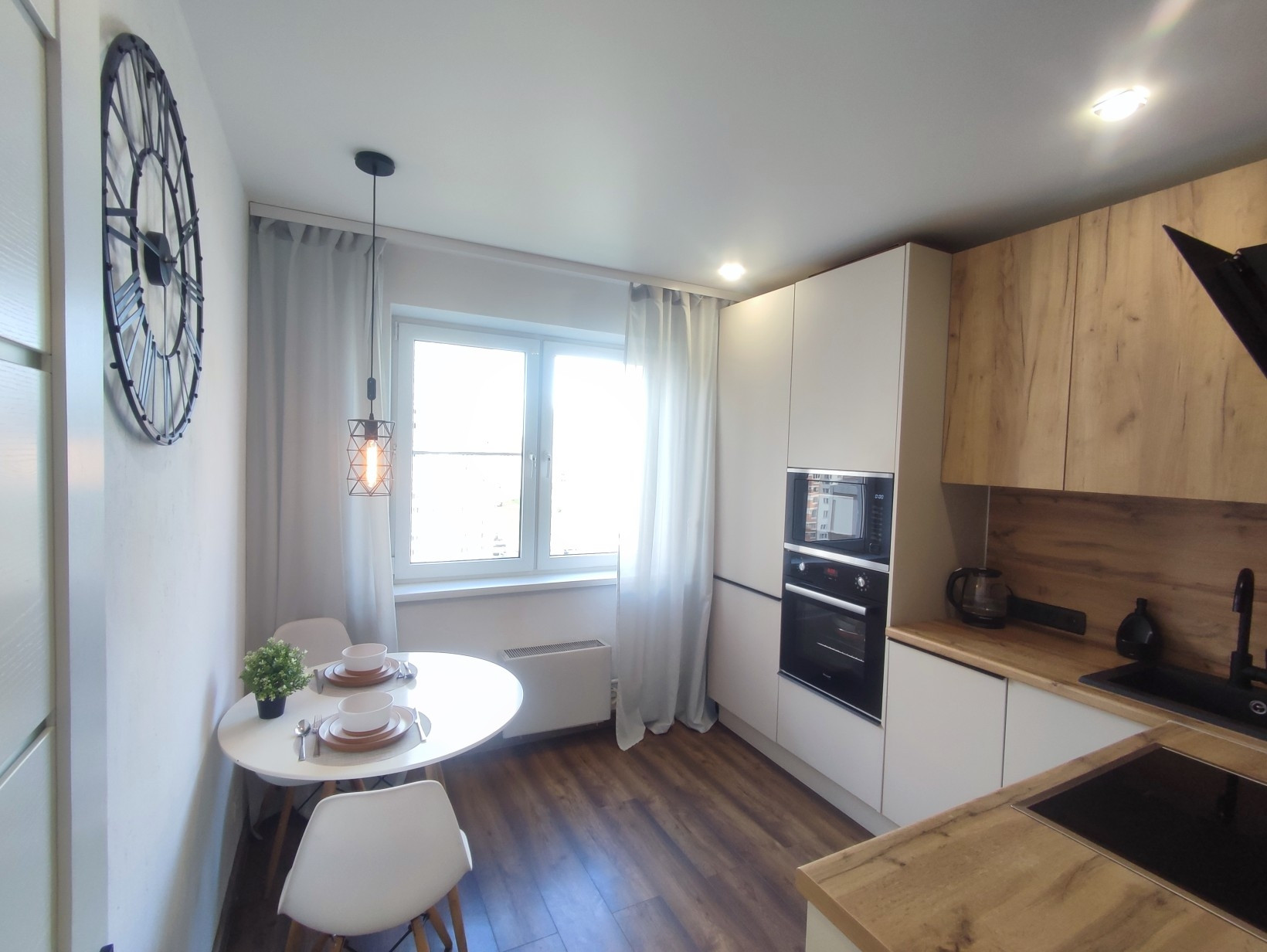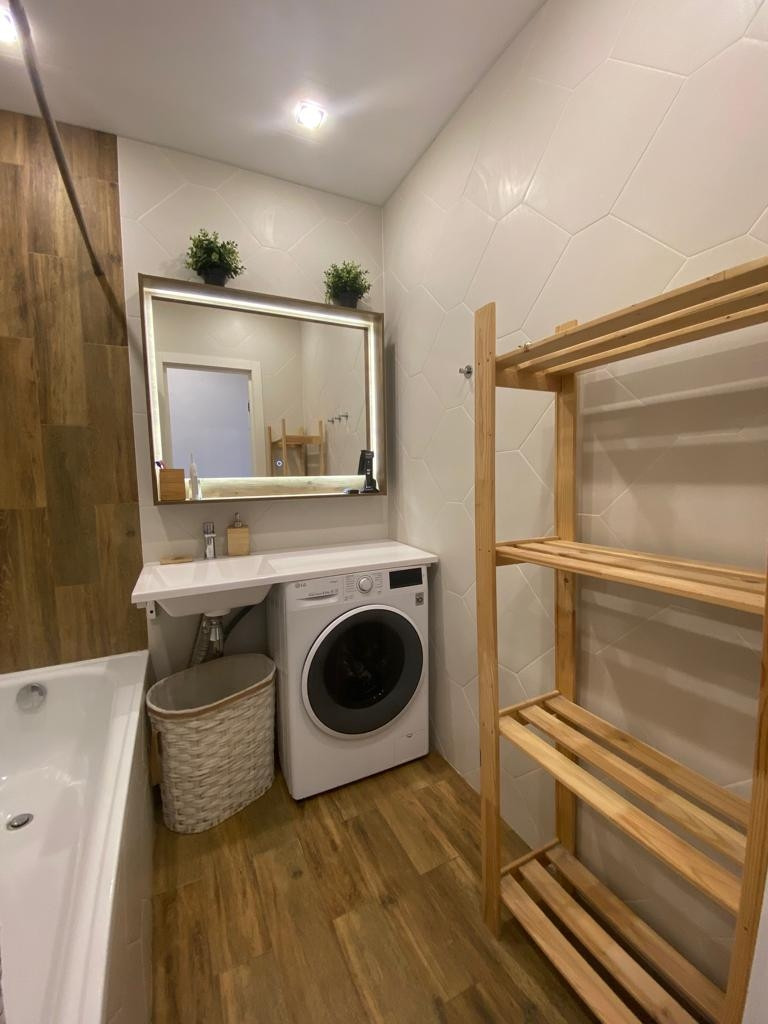 В квартире функциональная кухня 9 кв. м., оборудована  кухонным гарнитуром с полным арсеналом встроенной техники (посудомоечная машина, варочная панель, духовой шкаф, микроволновка и холодильник). Качественная импортная сантехника. Мебель и техника при продаже остается.
