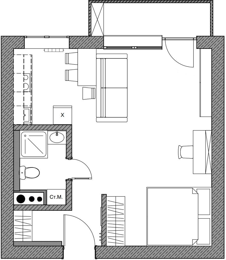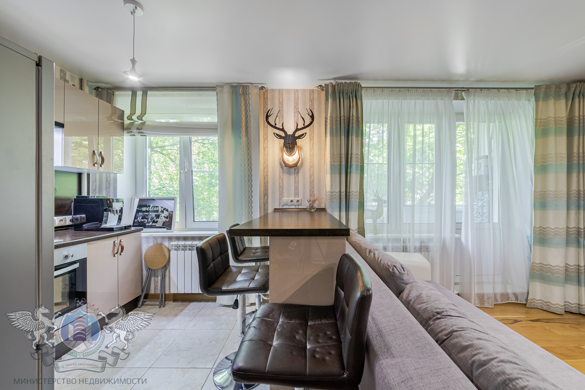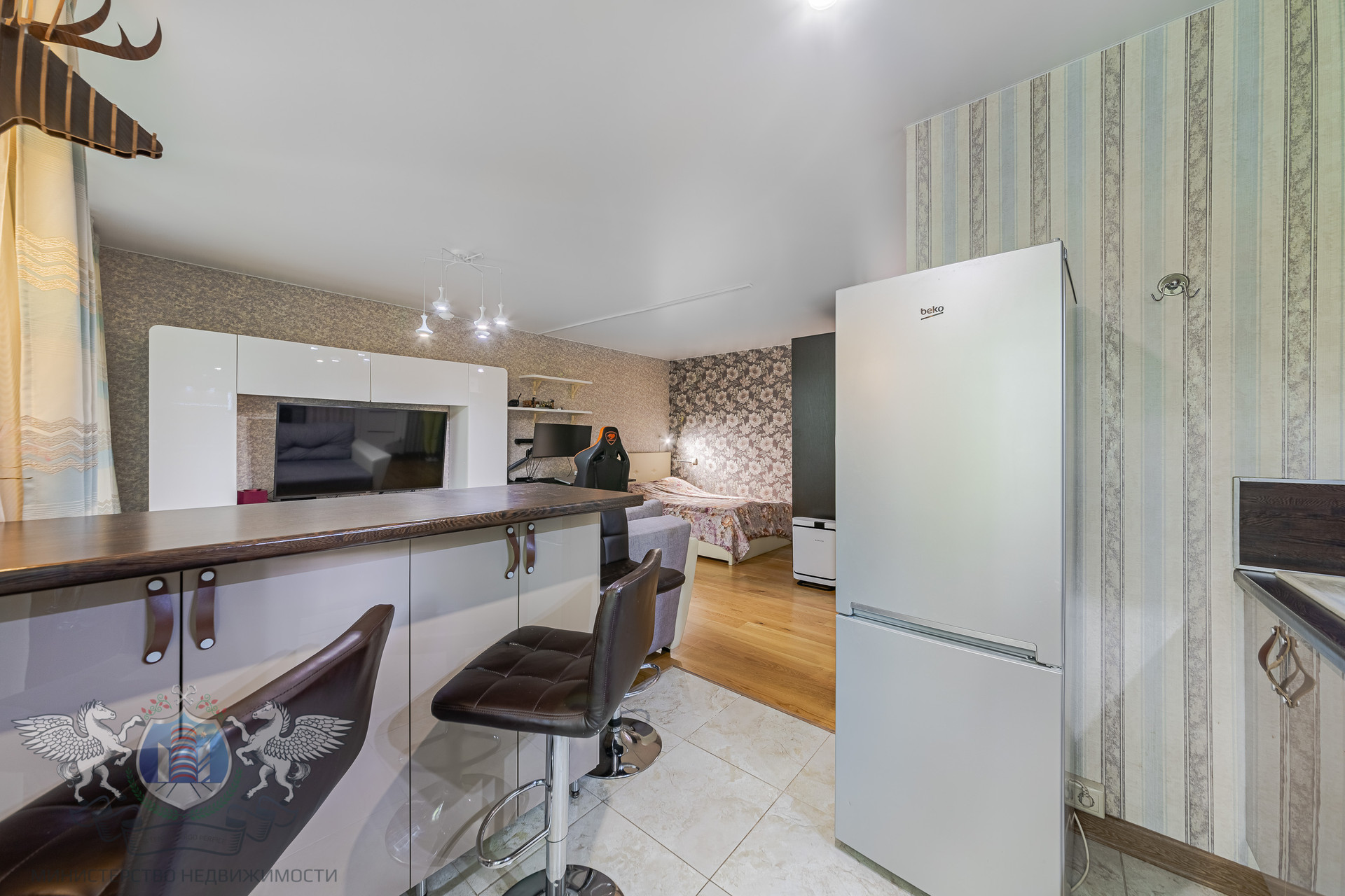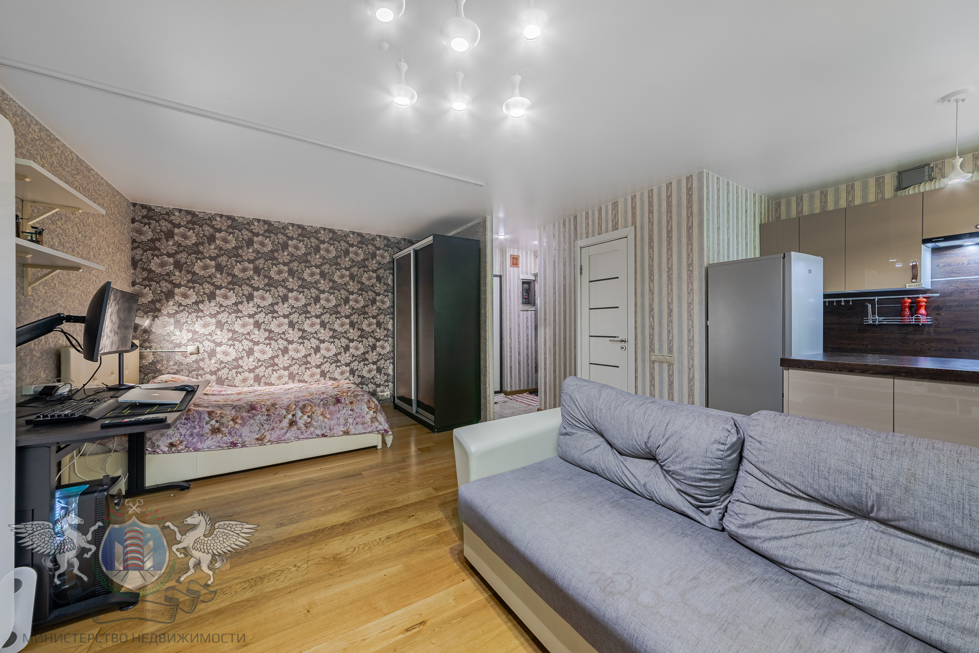 Планировка: квартира студийного плана, уютная кухня, гостиная с выходом на балкон, зона для сна, функциональный коридор, совмещенный санузел. В квартире сделан качественный ремонт, выровнены стены и полы, натяжные потолки, качественная электрика и сантехника, санузел в плитке, пластиковые окна, биметаллические радиаторы отопления, застеклённый балкон, на полу ламинат и плитка, система хранения в коридоре, надёжная входная дверь.