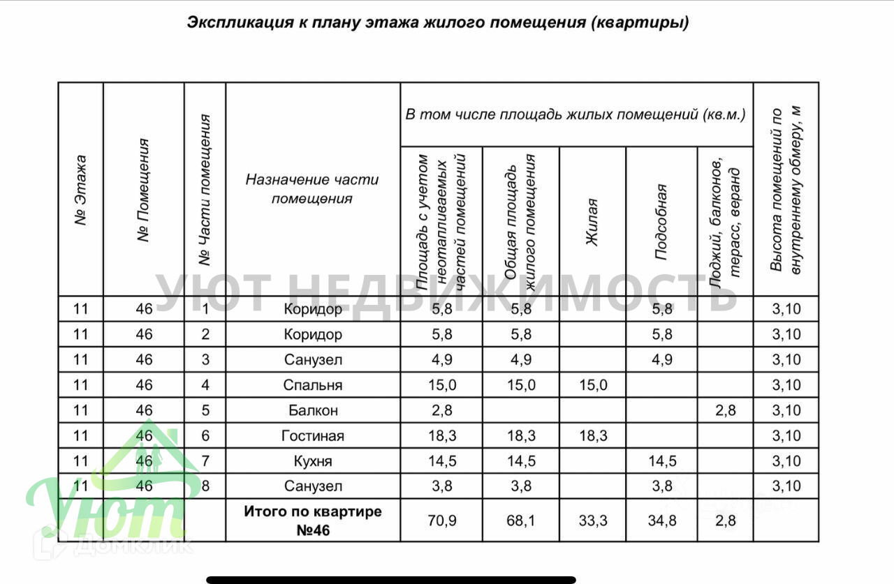 Общая площадь 70.9 м2