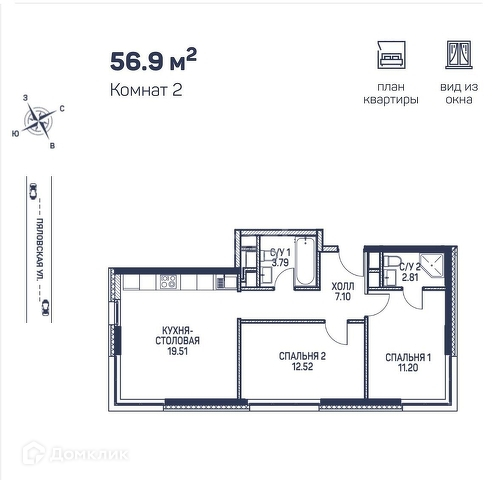 Общая площадь 56.9 м2
