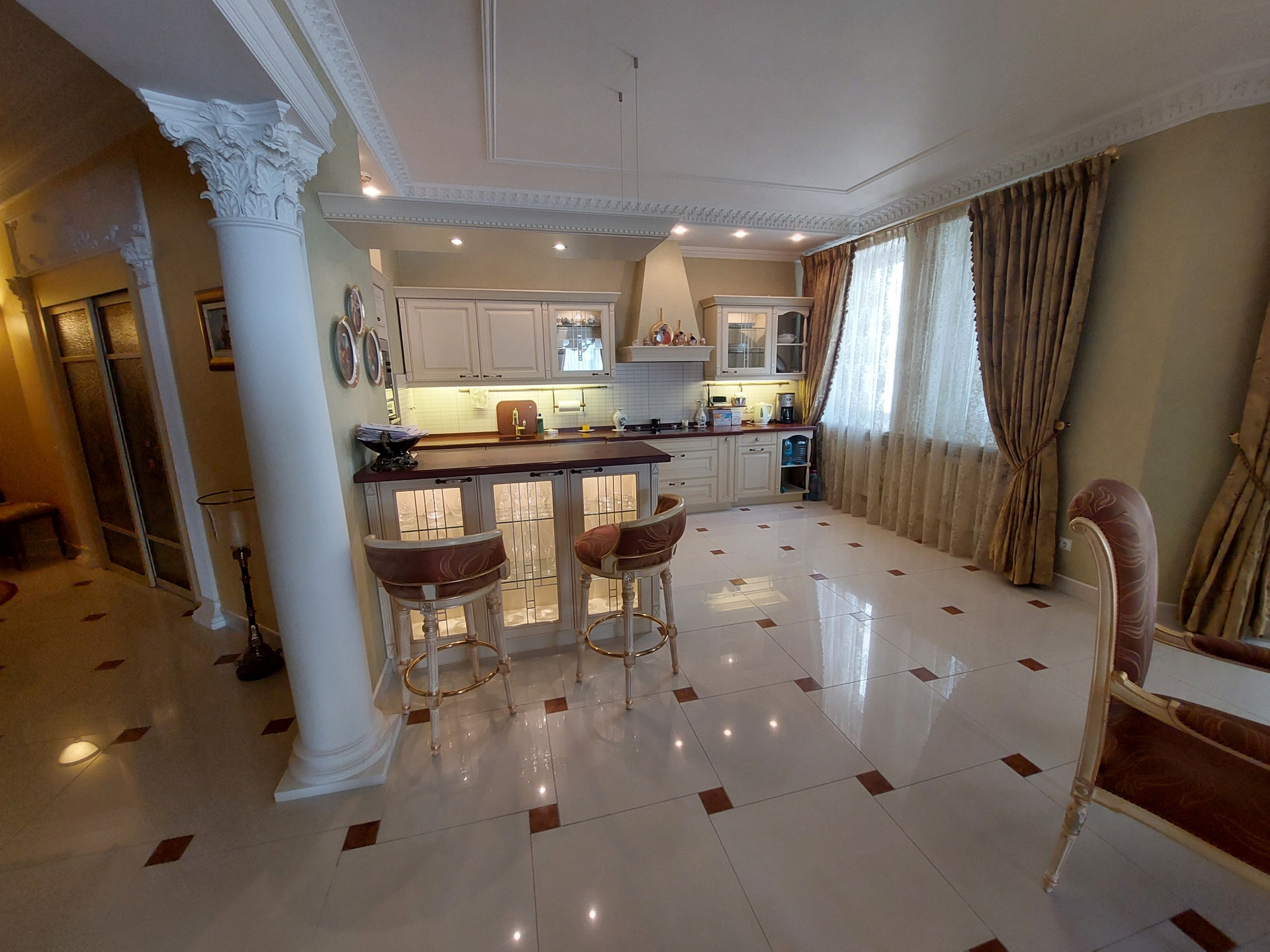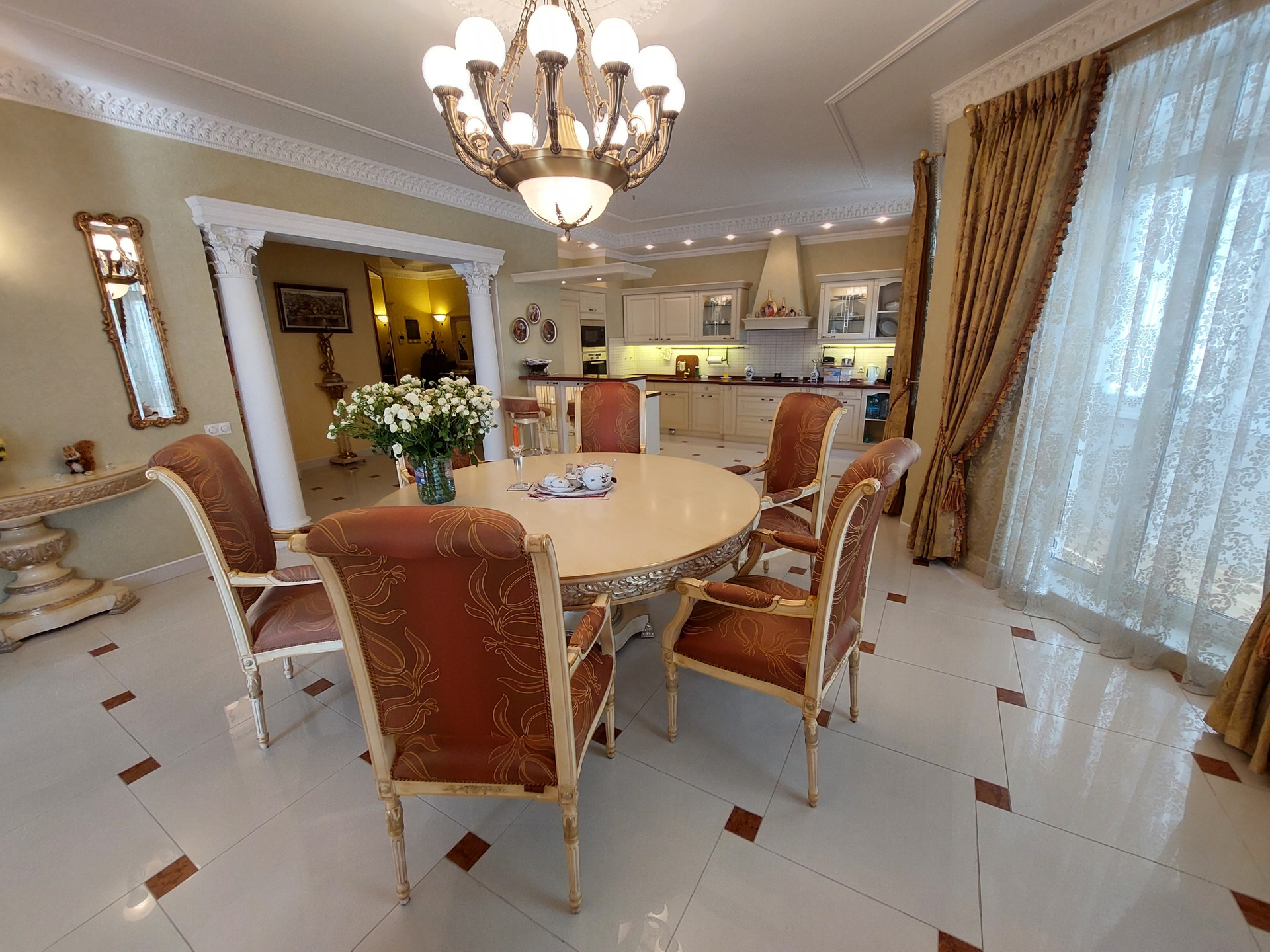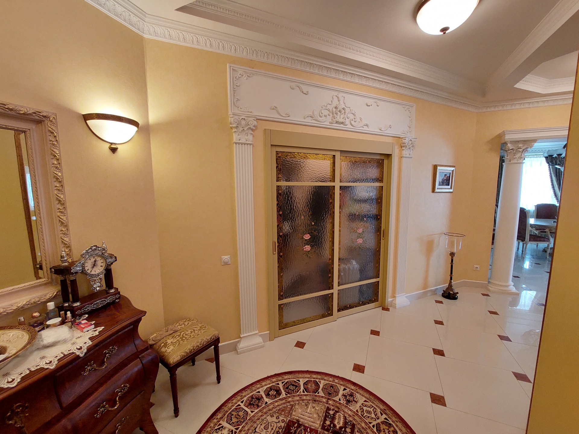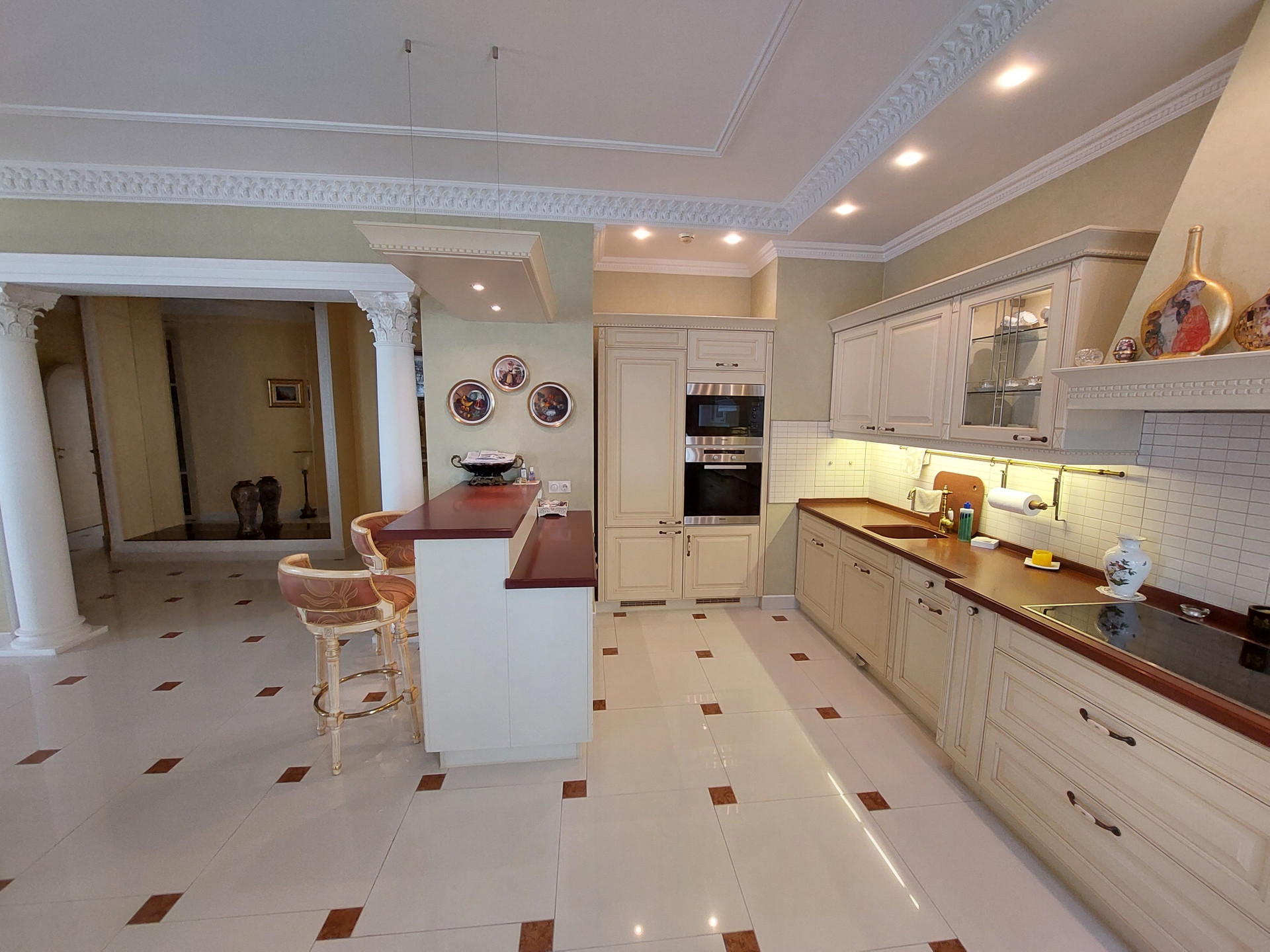 Дизайнерский проект из качественных материалов (гранит, оникс, тик, испанская плитка, итальянская сантехника, лепнина и колонны из гипса, межкомнатные двери из массива дерева, итальянский паркет - массив дуба, мрамор).