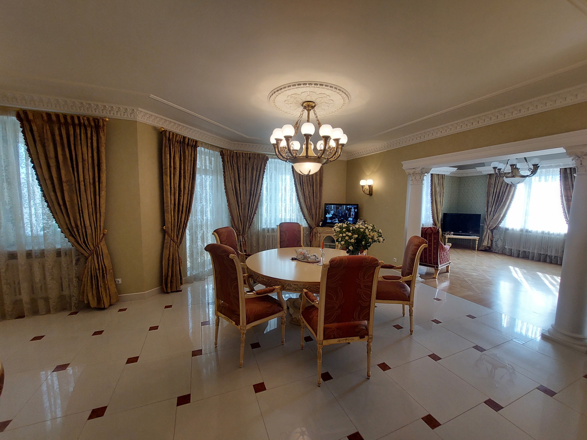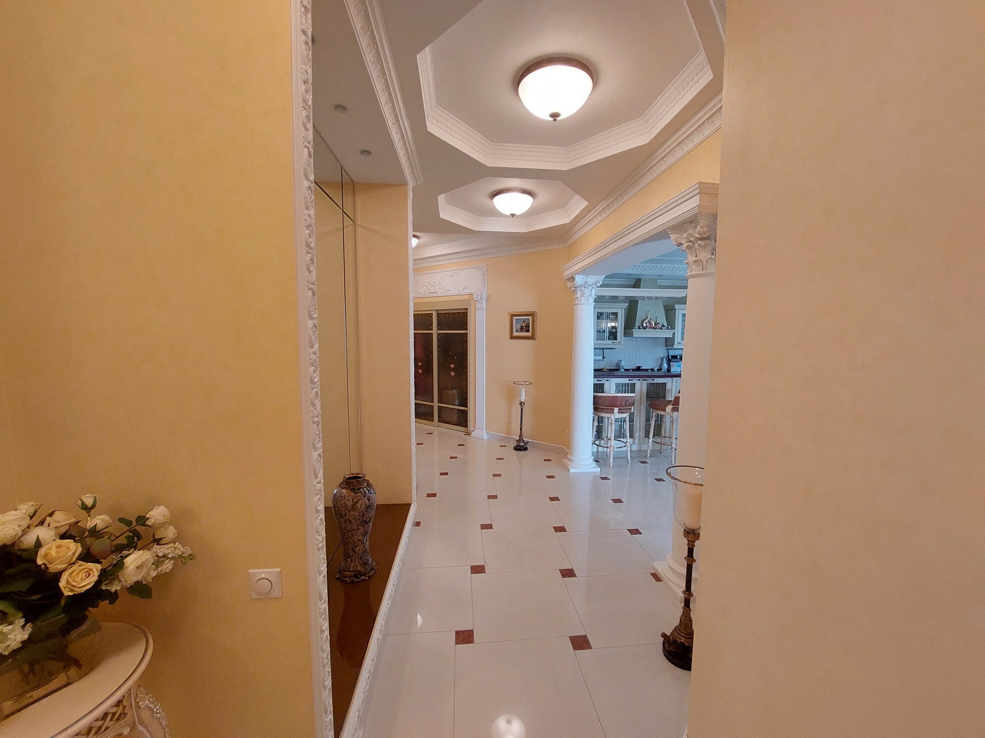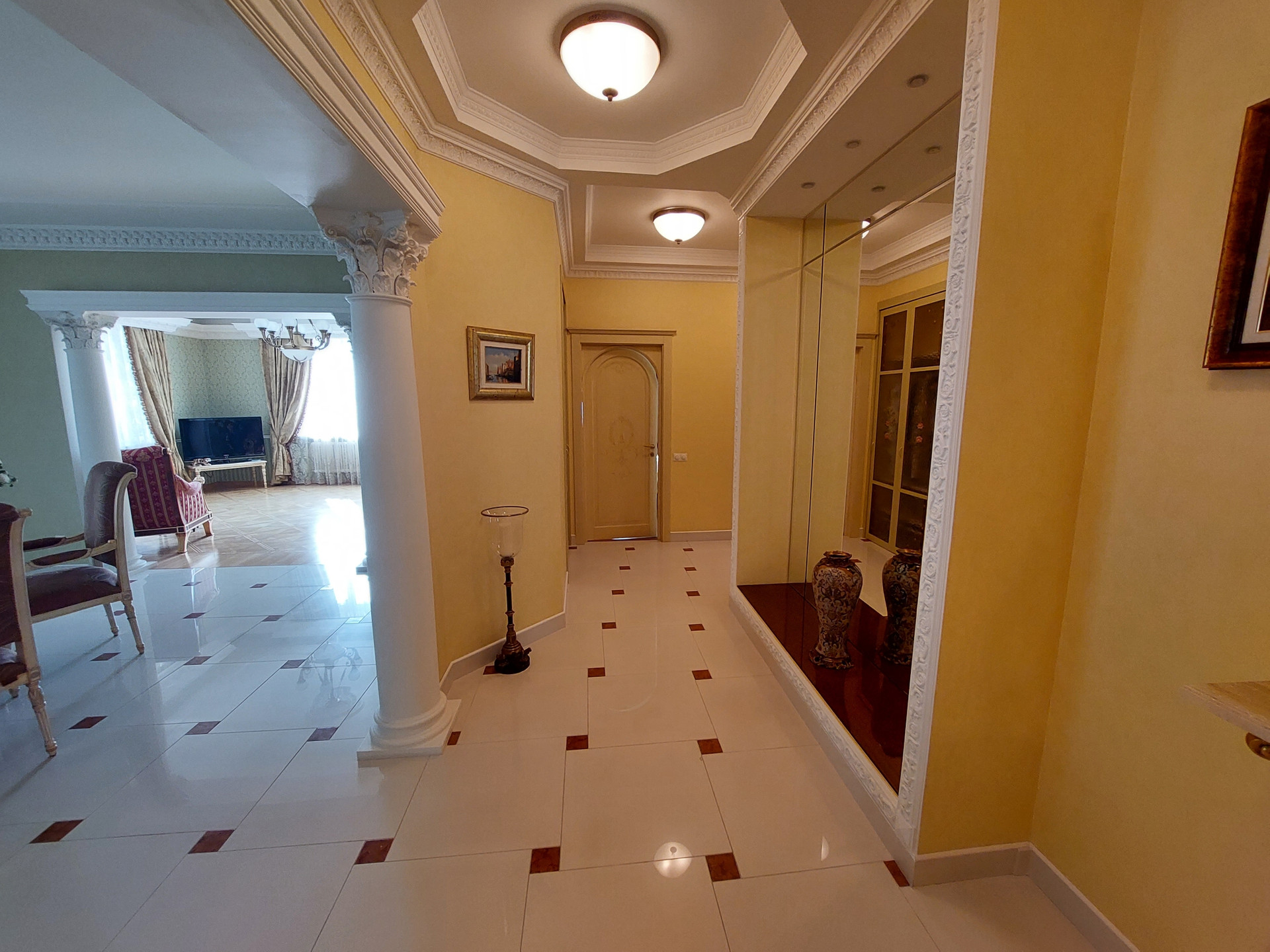 Дизайнерский проект из качественных материалов (гранит, оникс, тик, испанская плитка, итальянская сантехника, лепнина и колонны из гипса, межкомнатные двери из массива дерева, итальянский паркет - массив дуба, мрамор).