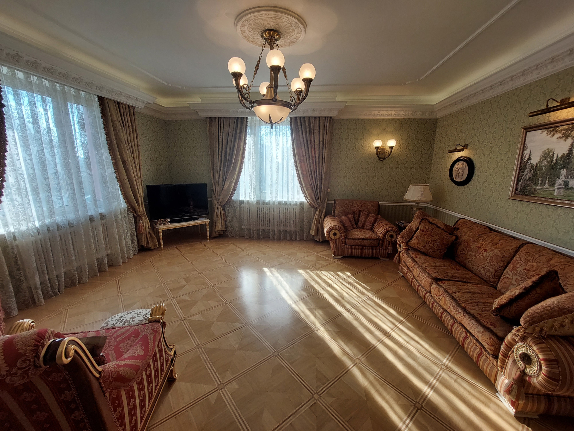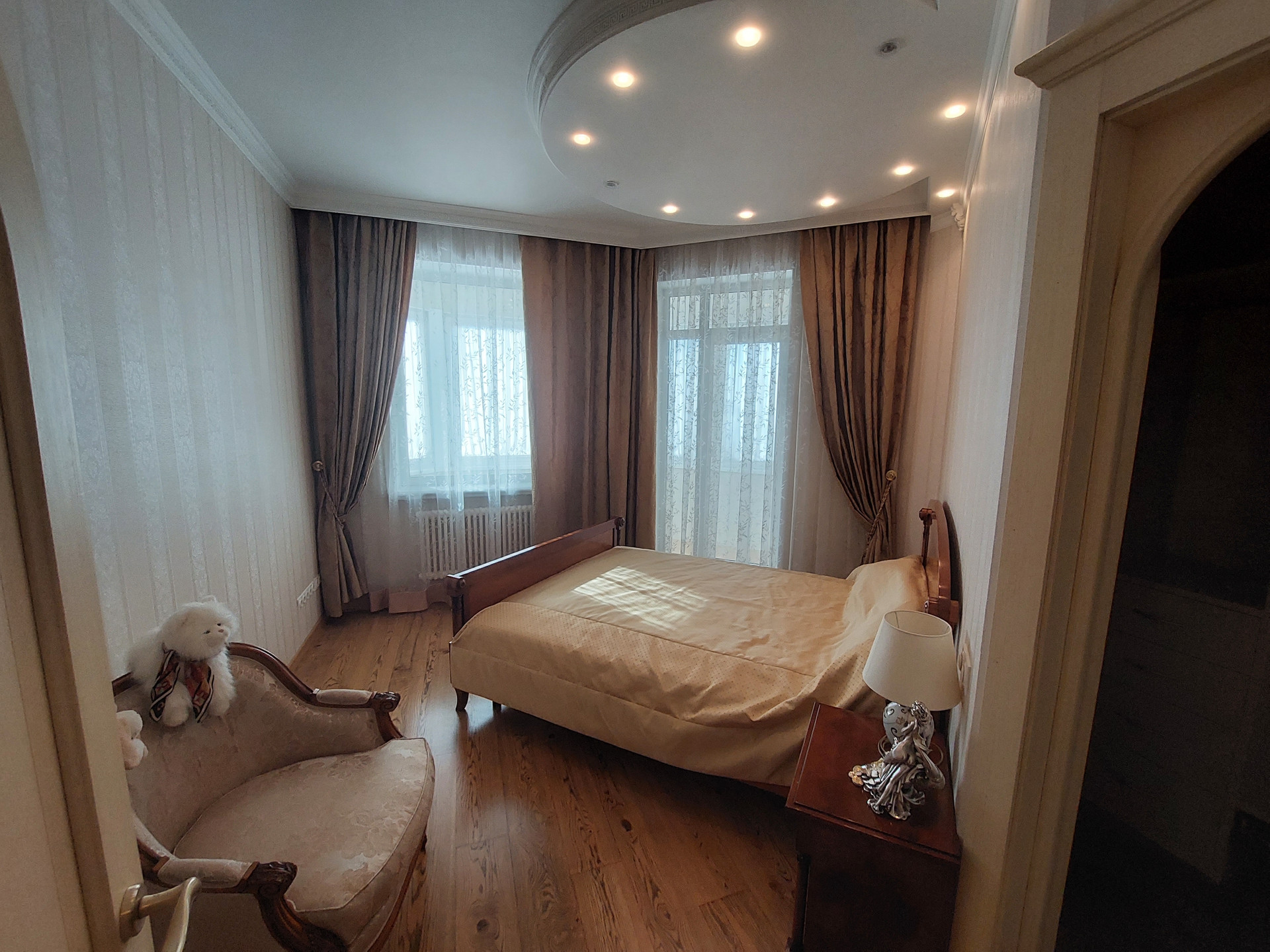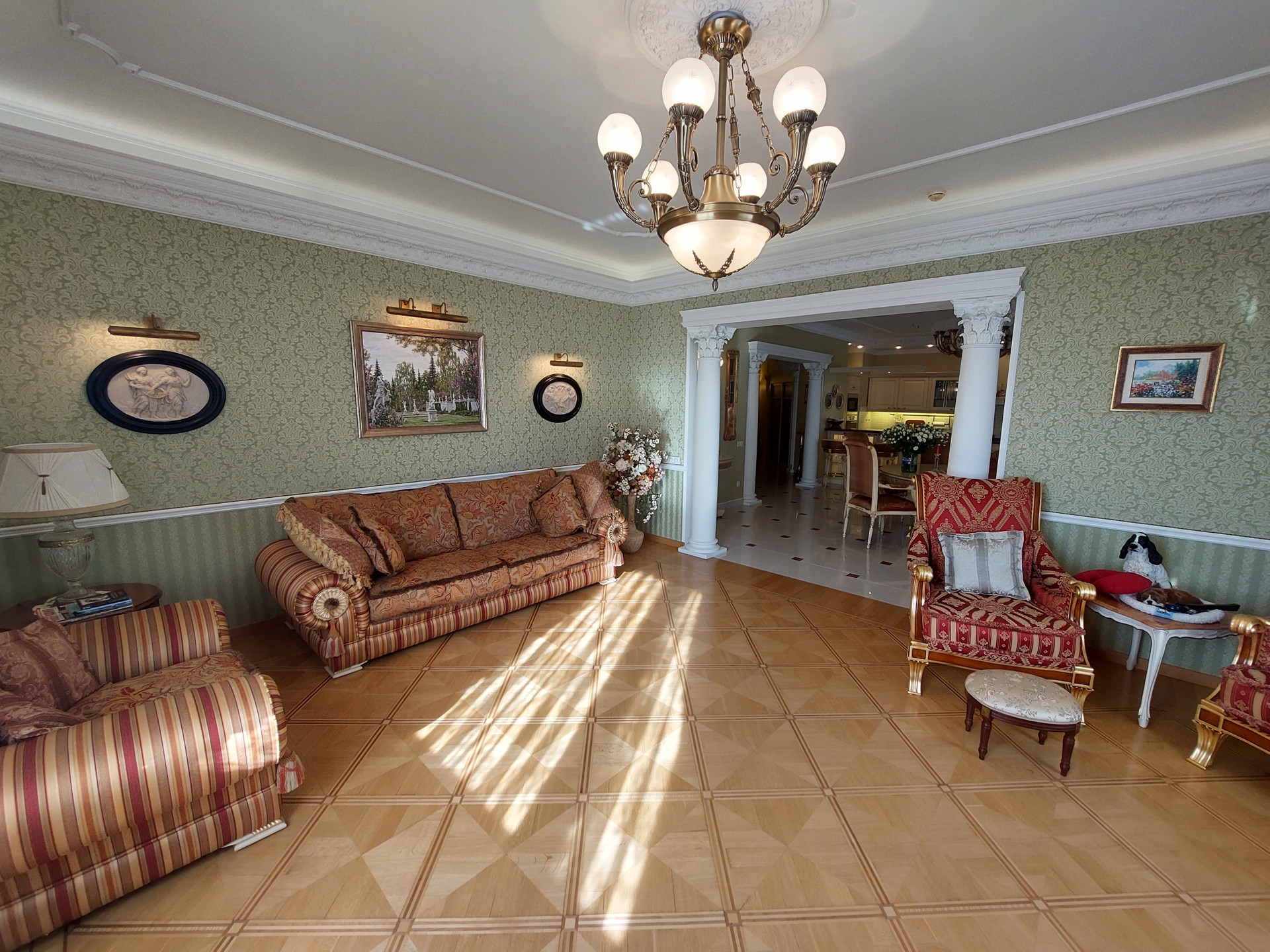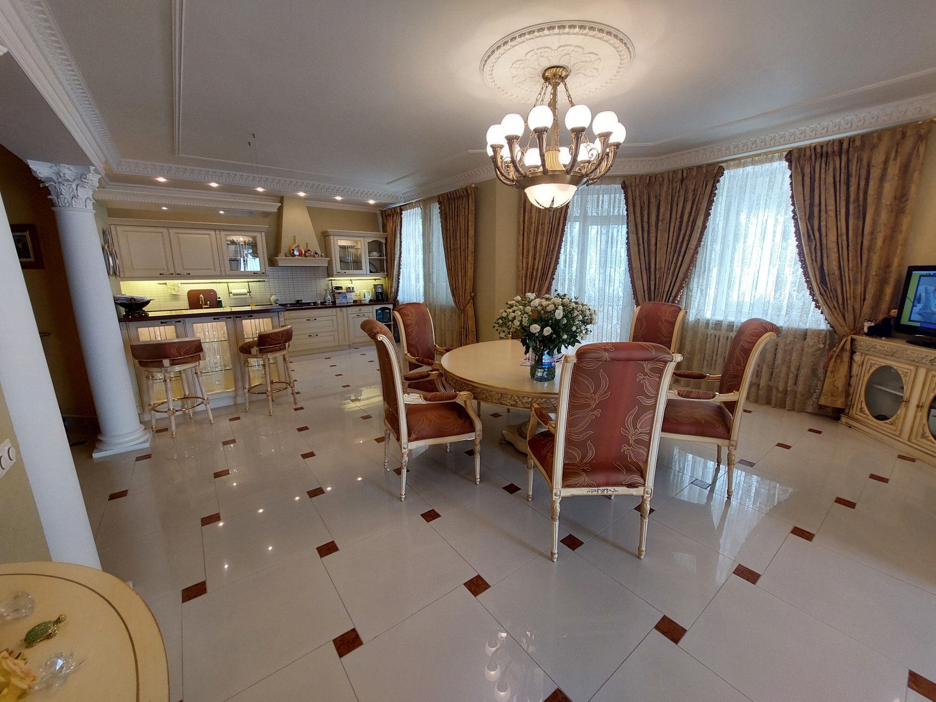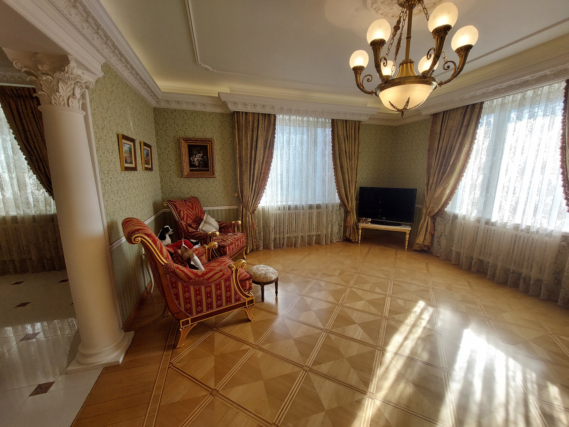 Две спальни, гостиная, большой зал - столовая, кухня, три санузла, три гардеробные, хозяйственный блок, 2 большие застекленные утепленные лоджии.