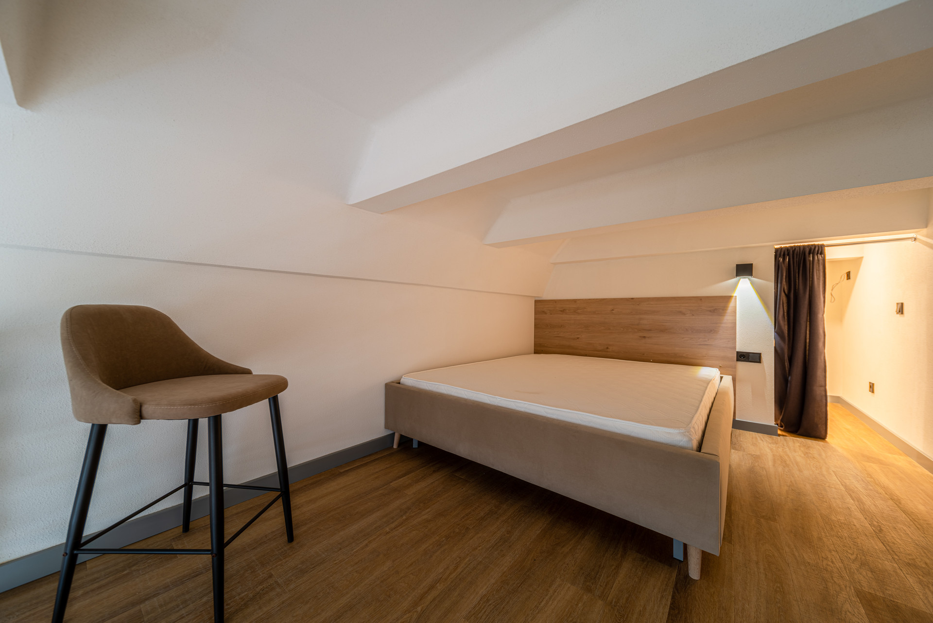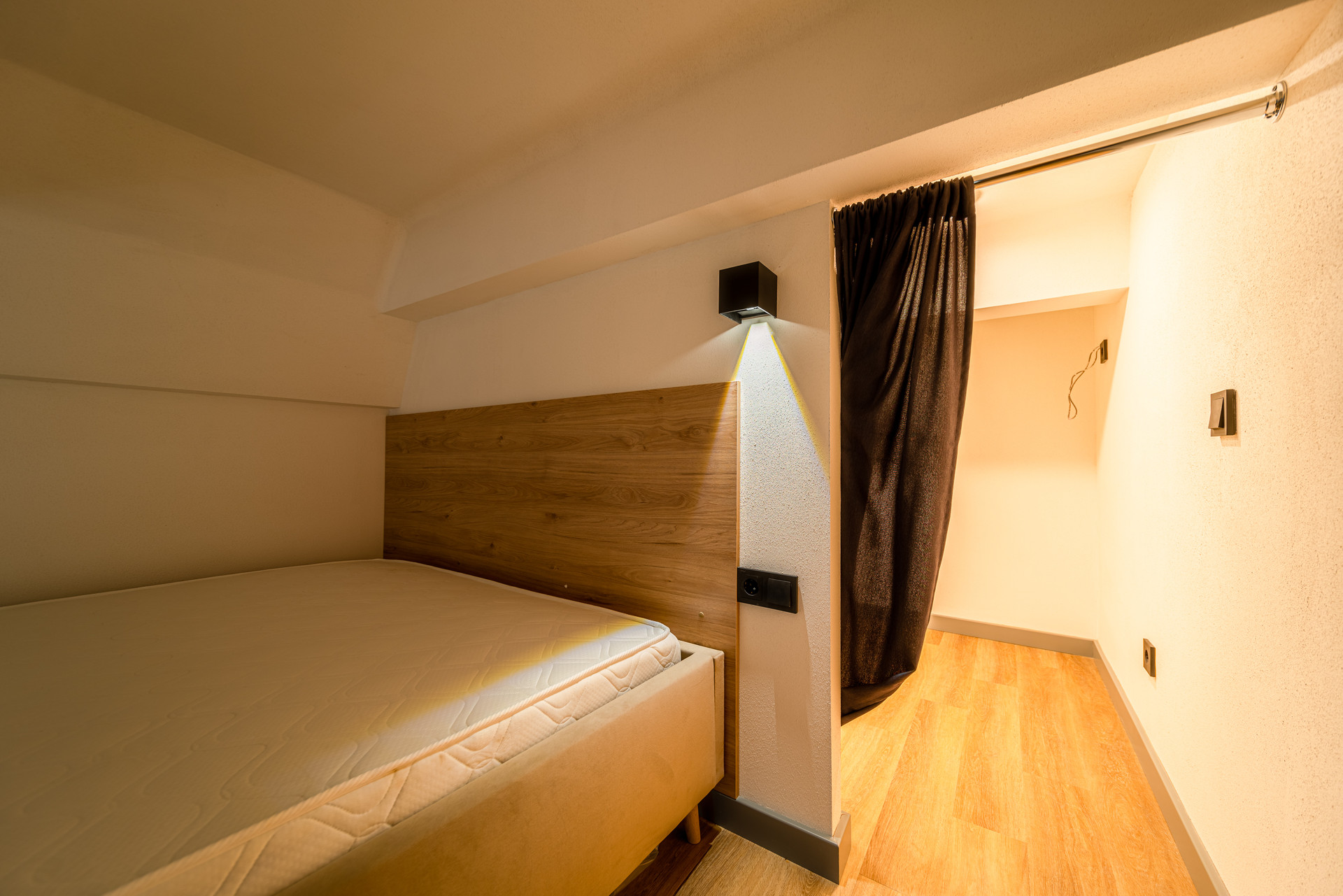 На втором уровне( можно встать во весь рост) спальная кровать с комодом для личных вещей, есть место под рабочую зону. Один из больших плюсов есть своя ГАРДЕРОБНАЯ, можно сделать полностью под себя!
