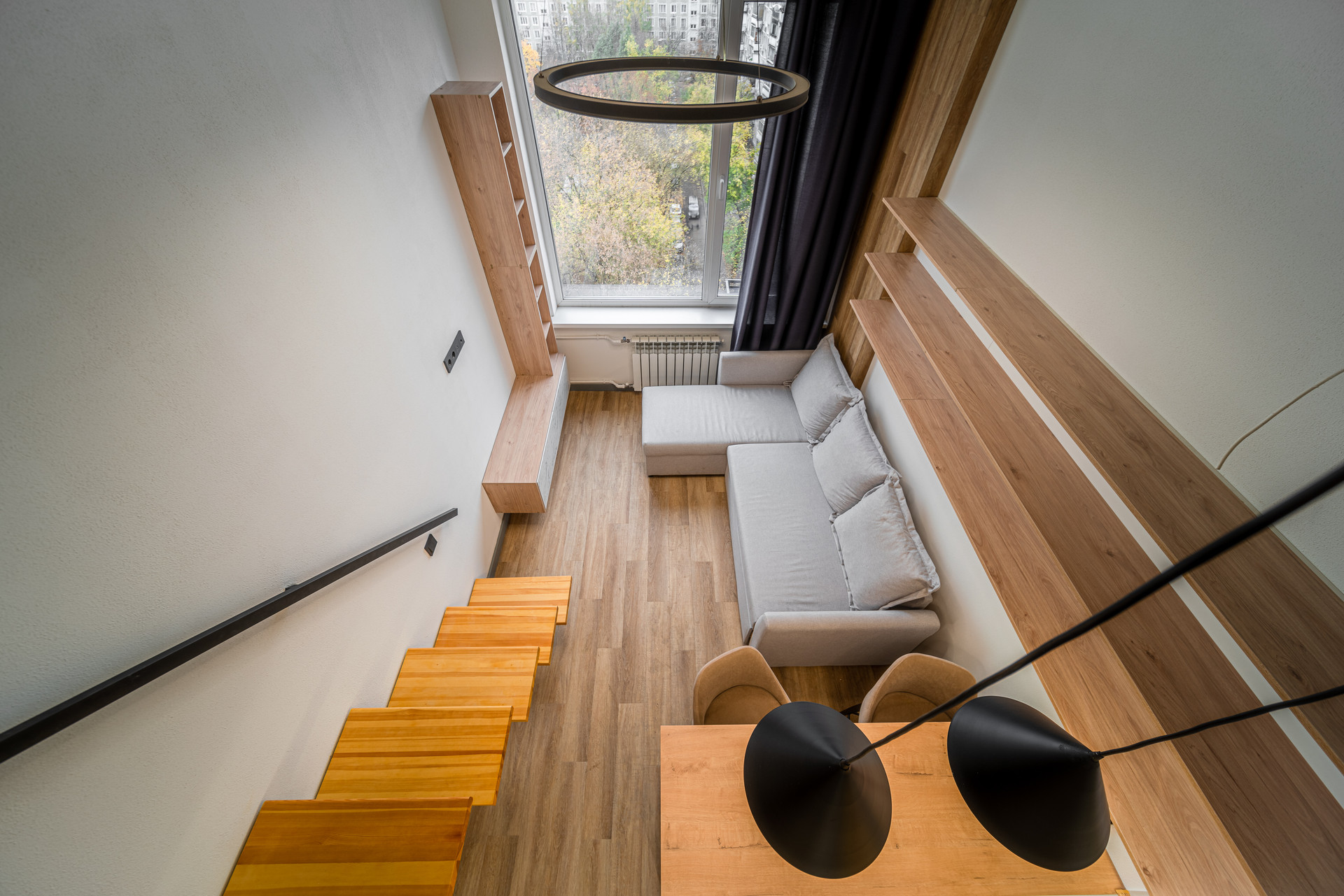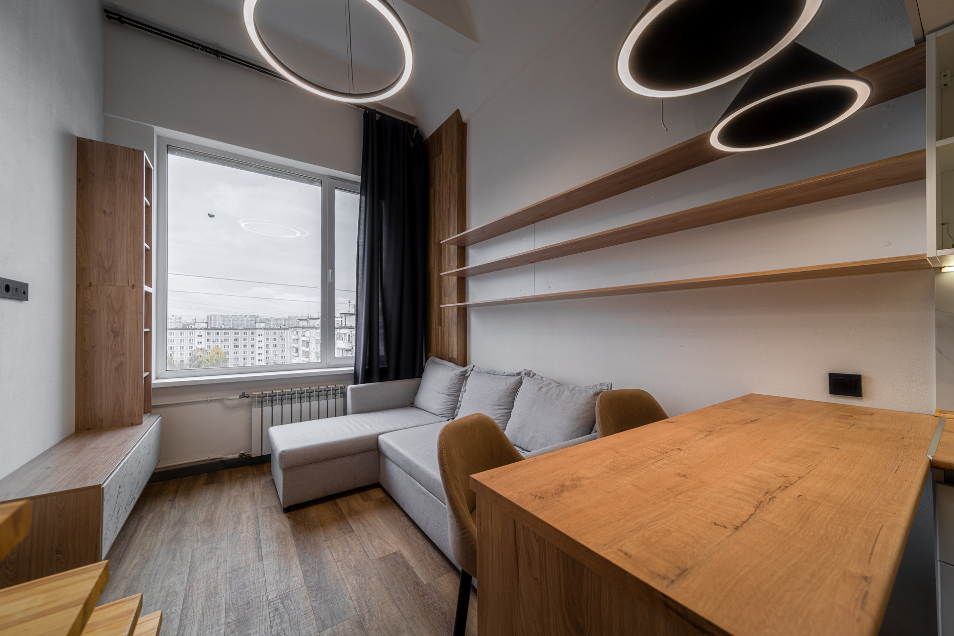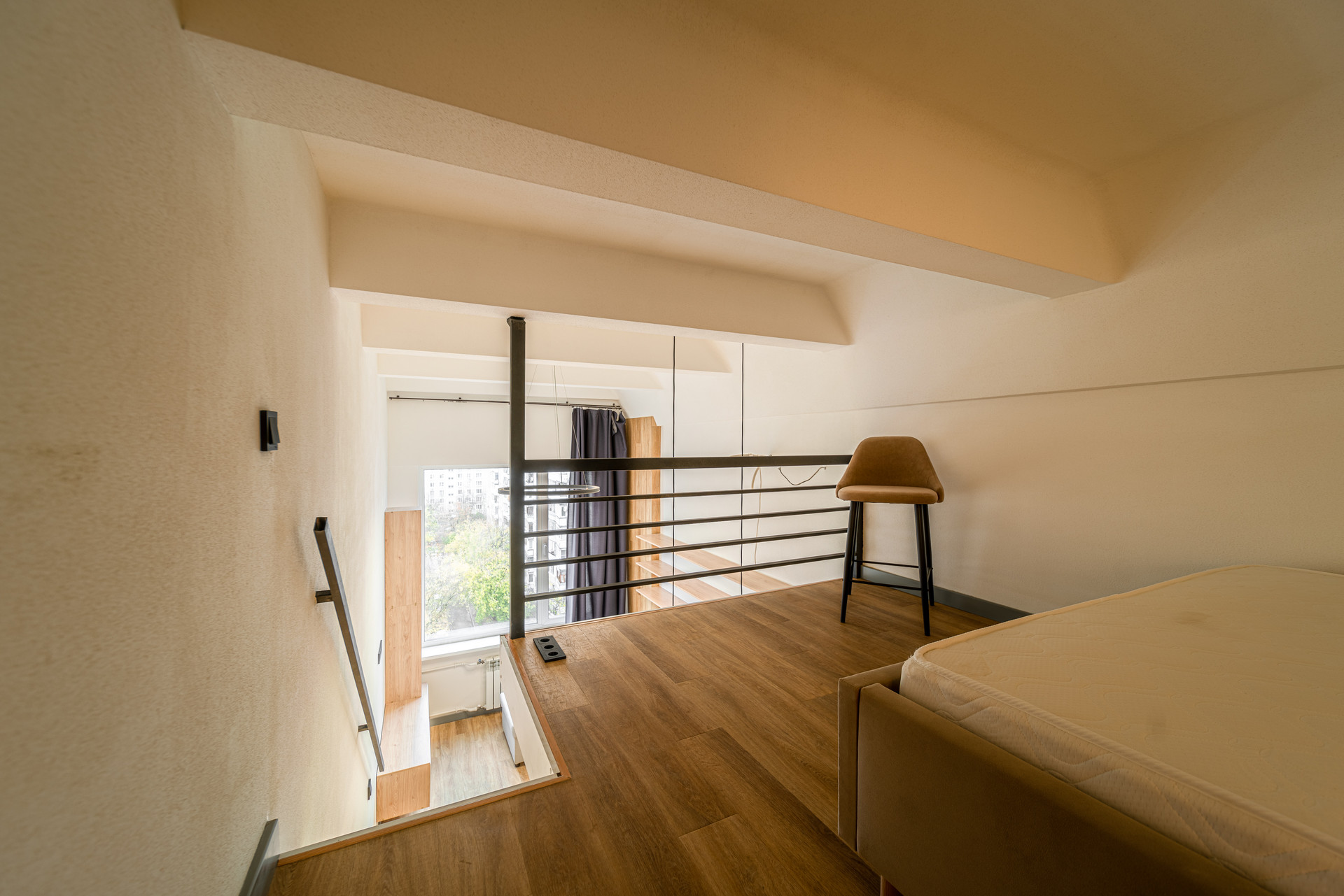 В апартаменте светло и просторно. Окно выходит на тихий, зелёный двор и светлое небо!