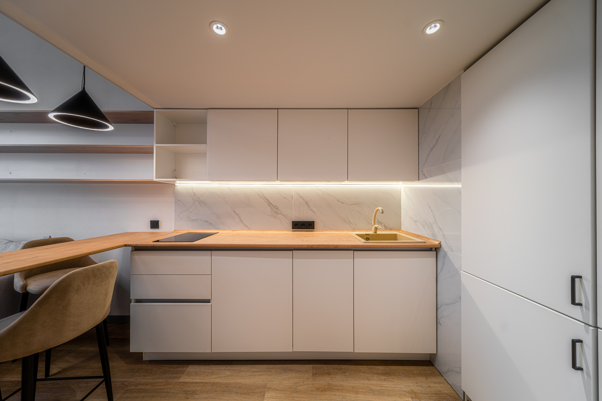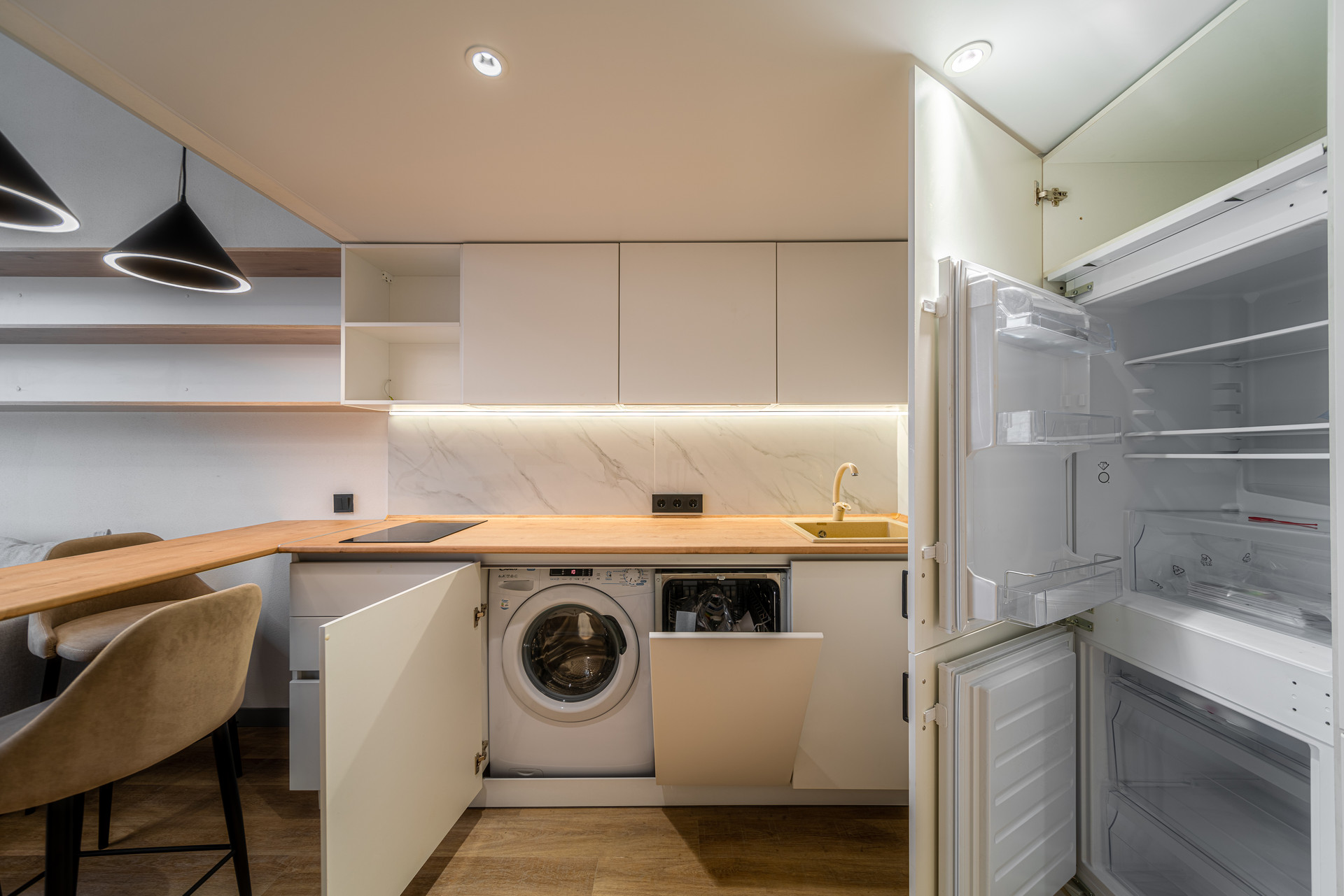 - продуманный до мелочей дизайнерский кухонный гарнитур со всей необходимой техникой( индукционная варочная панель посудомоечная машина, встроенный холодильник, стиральная машина