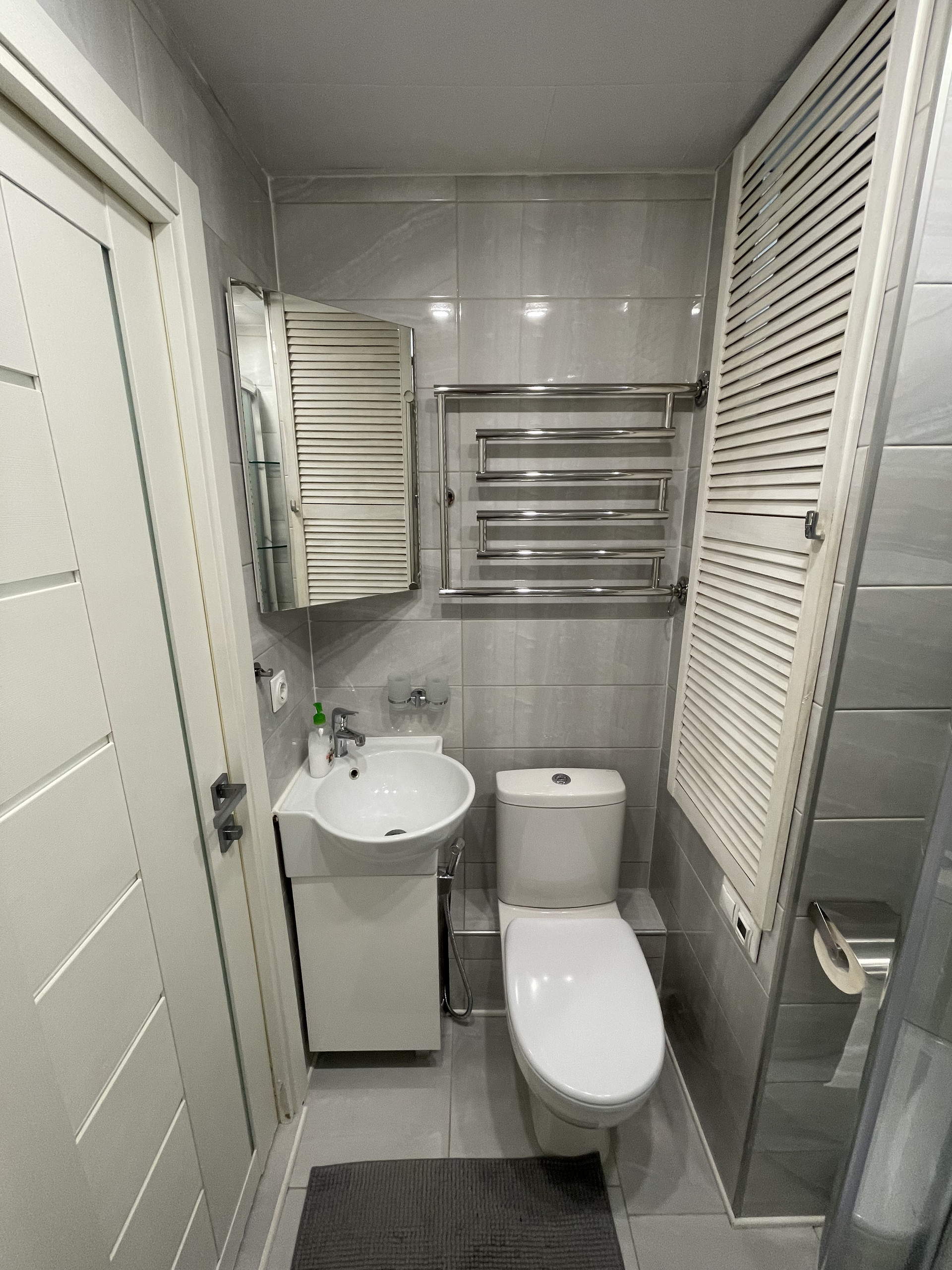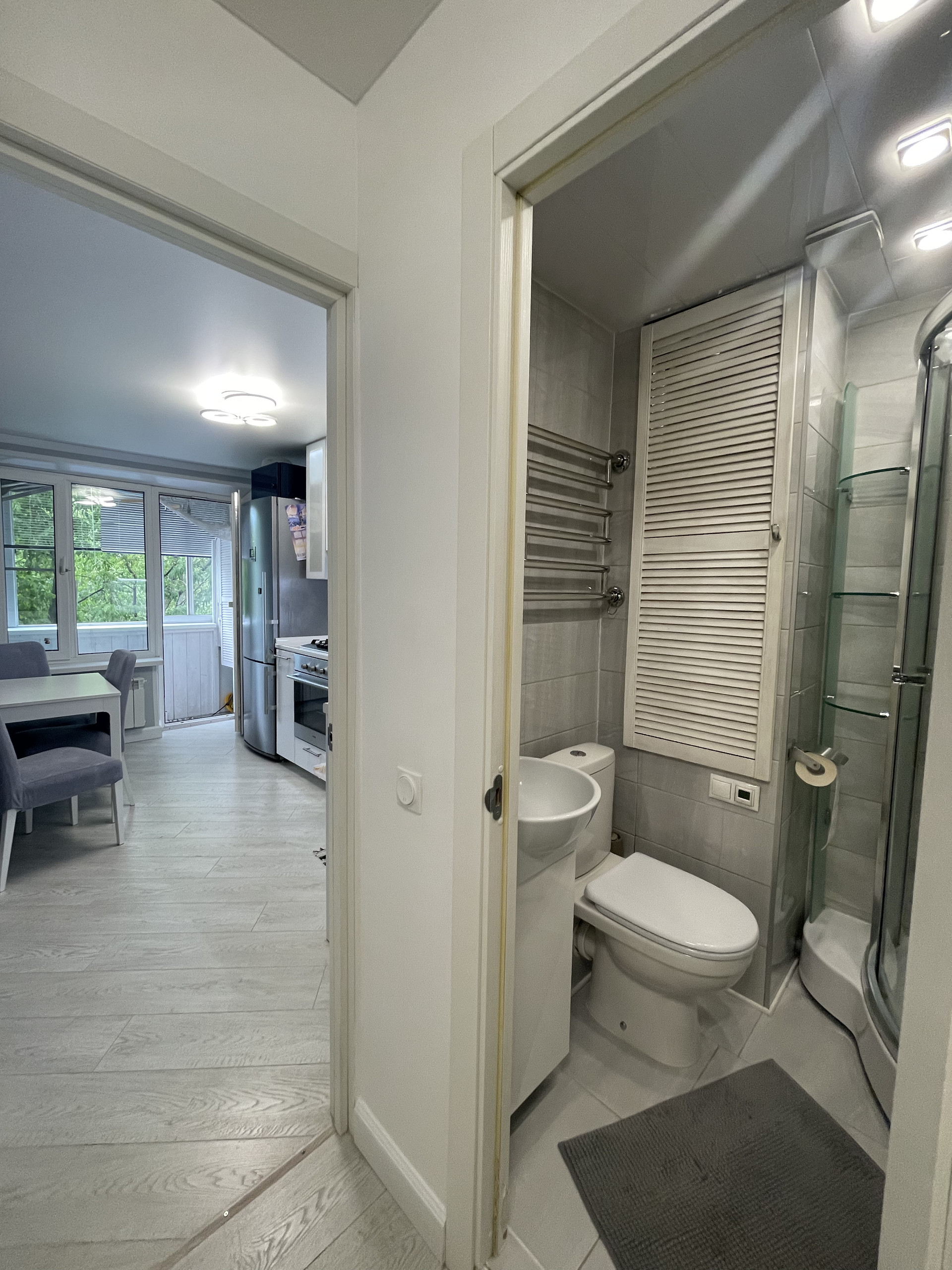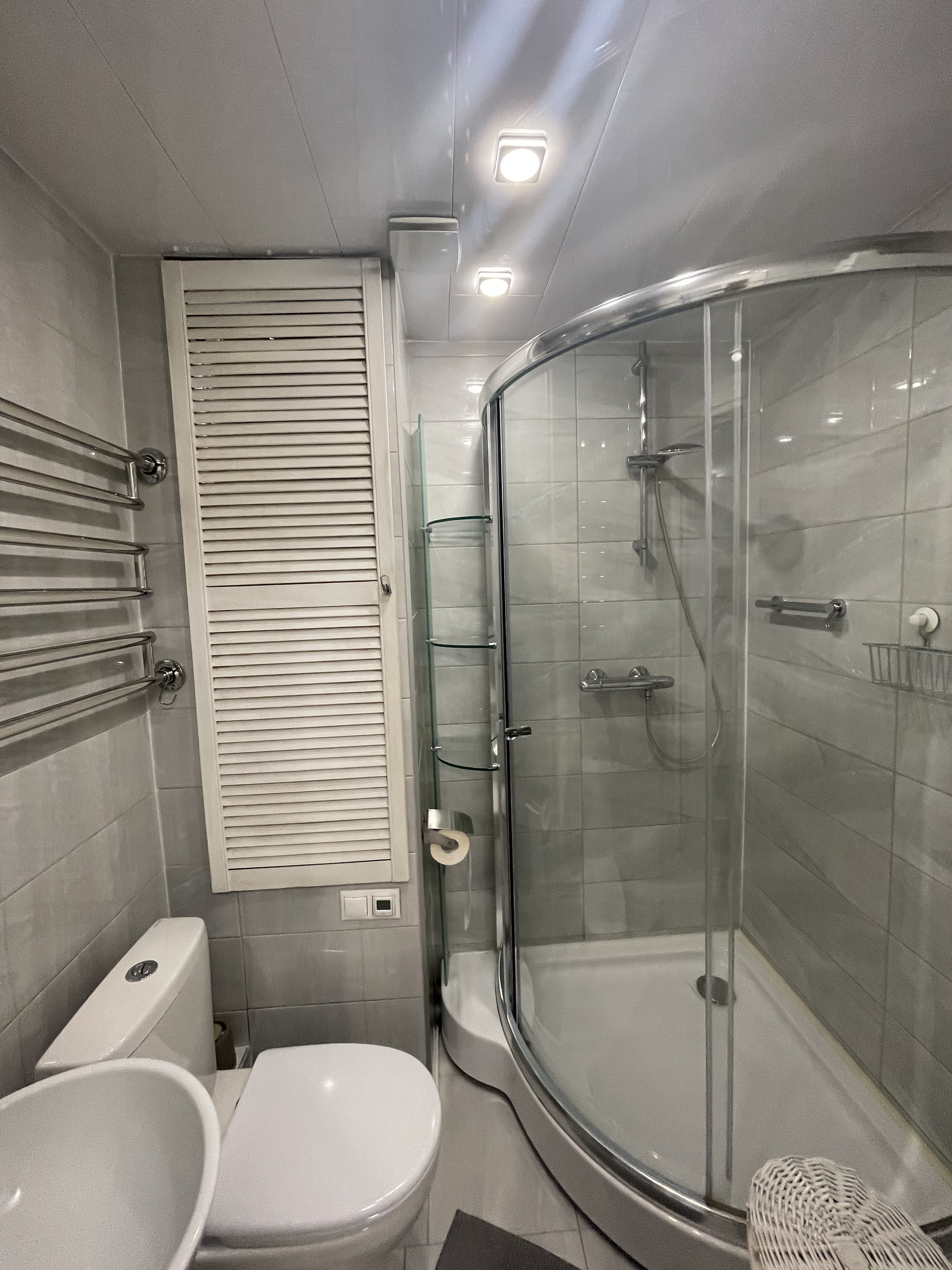 В ванной теплый пол, бойлер, система фильтрации воды, новые коммуникации. Итальянская душевая кабина, немецкие смесители Grohe.