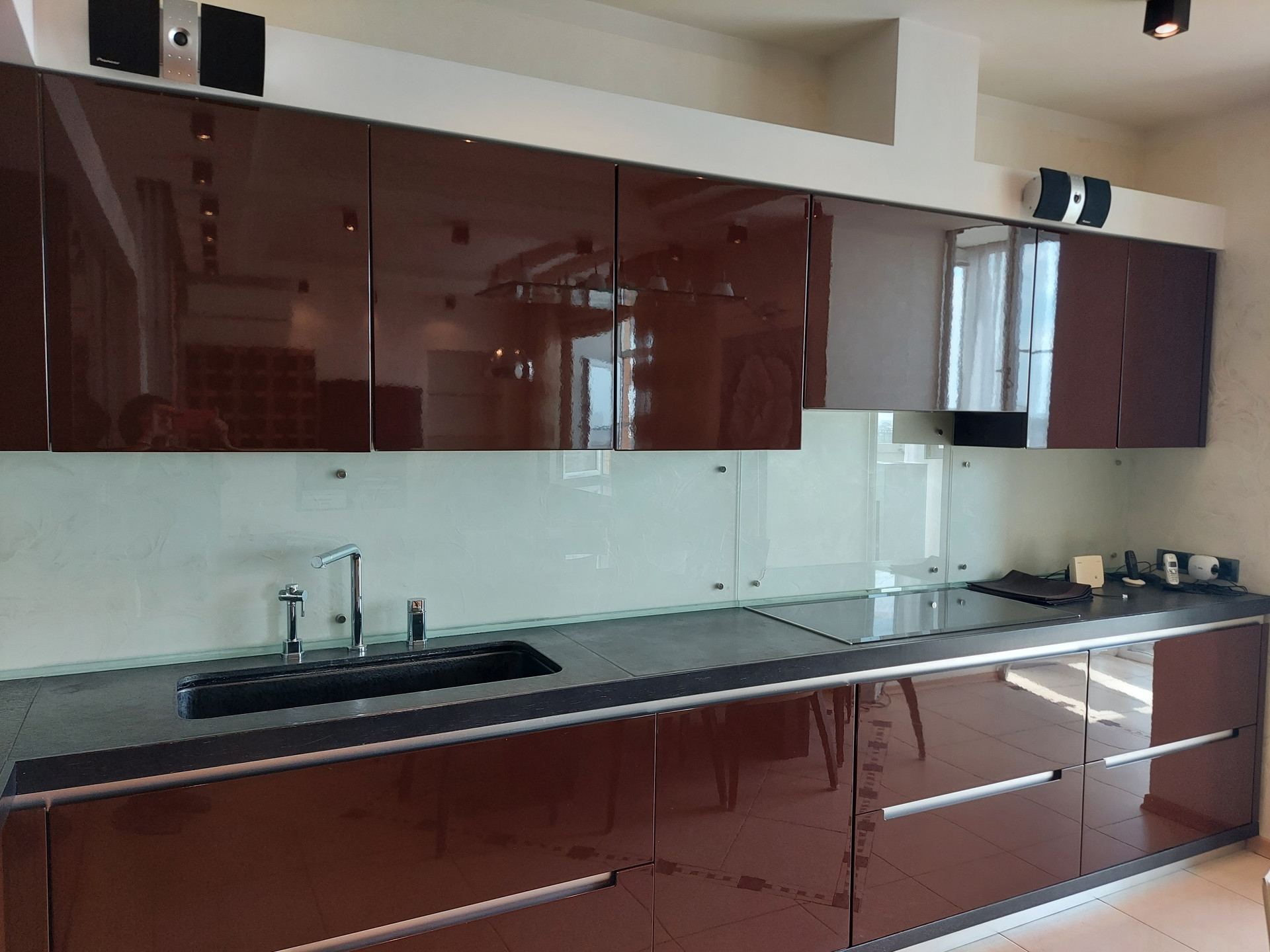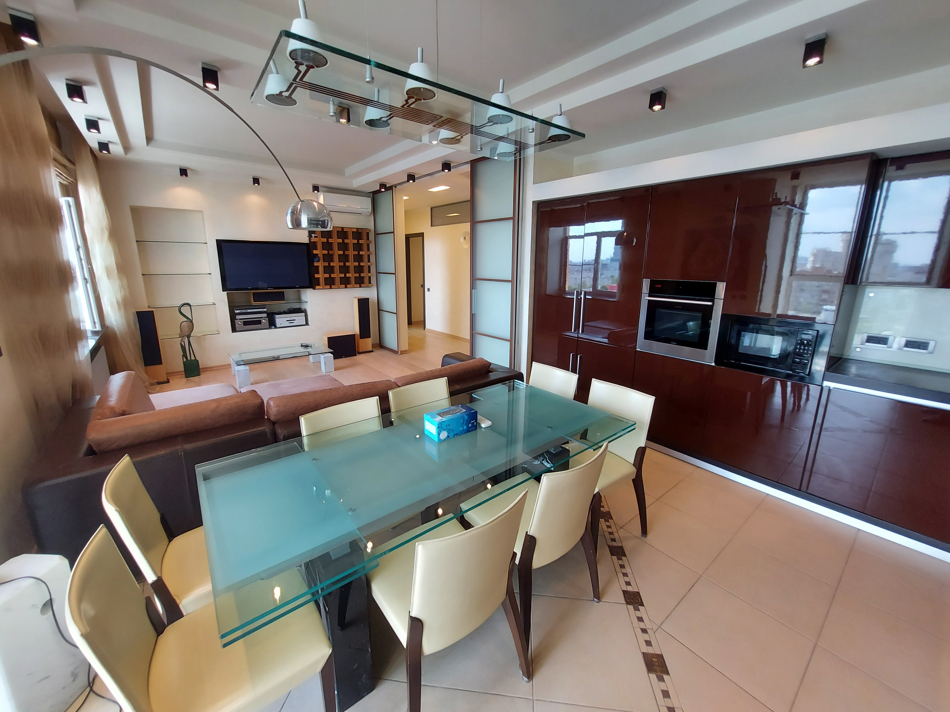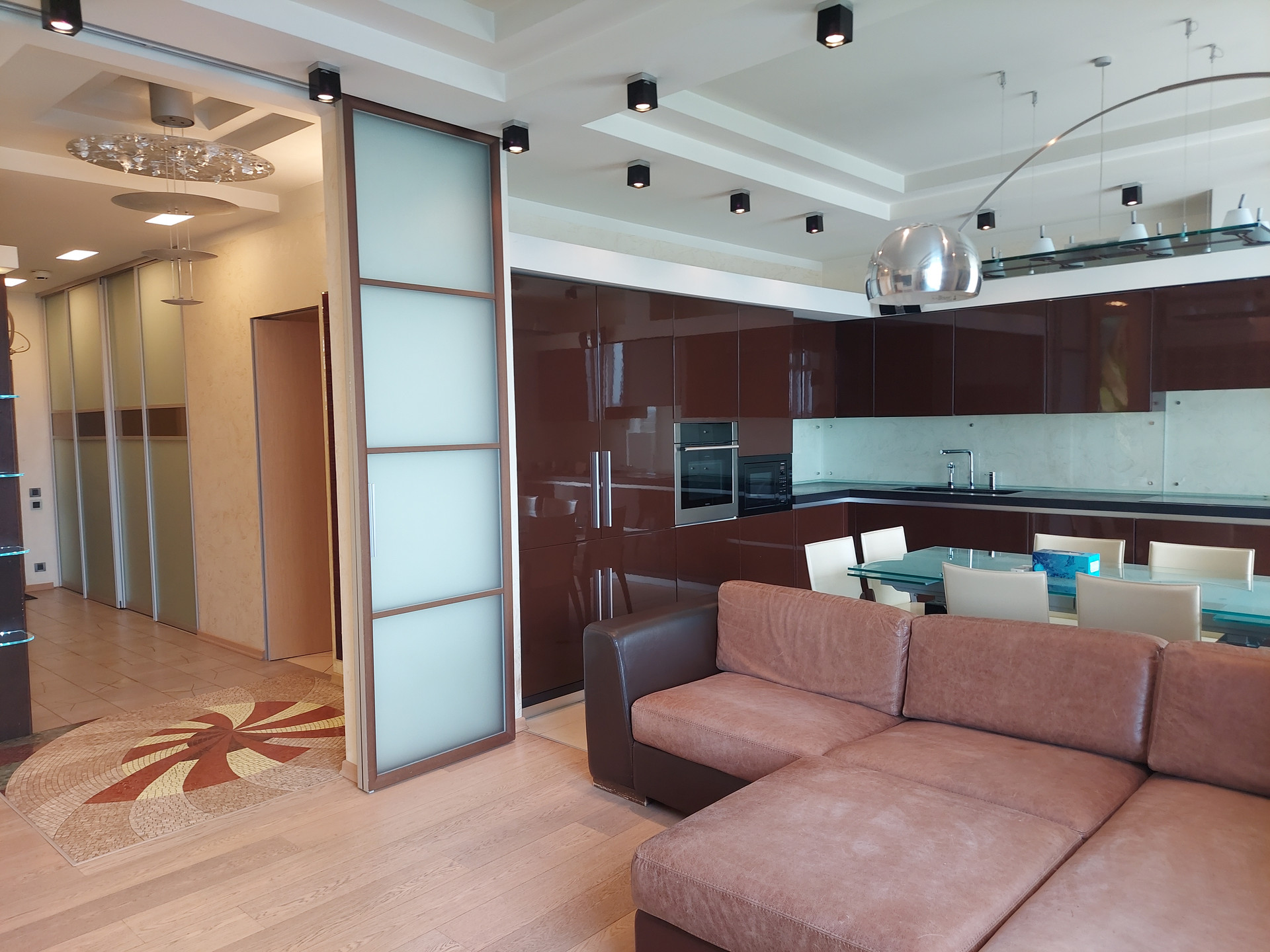 Просторная кухня-гостиная. В зоне кухни: кухонный гарнитур со встроенной техникой два 2х камерных холодильника Libherr, посудомоечная машина, духовой шкаф, микроволновка, 5ти конфорочная варочная панель, слайсер. В зоне гостиной: угловой кожаный диван и домашний кинотеатр.