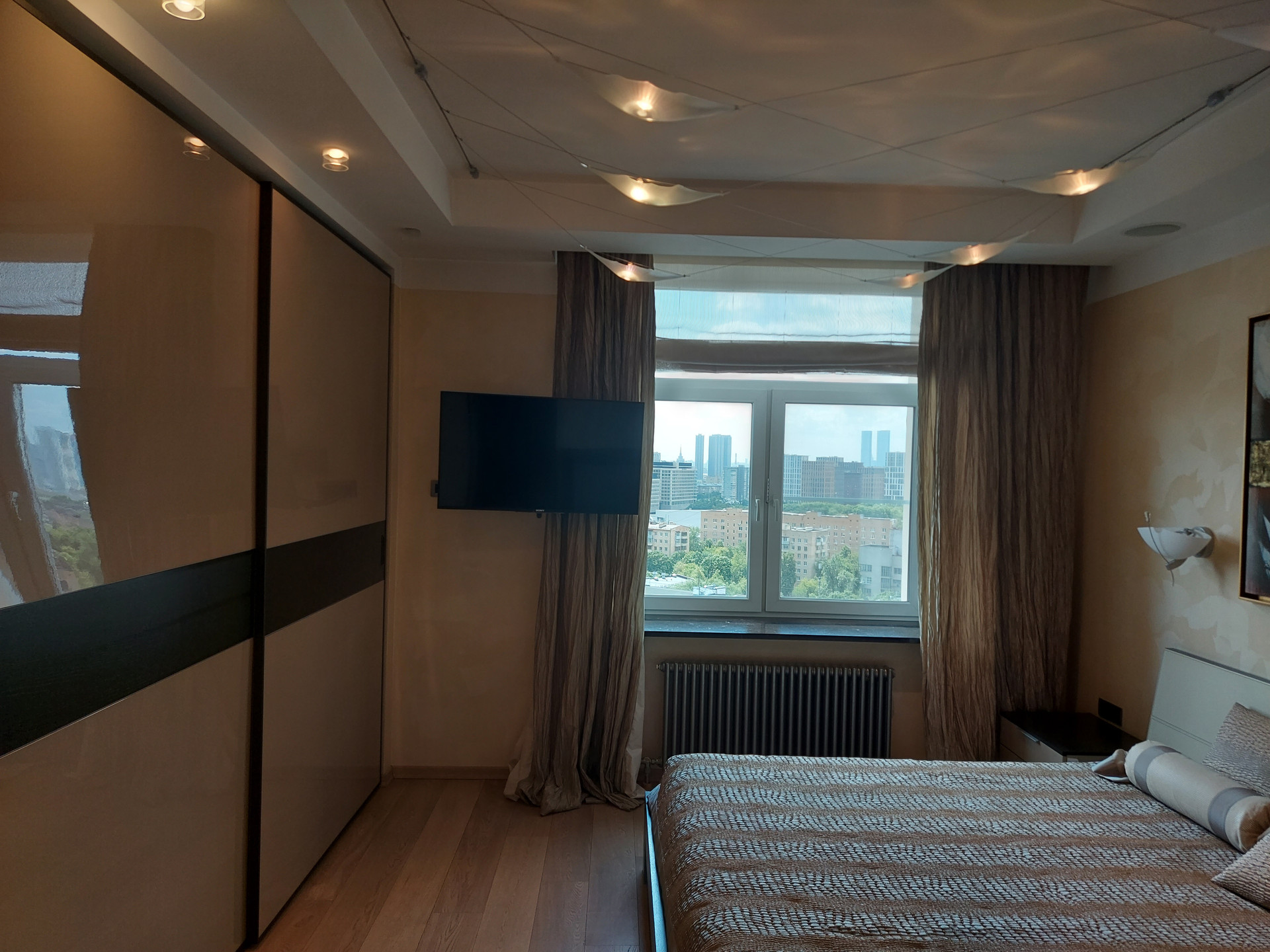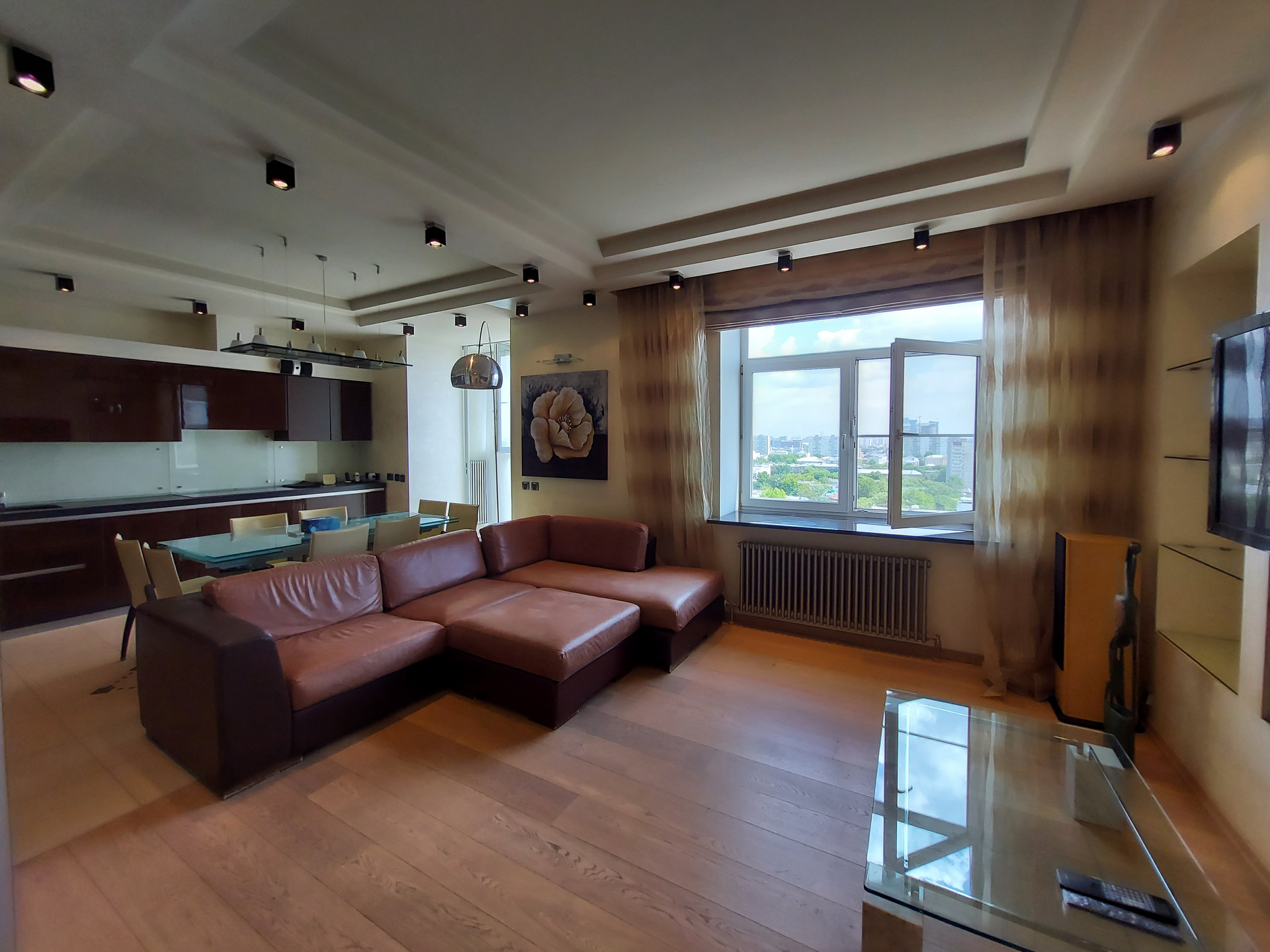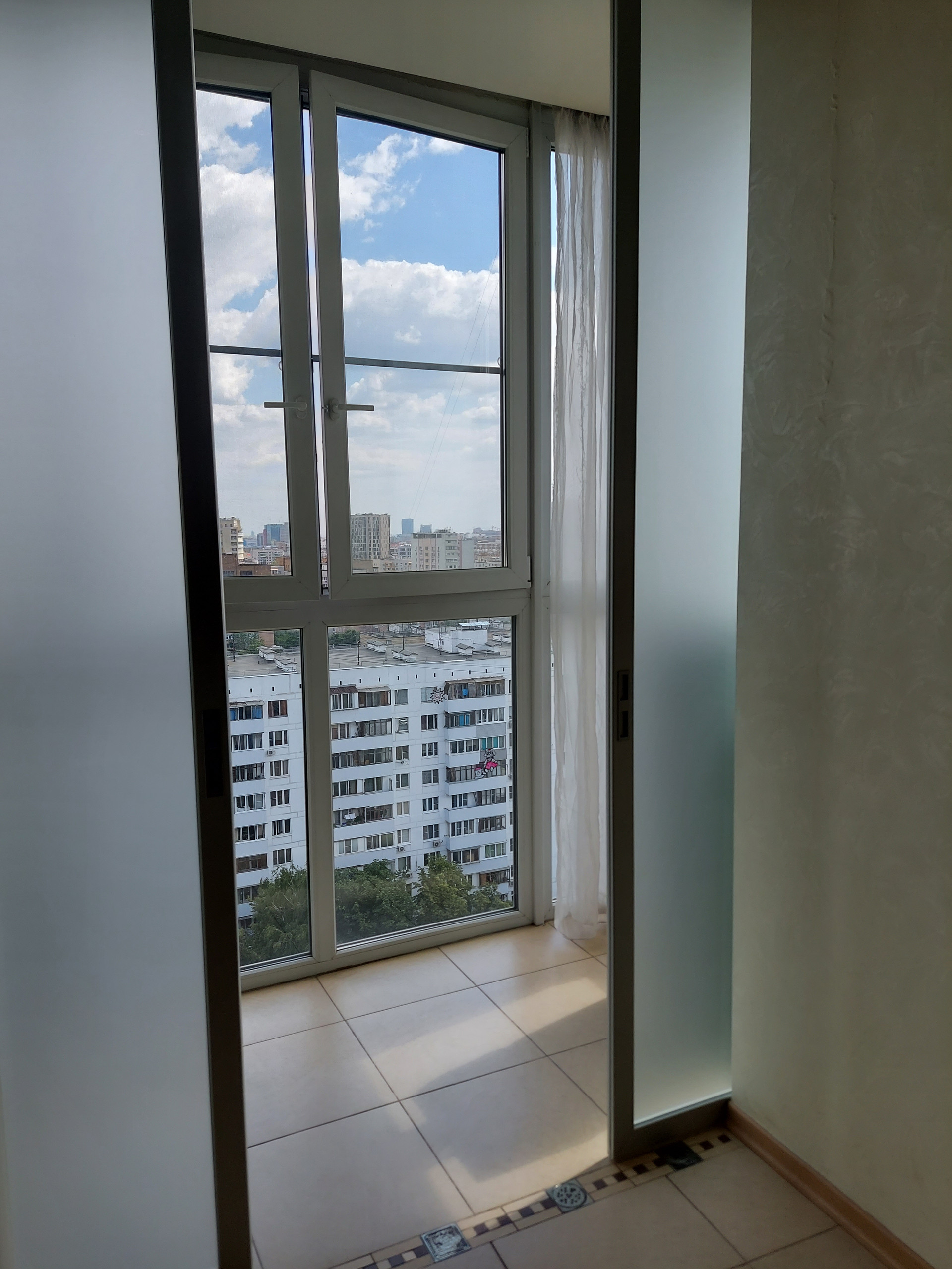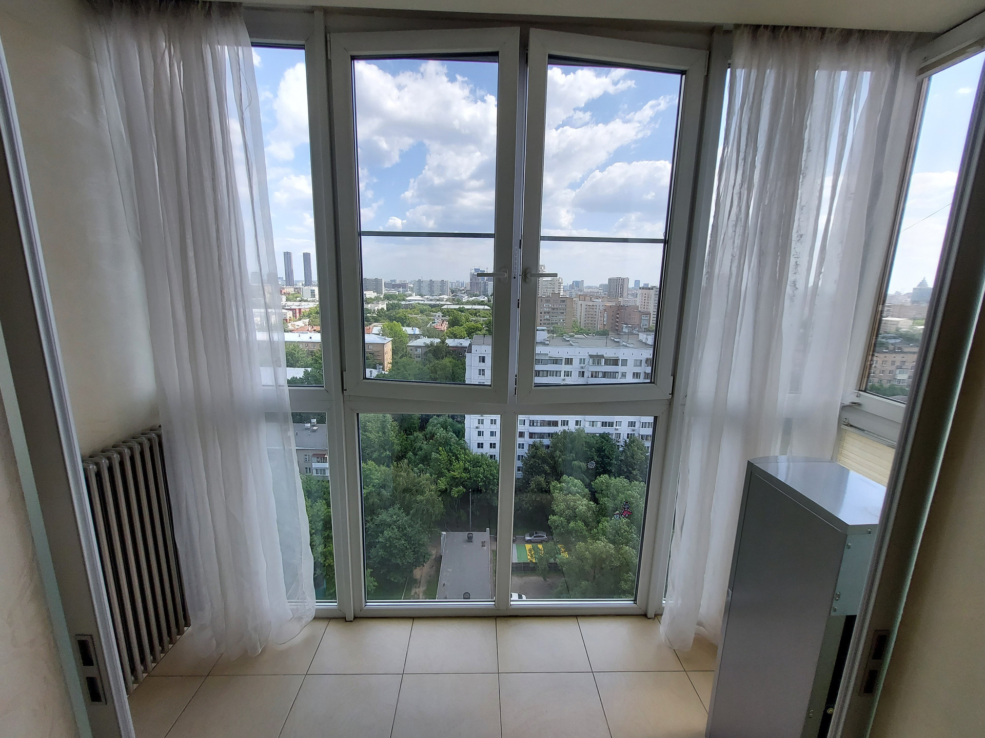 Окна квартиры на 2 стороны, все во двор и за счет 15го этажа с прекрасным видом на город. Тихо, зелено. ТСН.