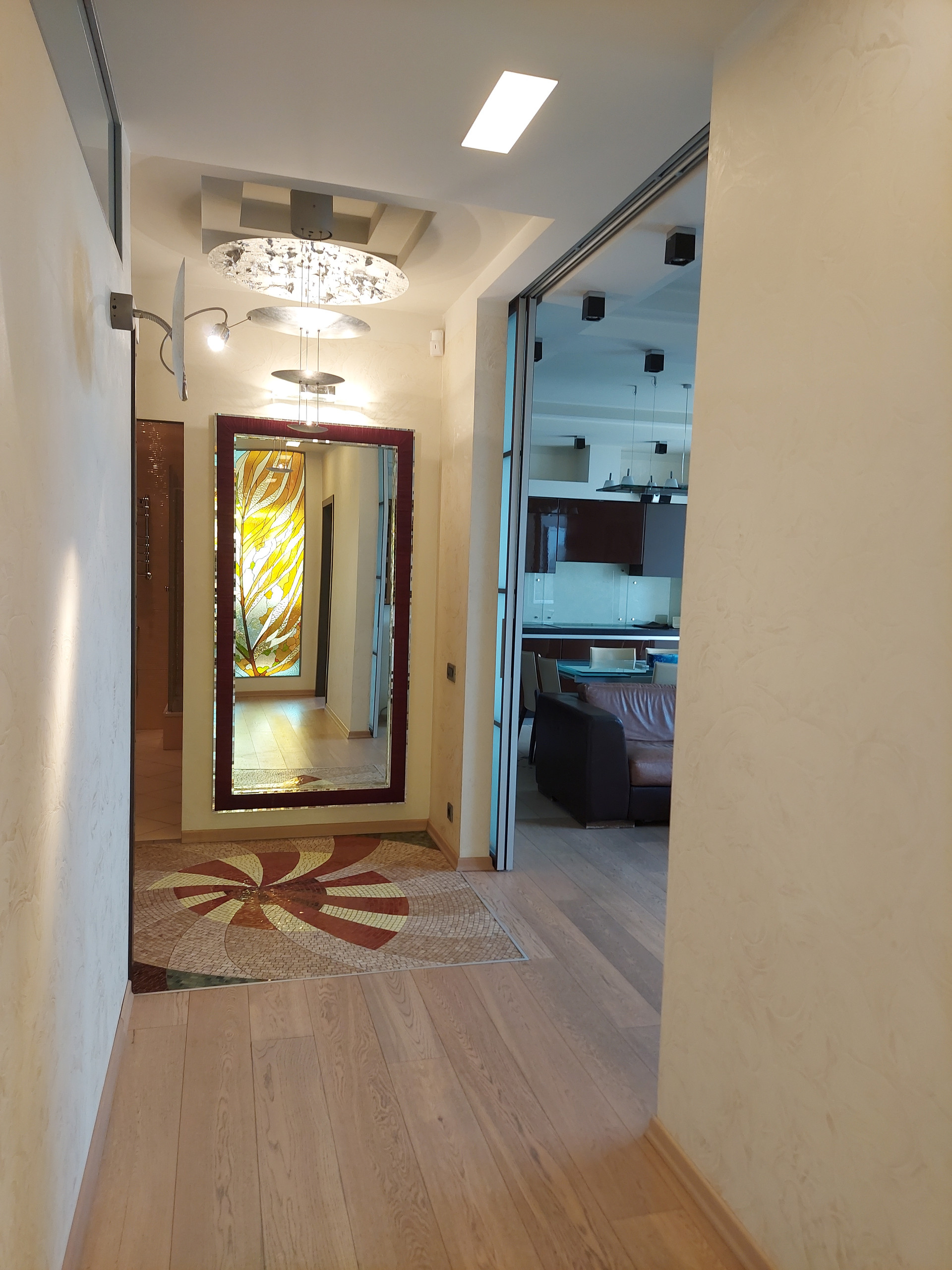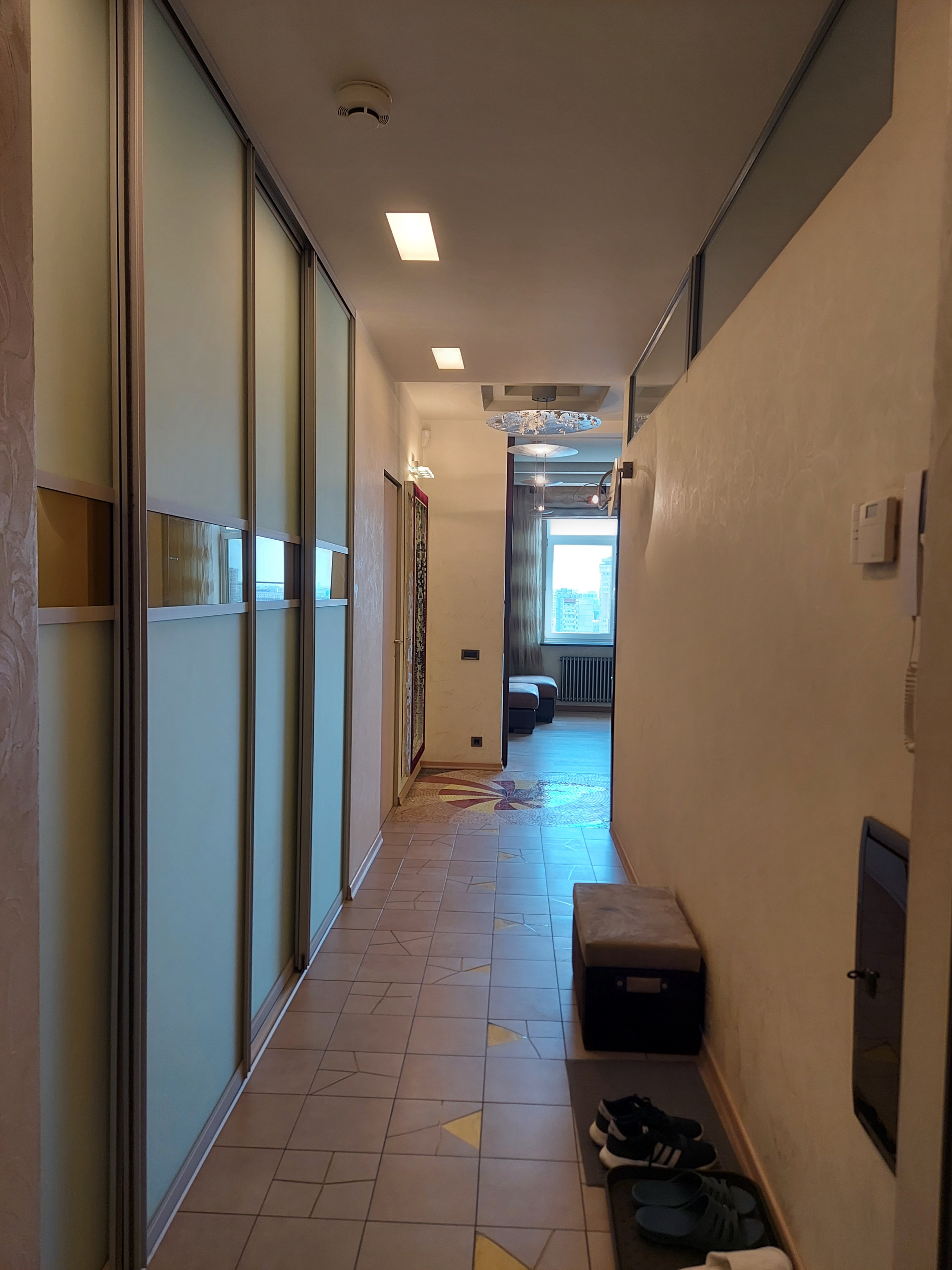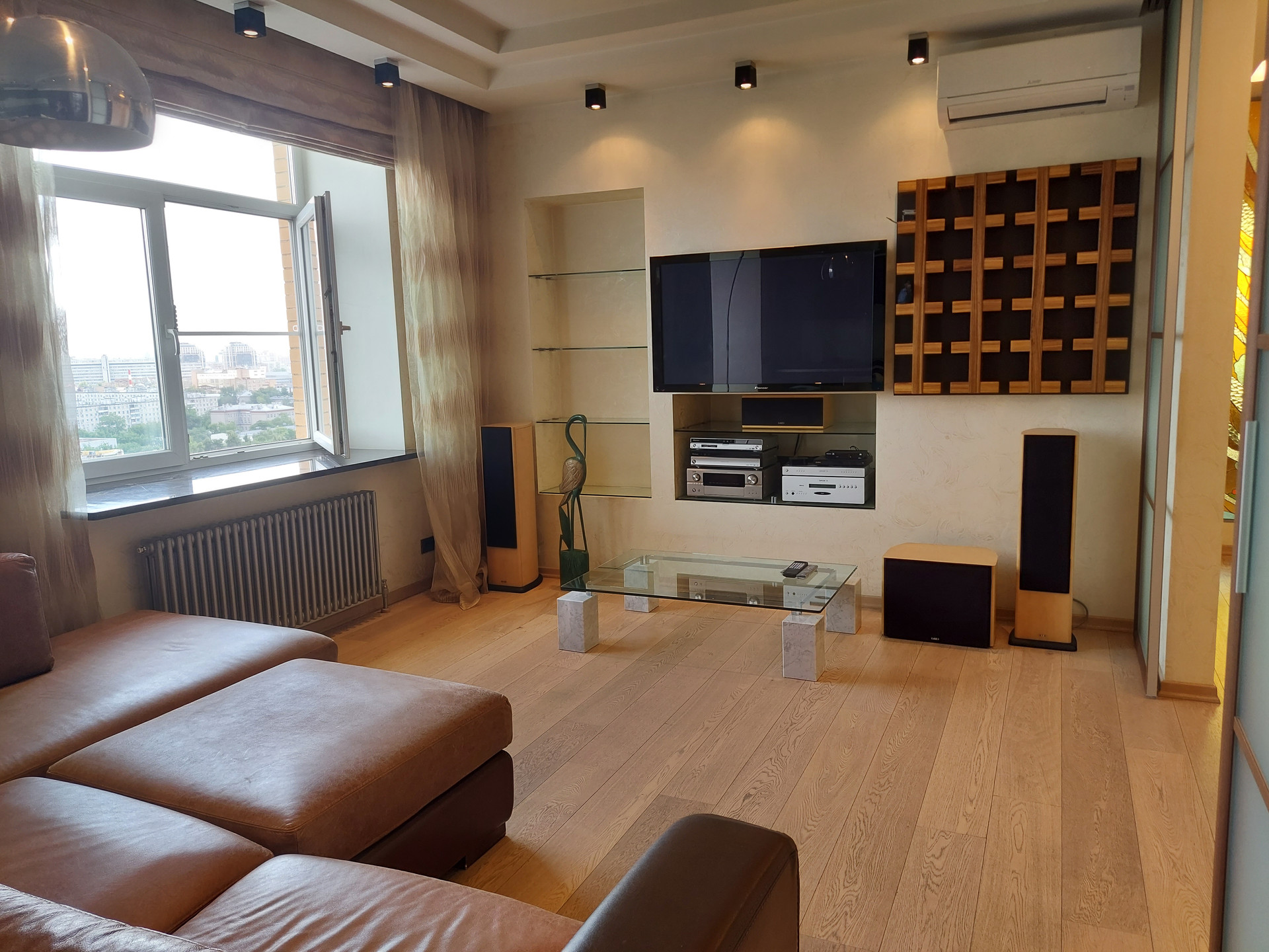 В каждом помещении установлены сплит системы. В санузле установлены бойлер, фильтр тонкой очистки воды, датчики давления, счетчики воды. Подогрев полов в коридоре, зоне кухни, лоджиях и санузлах. Полы в комнатах и гостиной паркетная доска.