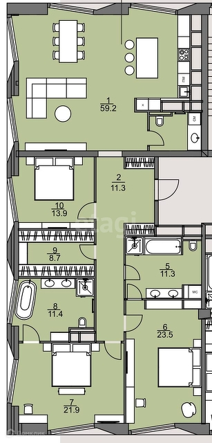 Площадь кухни 59.2 м2