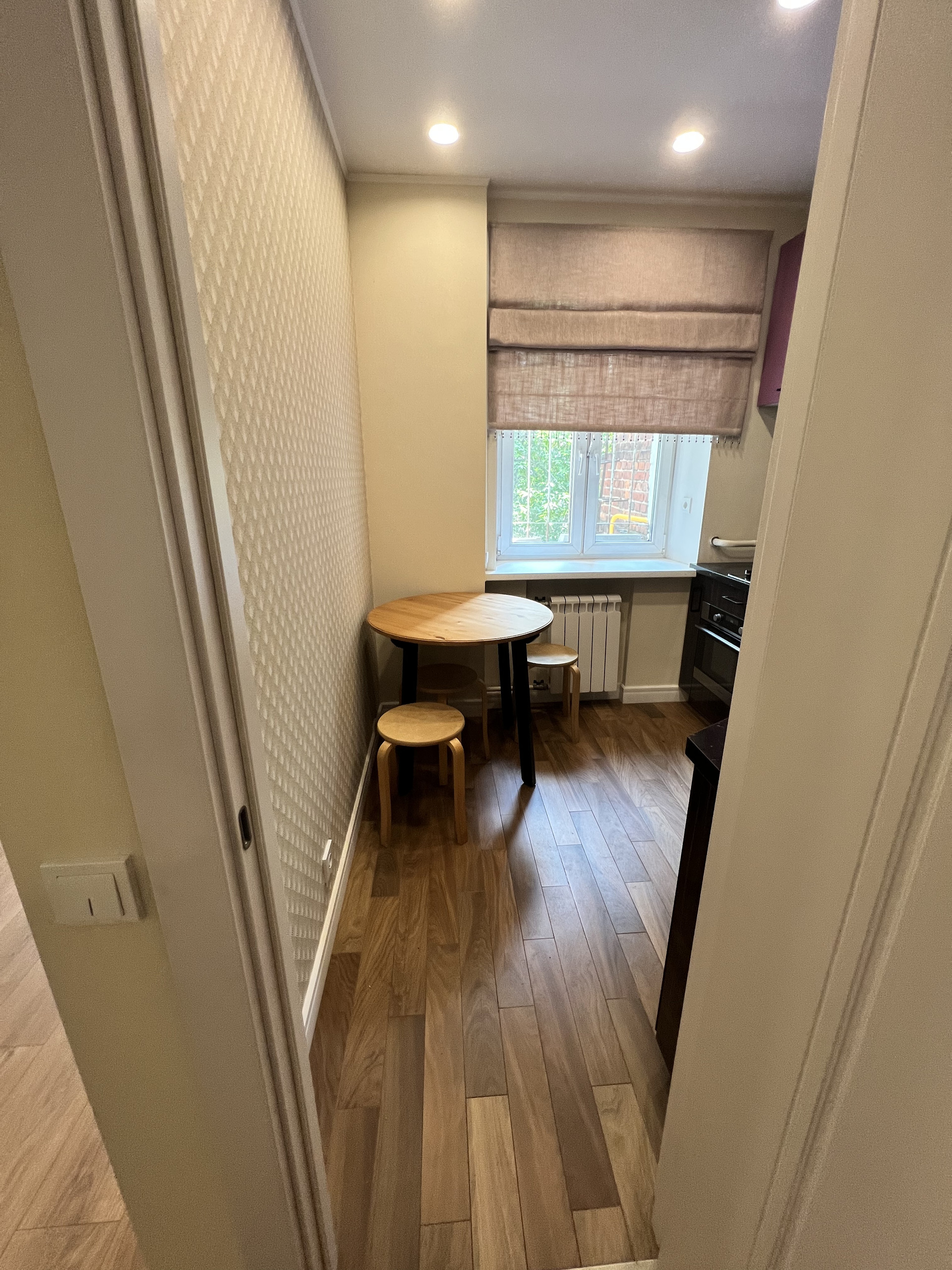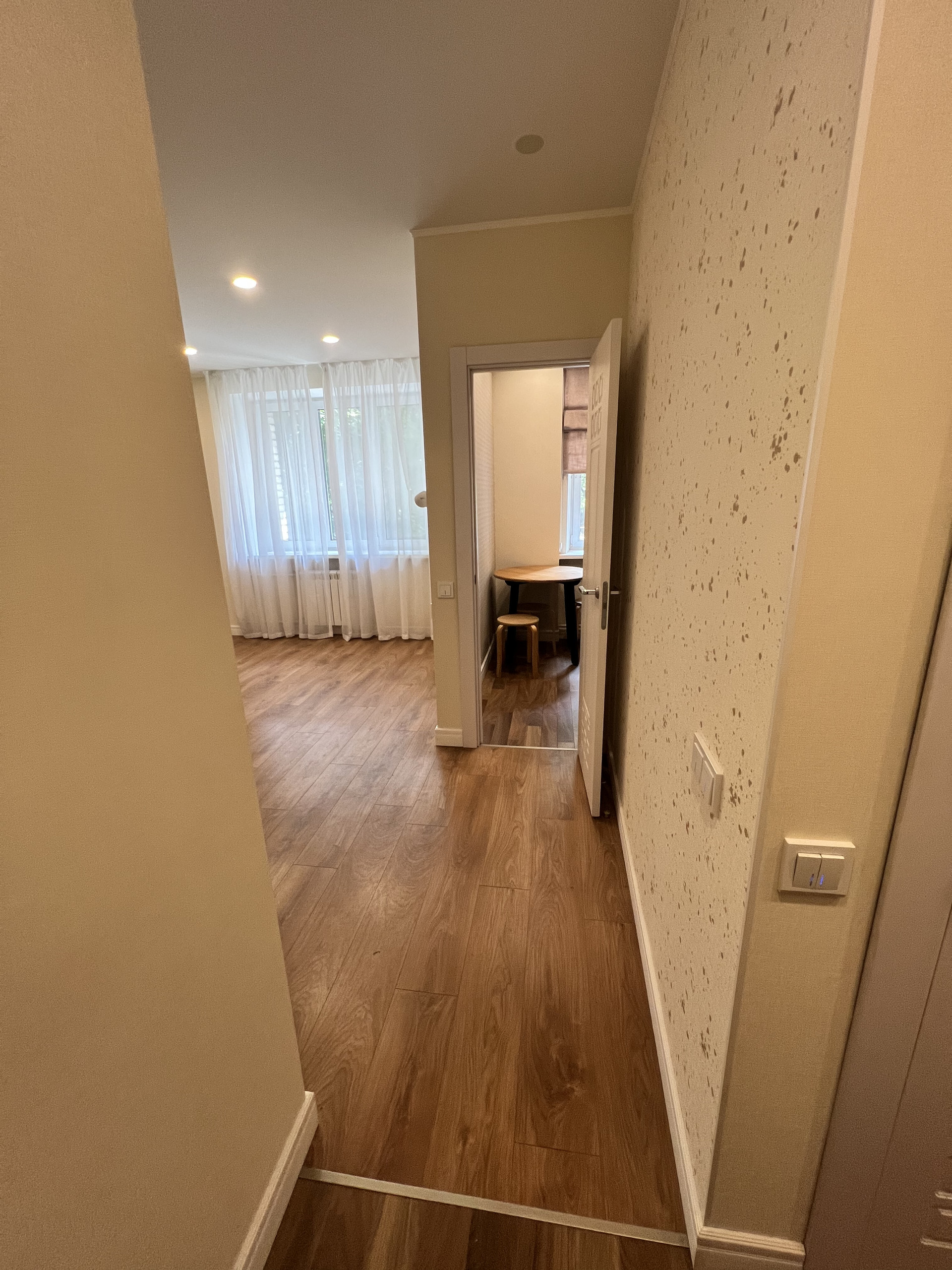 Общая площадь 31 м2. Кухня 6 м2, комната 19 м2, вместительная гардеробная. Современный новый ремонт - сделан капитально. Кондиционер. Вид на тихий двор и зеленые деревья.
