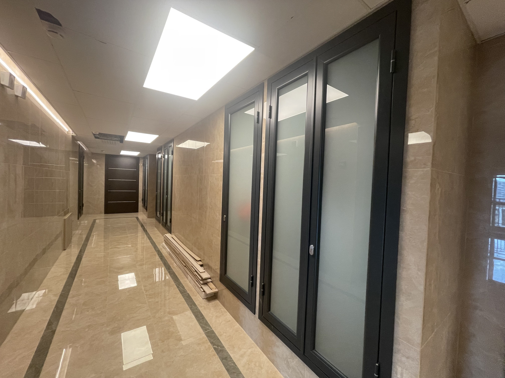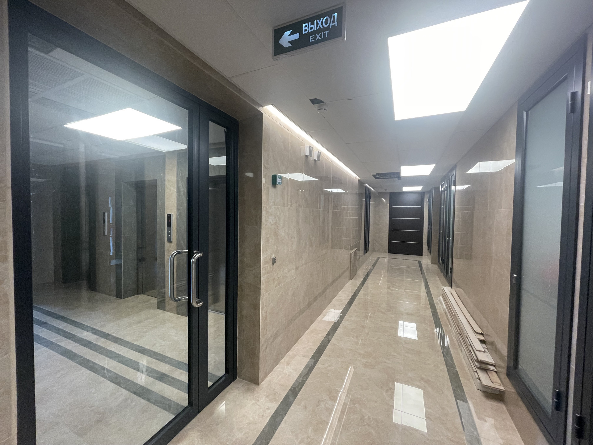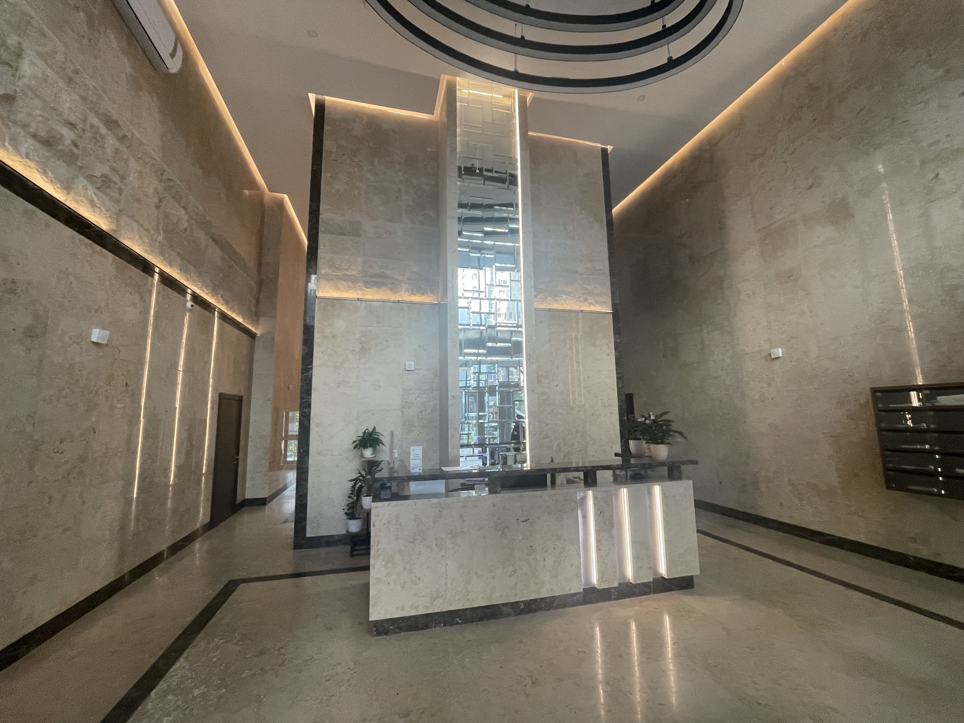 Комплекс возведен по монолитной технологии, фасады и холлы отделаны мрамором и керамогранитом.