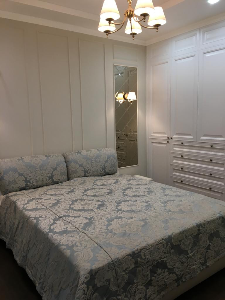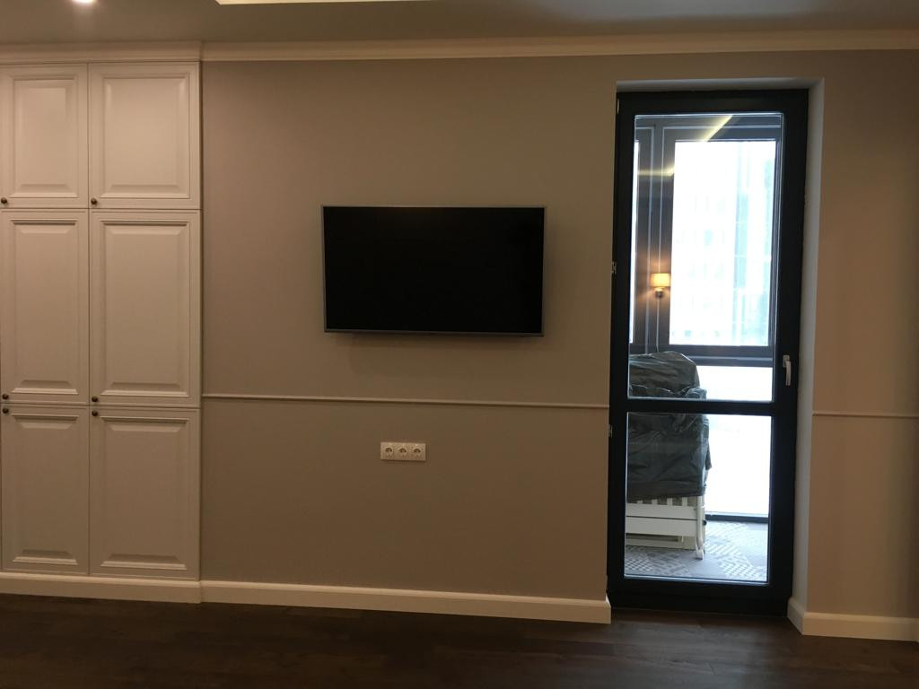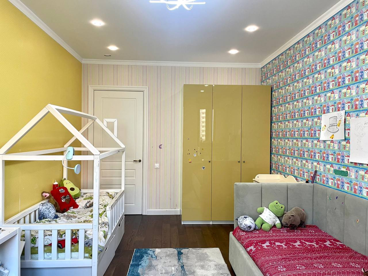 Выполнен дизайнерский ремонт, сантехника Hansgrohe, ROCA. На кухне установлена бытовая техника Bosch. Межкомнатные двери высотой 2.3 метра. Встроенная мебель "Стильные кухни", фасады МДФ, доводчики BLUE. Двухуровневые потолки. Пол - паркетная доска и плитка. Все стены в квартире идеально выровнены. В детской сделана шумоизоляция. Установлены кондиционеры Mitsudishi.