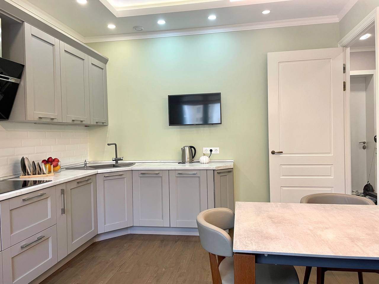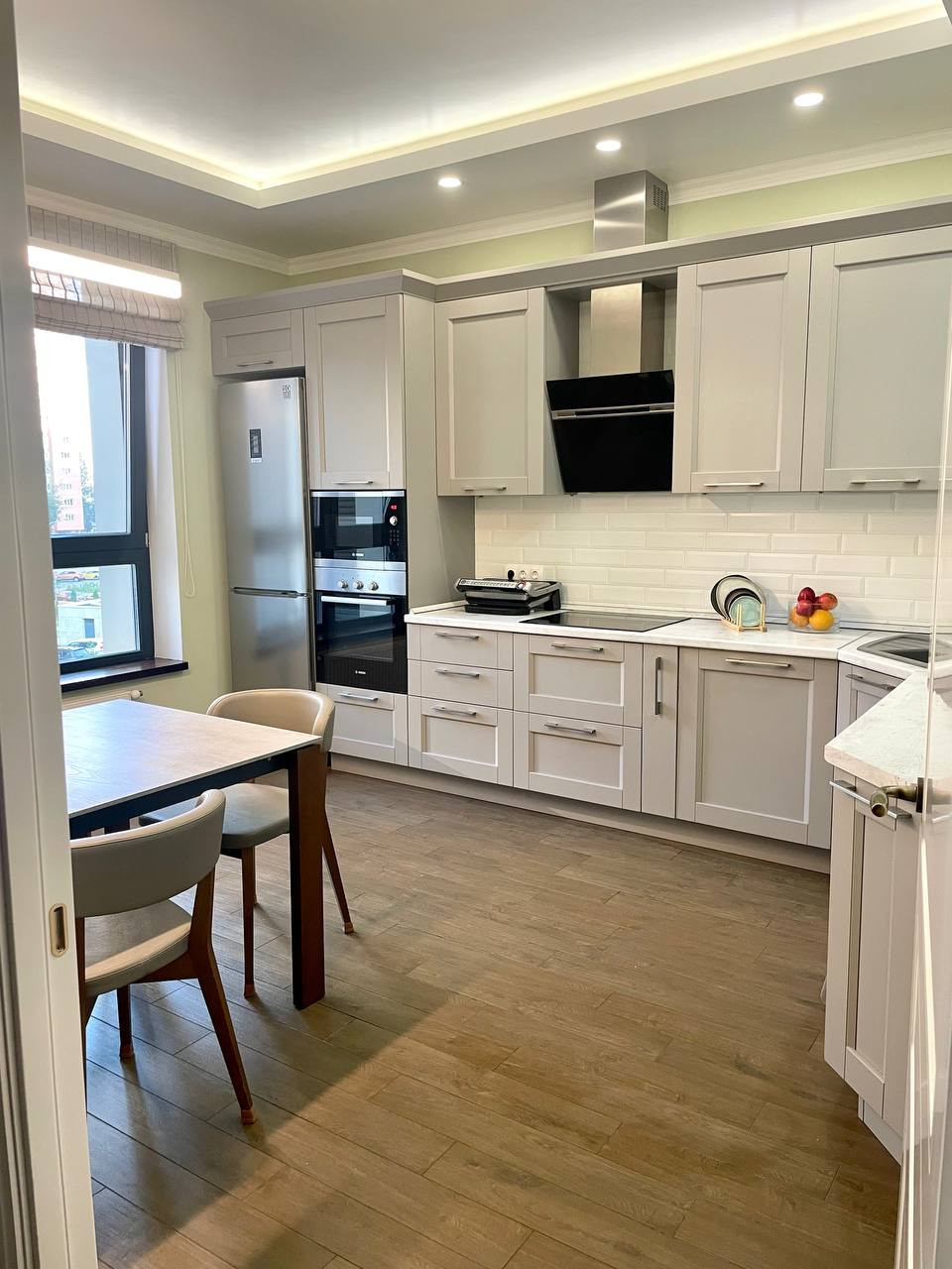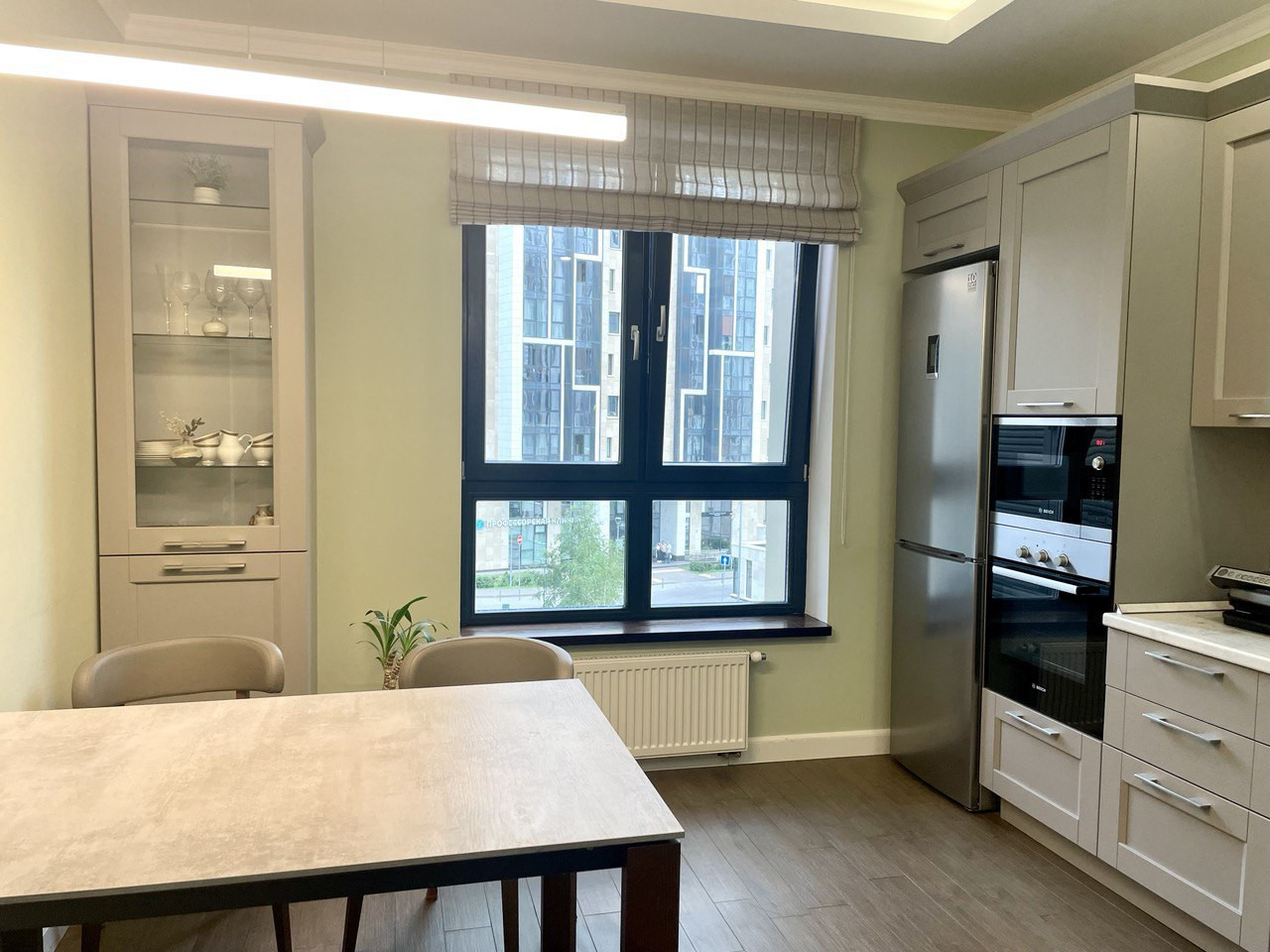 Выполнен дизайнерский ремонт, сантехника Hansgrohe, ROCA. На кухне установлена бытовая техника Bosch. Межкомнатные двери высотой 2.3 метра. Встроенная мебель "Стильные кухни", фасады МДФ, доводчики BLUE. Двухуровневые потолки. Пол - паркетная доска и плитка. Все стены в квартире идеально выровнены. В детской сделана шумоизоляция. Установлены кондиционеры Mitsudishi.