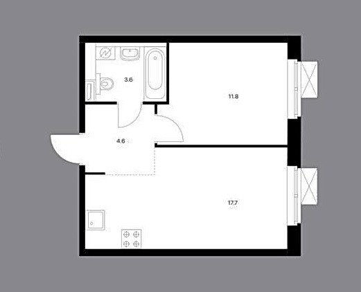 Кухня-гостиная 17.7 и спальня 11.8, просторная квадратная прихожая.