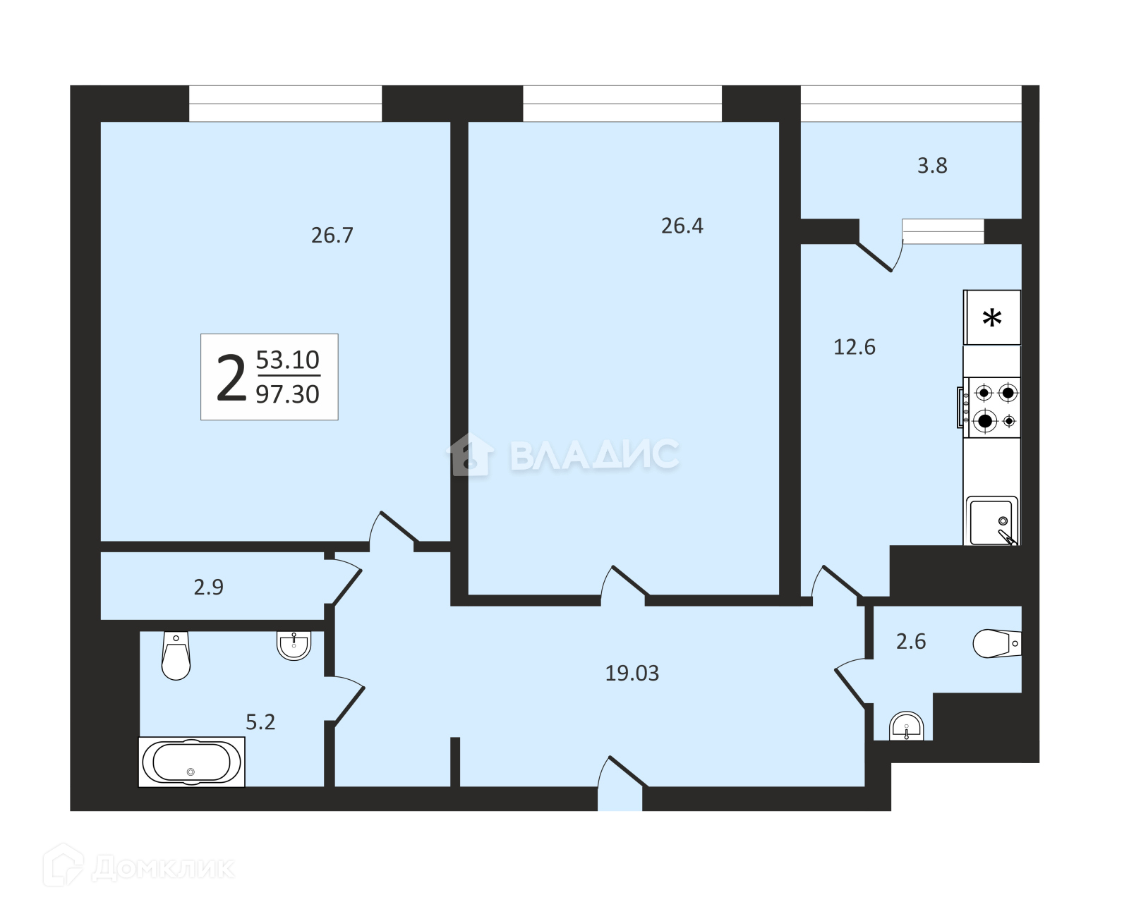 Жилая площадь 53.1 м2