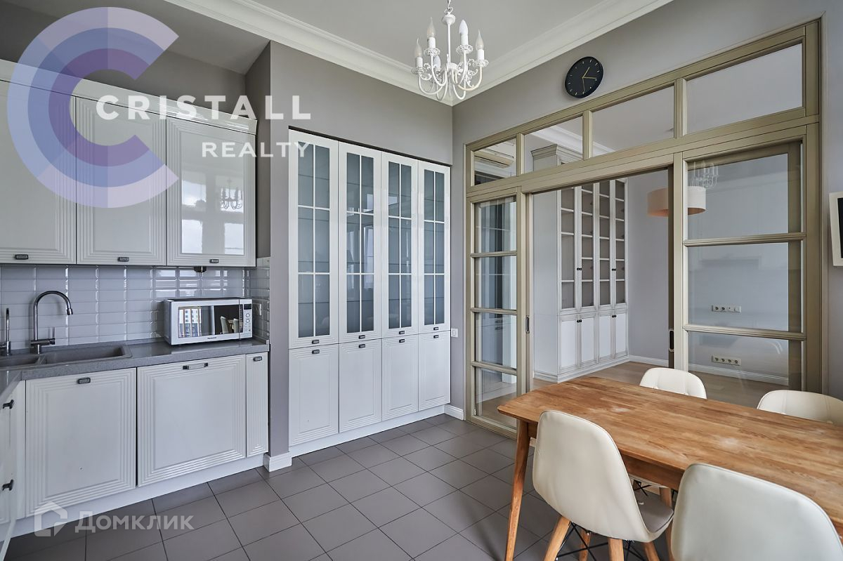 Мебель и раздвижные двери кухни выполнены по индивидуальному заказу из премиальных материалов, встроенная и бытовая техника Bosch.