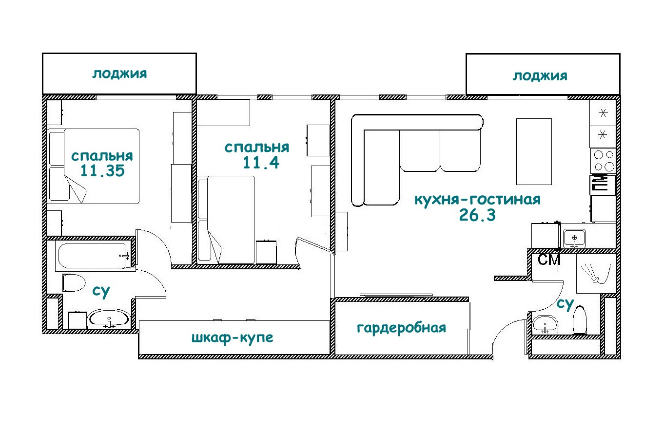 -- кухня-гостиная 26.3 (гостиная 15.5 и кухонная зона 10.8);