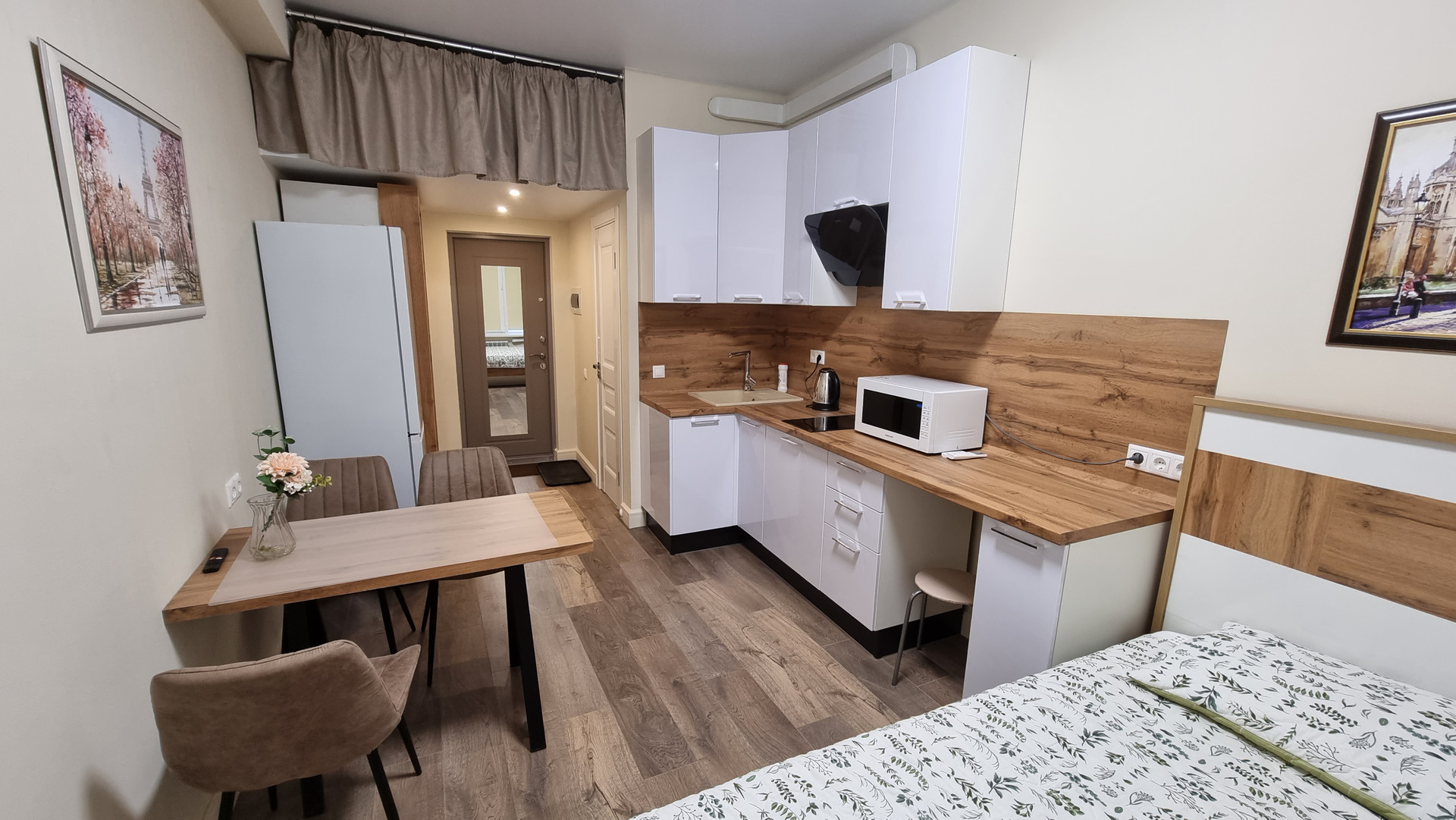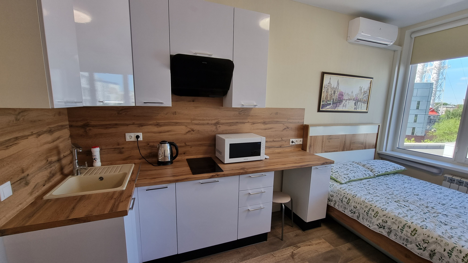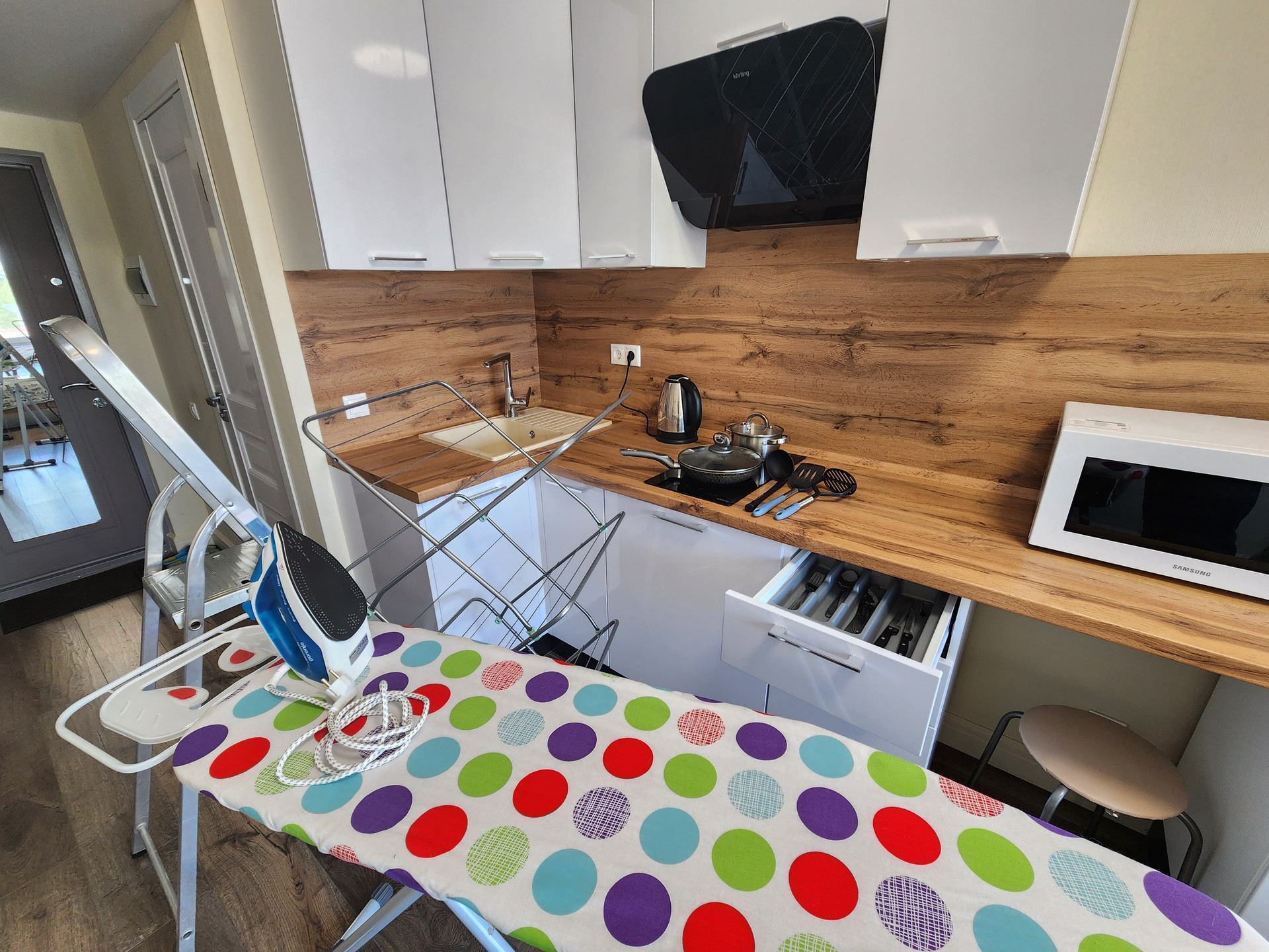 - встроенная кухня, с индукционной плитой (быстрое приготовление), со сковородой и кастрюлей для плиты, вытяжка, чайник, СВЧ-печь, кухонные принадлежности и посуда. Большой холодильник;