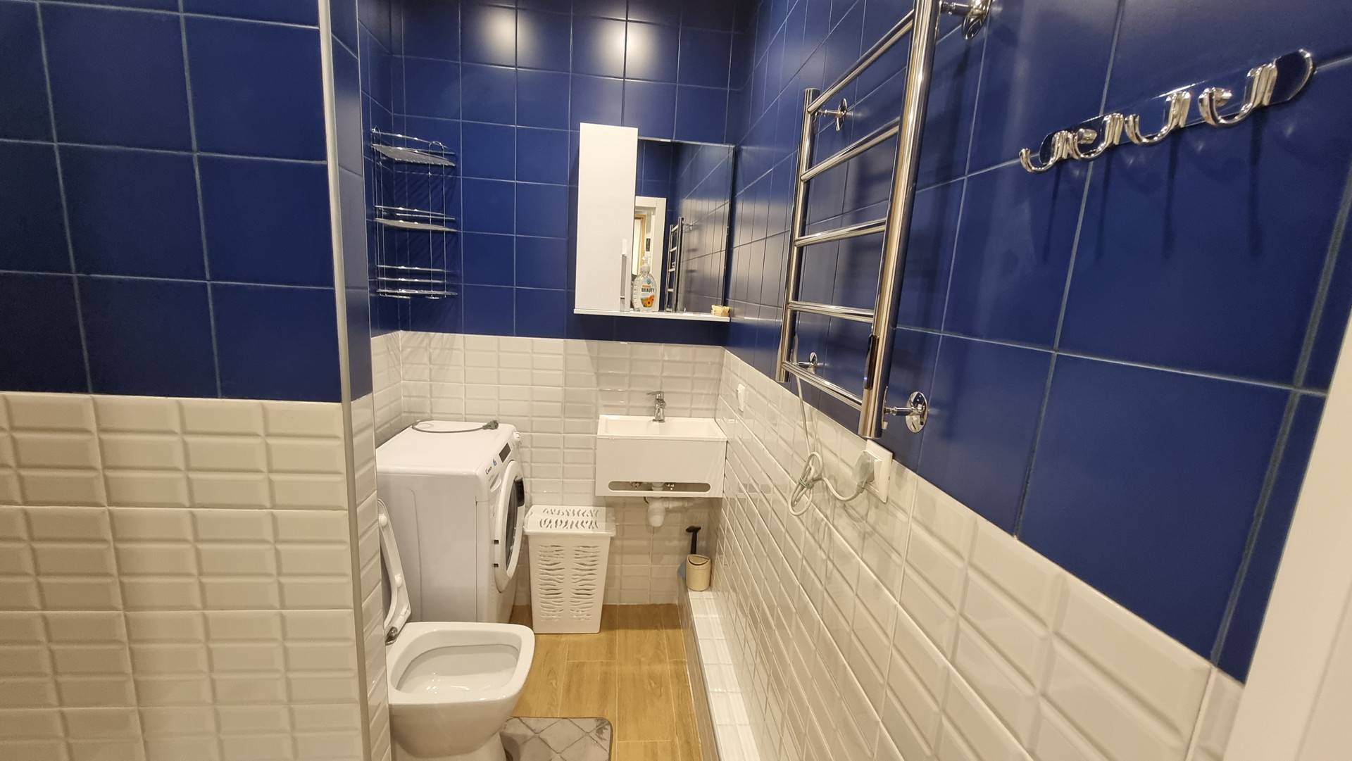 -стиральная машинка, электрический полотенцесушитель с изменением температуры и длительности времени работы, сушилка для белья, утюг, гладильная доска, стремянка для антресолей;