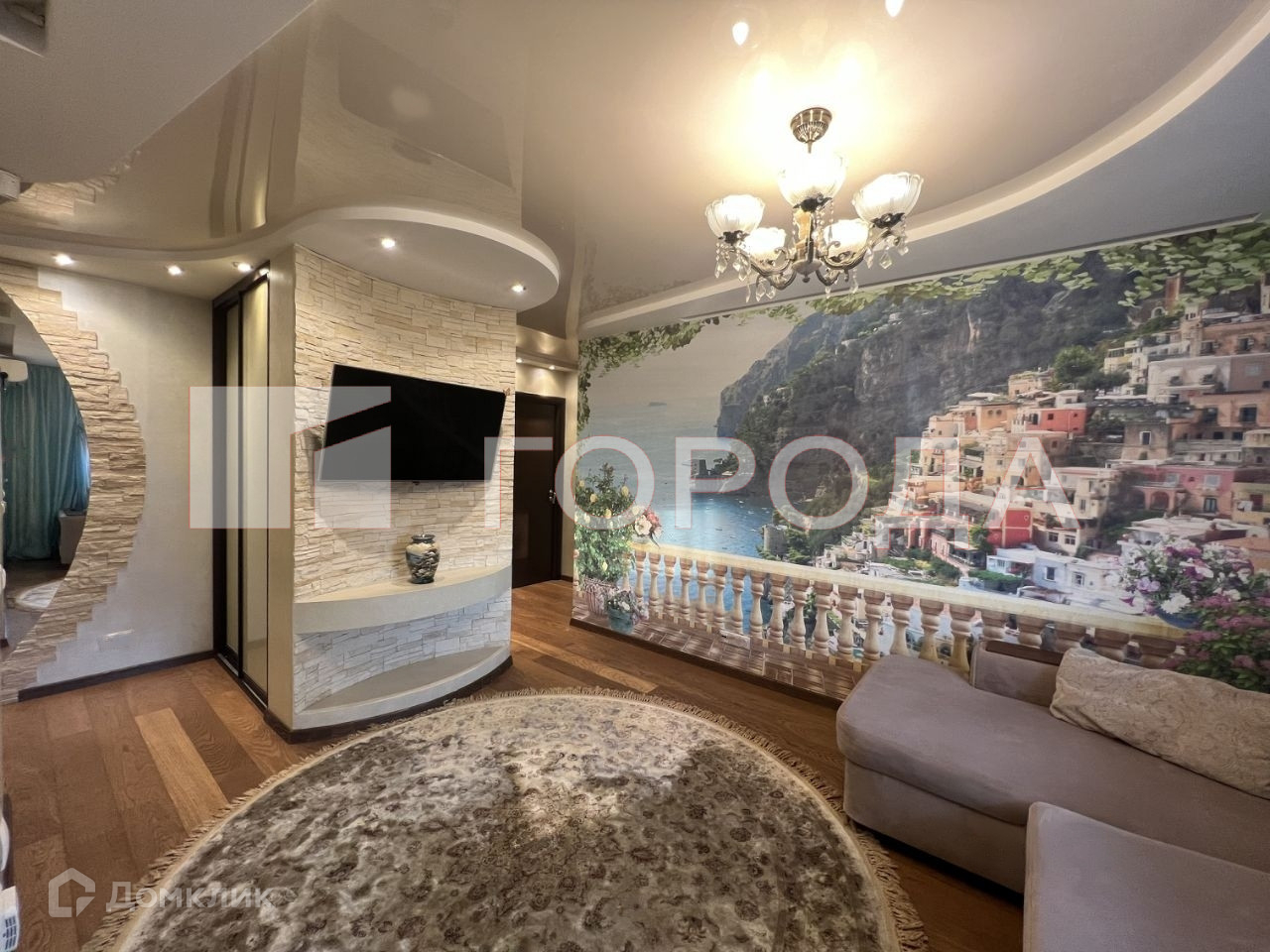 Гостиная плавно переходящая из прихожей: паркетная доска, 3х уровневые потолки, на стенах декоративная штукатурка и фреска ручной работы, портал под ТВ из искусственного камня, встроенный зеркальный шкаф, кондиционер.