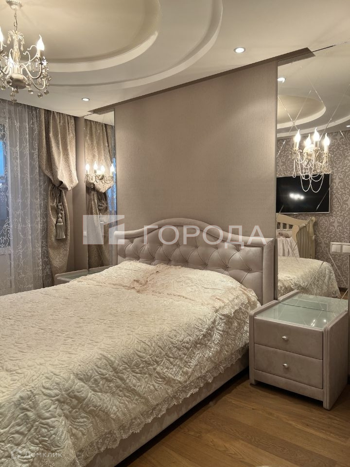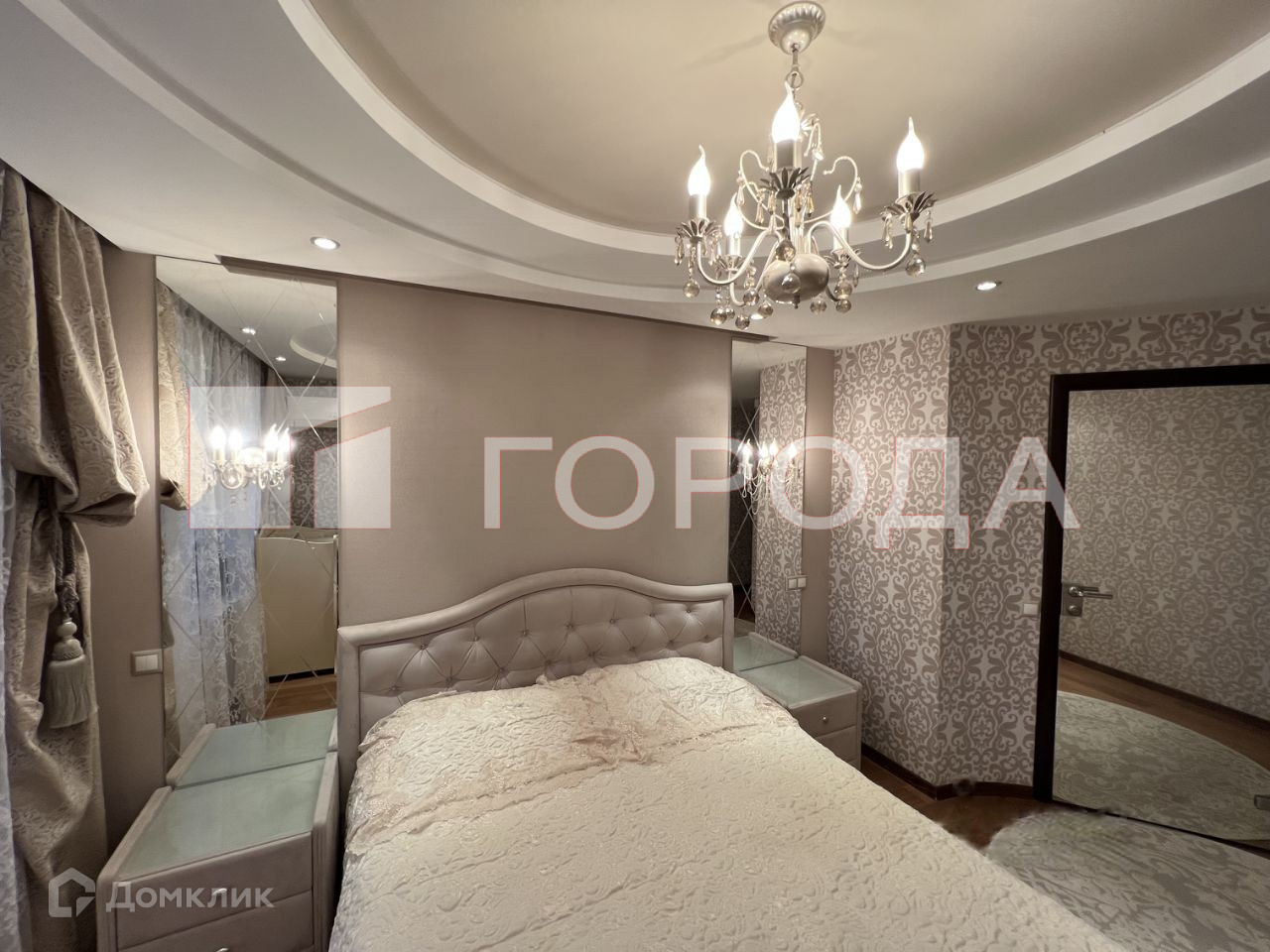Мастер-спальня: 3х уровневые потолки, зеркальные панели с гравировкой, гардеробная в виде полуэркера с полным наполнением и двухсторонней зеркальной дверью, кондиционер.