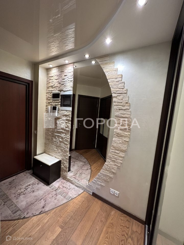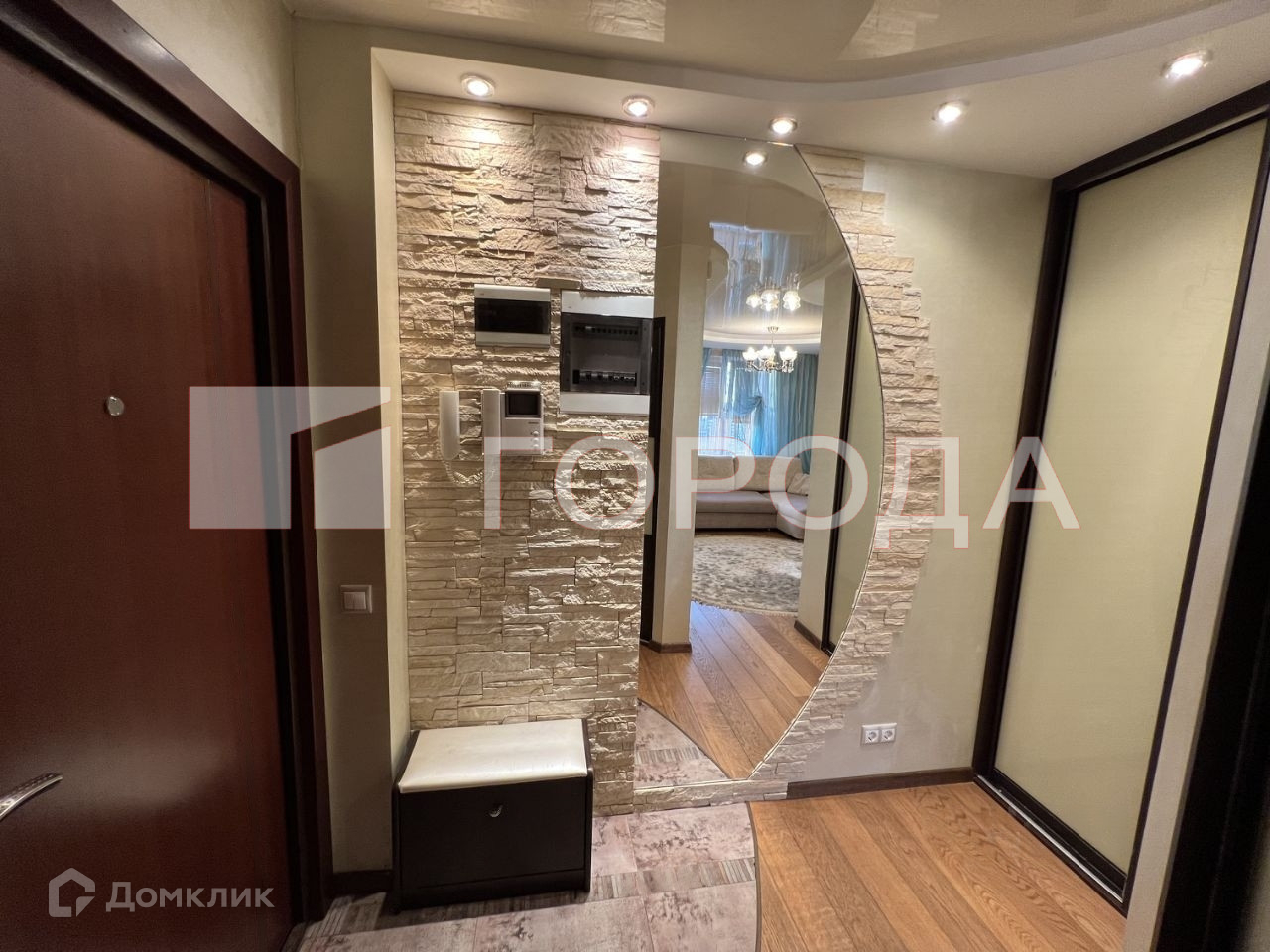 Прихожая с кладовой для хранения одежды и обуви с наполнением, встроенный стеклянный шкаф, большое зеркало в пол, отделанный декоративным камнем, подогрев пола.