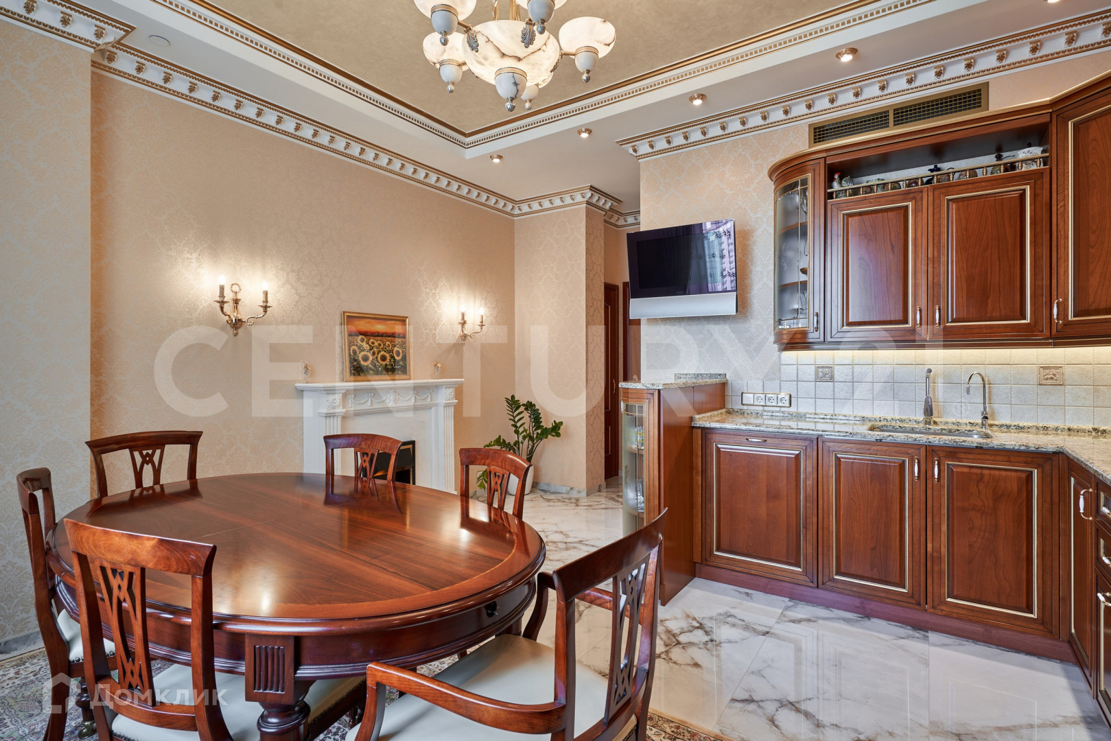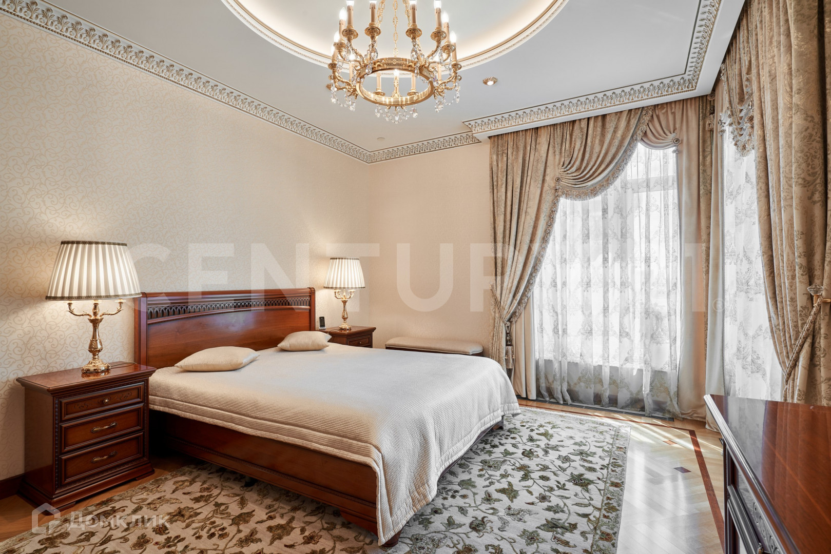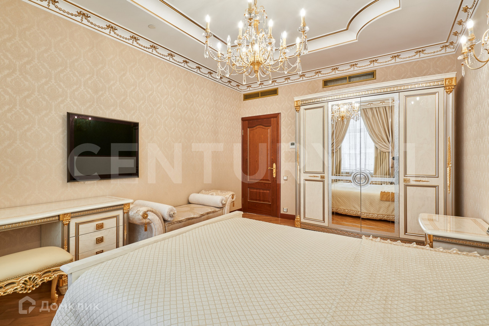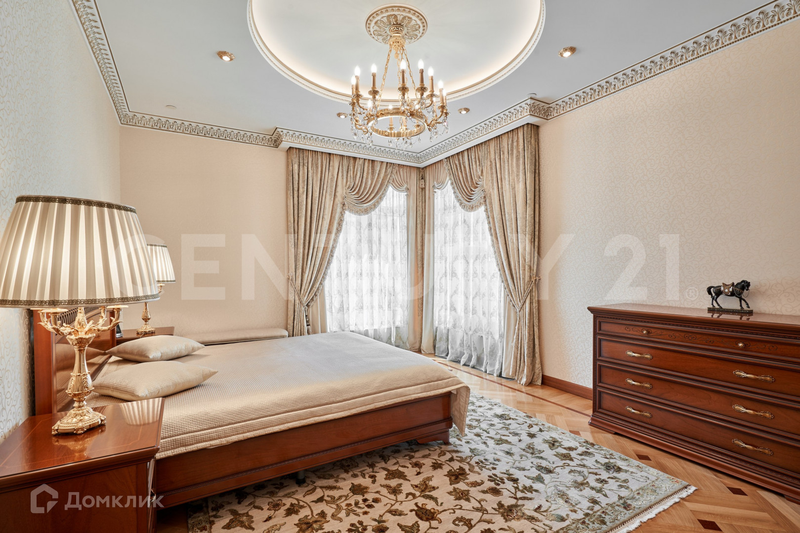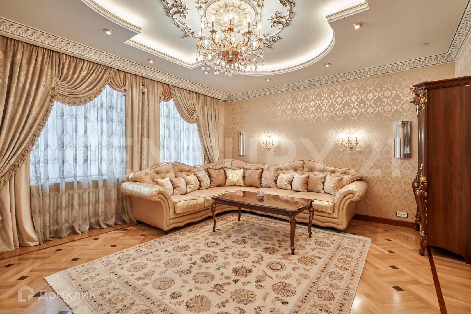В безупречной отделке использованы высококлассные материалы, включающие гипсовую лепнину, позолоту, наборный дубовый паркет, натуральный камень (мрамор, гранит), бесшовные текстильные обои. При пошиве штор использованы натуральный шелк и бархат. Полная комплектация мебелью и предметами интерьера. Теле и ауди системы High-End класса Bang&Olufsen расположены по всей квартире и подключенные к центральному серверу.