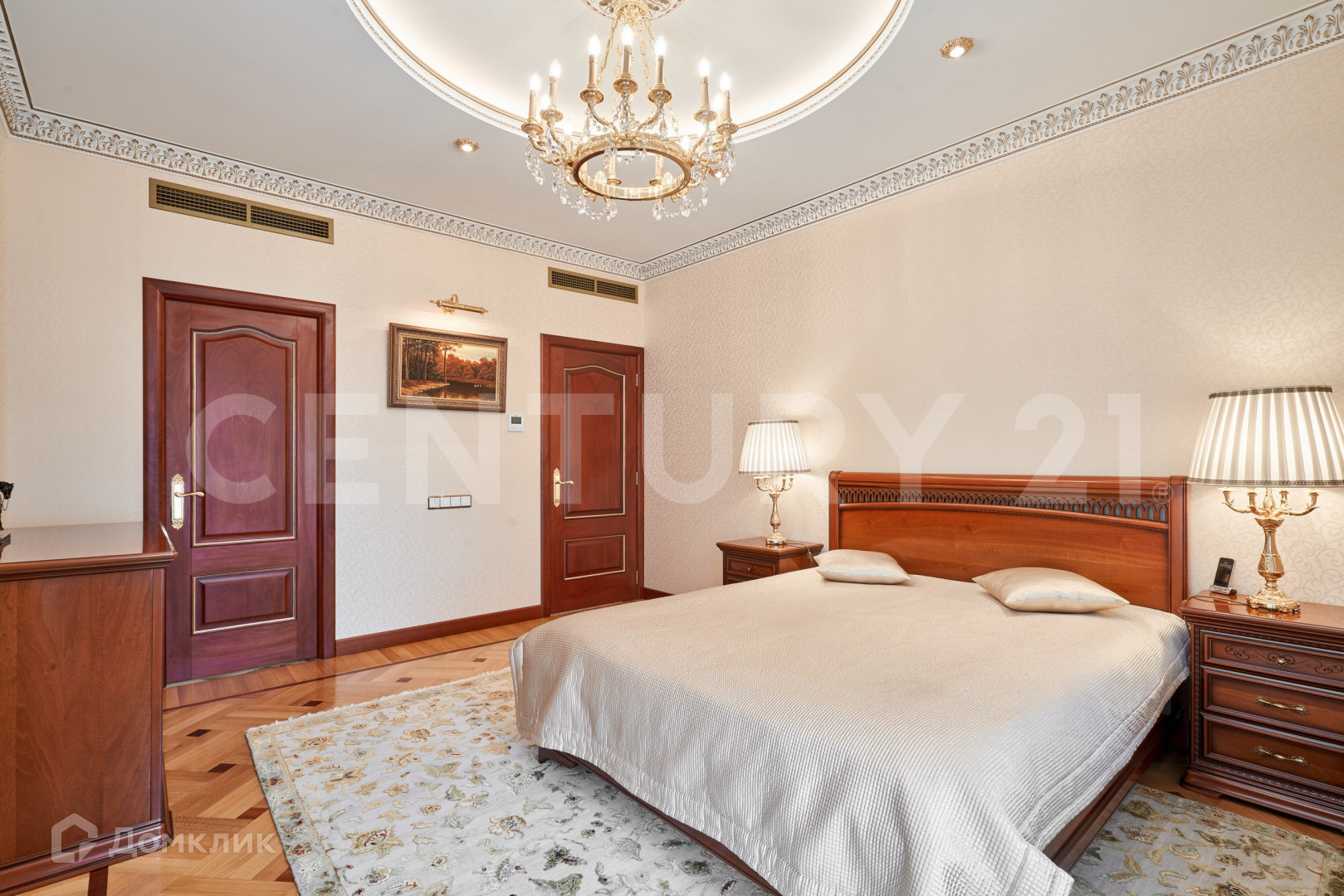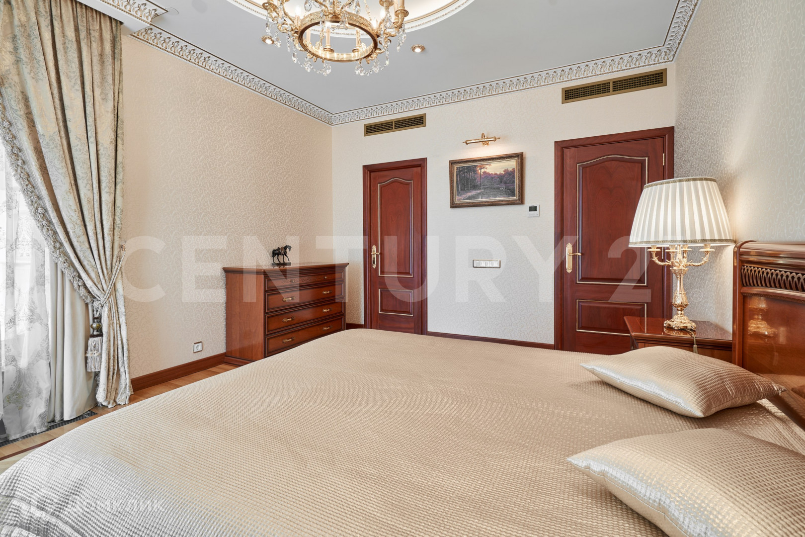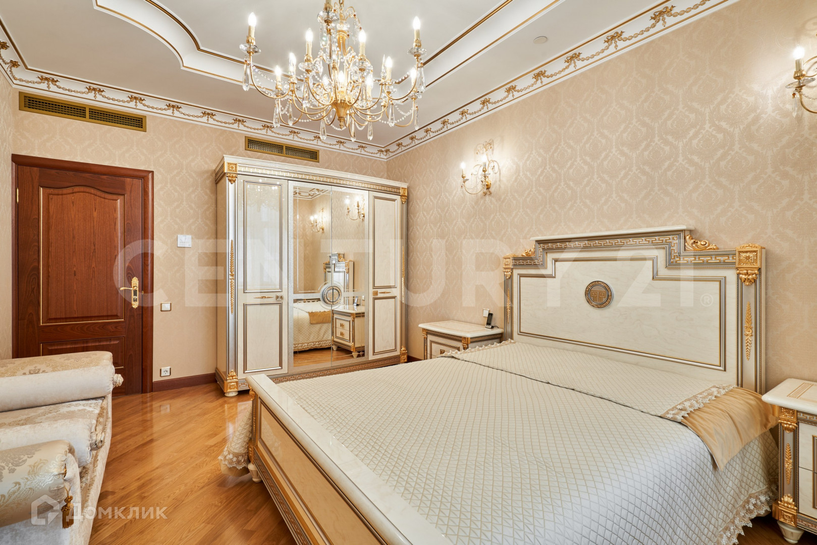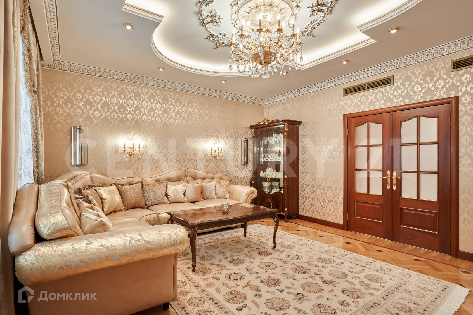 В безупречной отделке использованы высококлассные материалы, включающие гипсовую лепнину, позолоту, наборный дубовый паркет, натуральный камень (мрамор, гранит), бесшовные текстильные обои. При пошиве штор использованы натуральный шелк и бархат. Полная комплектация мебелью и предметами интерьера. Теле и ауди системы High-End класса Bang&Olufsen расположены по всей квартире и подключенные к центральному серверу.