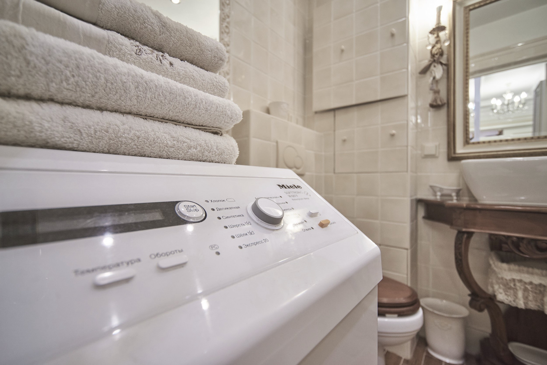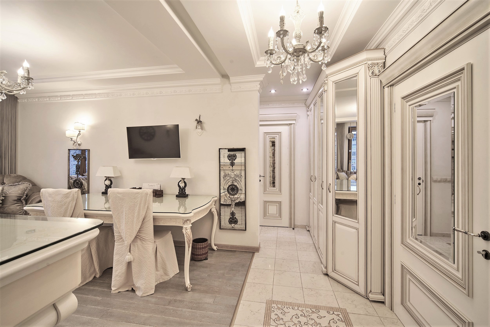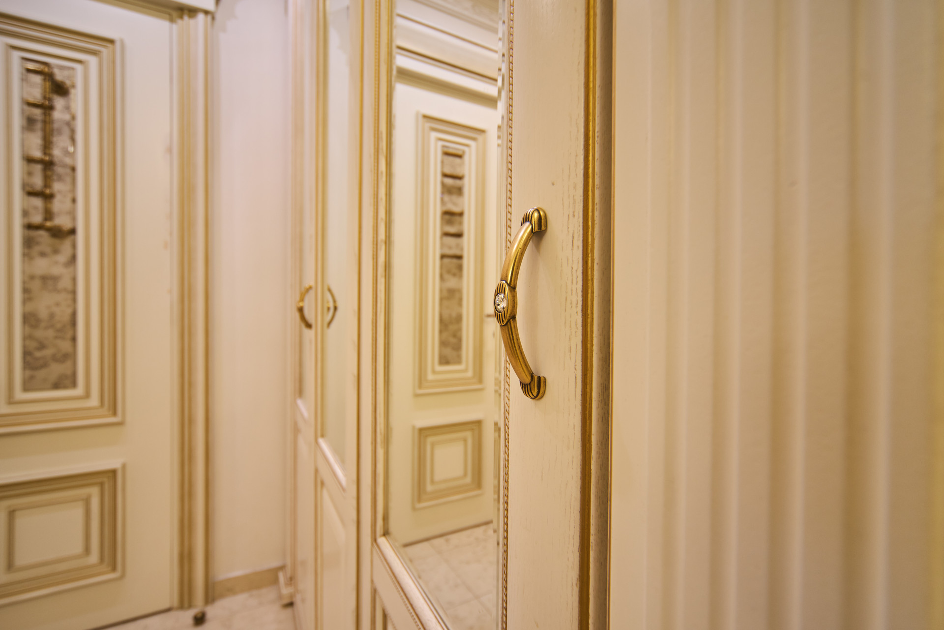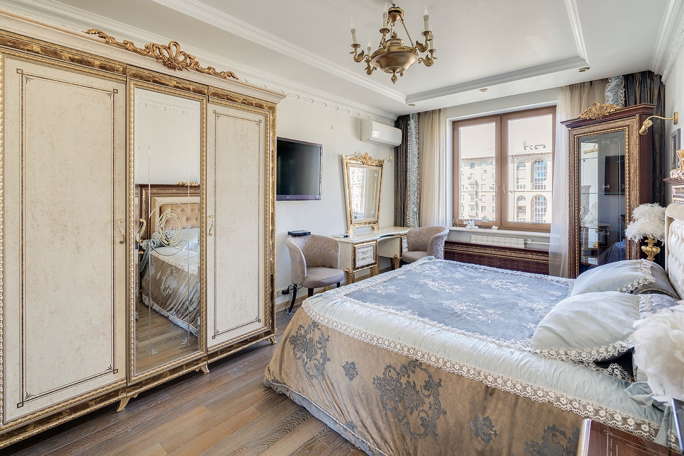 Окна - деревянные стеклопакеты немецкого производителя, полы - патинированный дуб. Сантехника Villeroy & Boch. Мебель Antonelli Moravio и прочих ведущих итальянских брендов. Приятные опции в виде туалетного стола с подсветкой, кровать Super King size - более 2Х2м, дорогой ортопедический матрац, гипоаллергенное белье. Бытовая техника ведущих производителей: варочная стекло керамическая панель Miele, духовой шкаф и стиральная машина Miele, посудомоечная машина и холодильник Bosch, чайник Bork, пылесос. Кондиционеры Daikin с функцией увлажнения, охлаждения, нагрева и ионизации воздуха. Дверные ручки – серебро 950*, мозаика 24 каратное золото. Комфортная рабочая зона с письменным столом. Кабельное телевидение 700 каналов, высокоскоростной интернет, домофон и видео наблюдение в подъезде и на этаже.