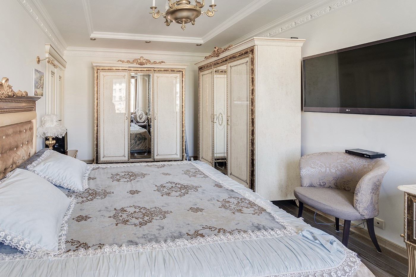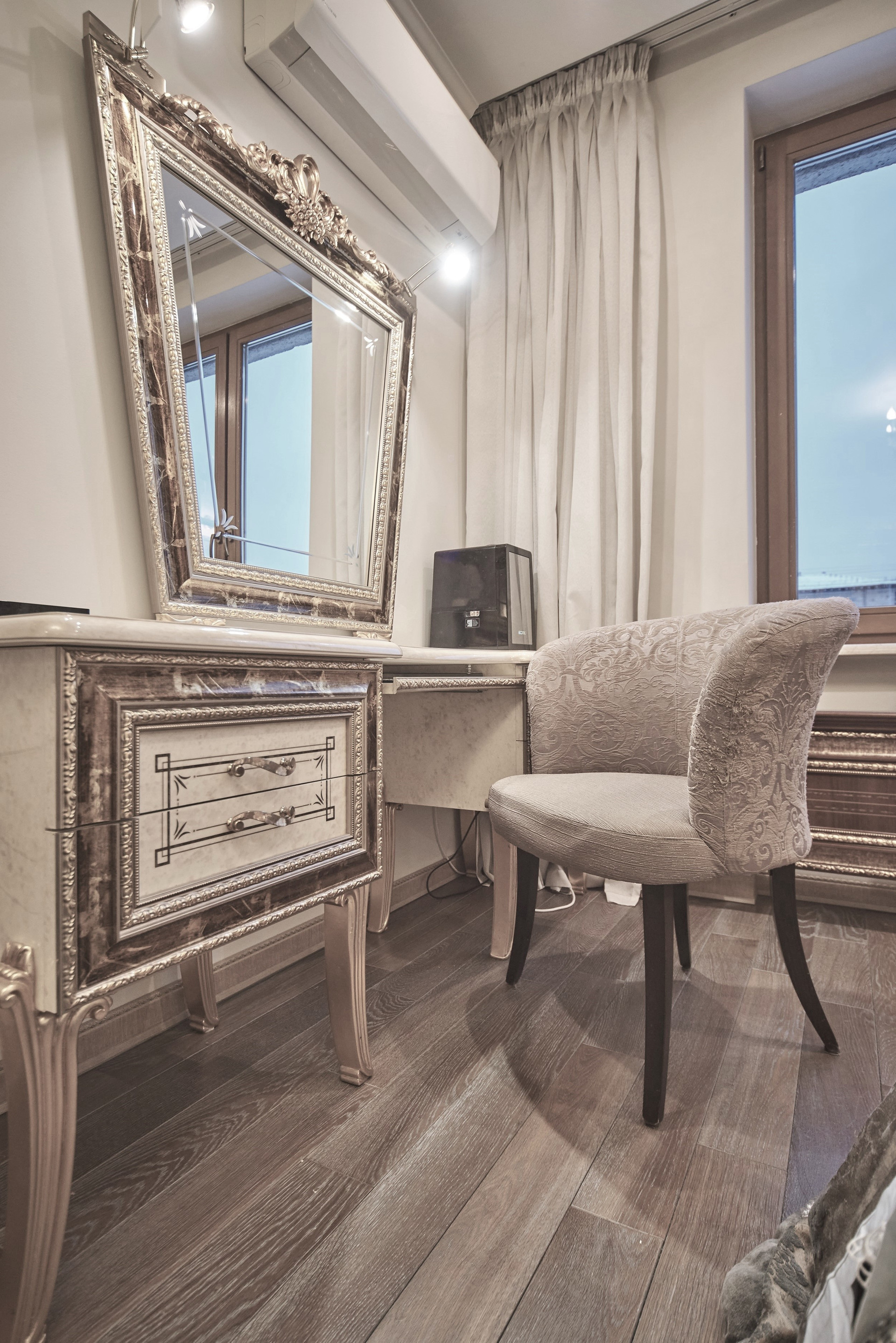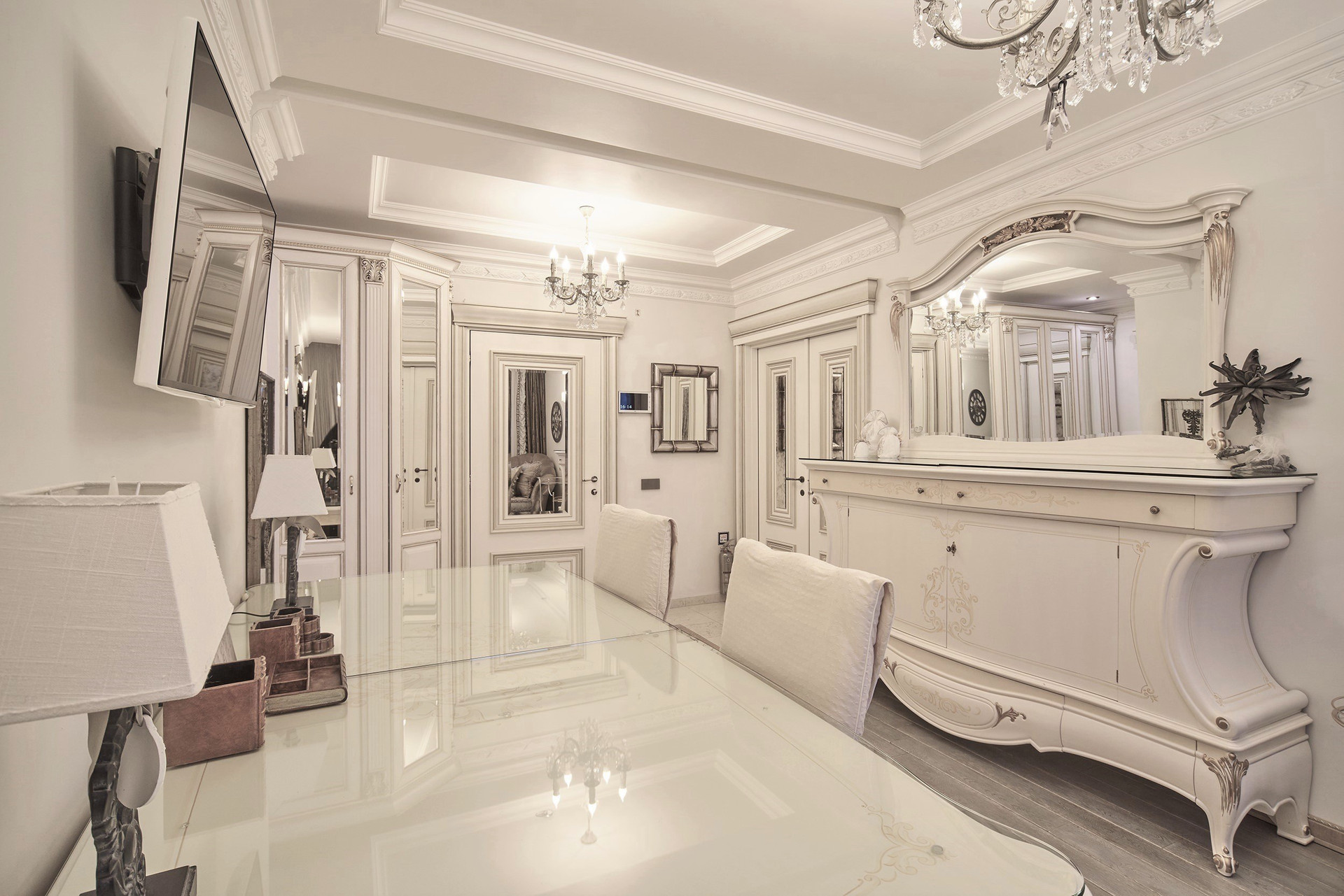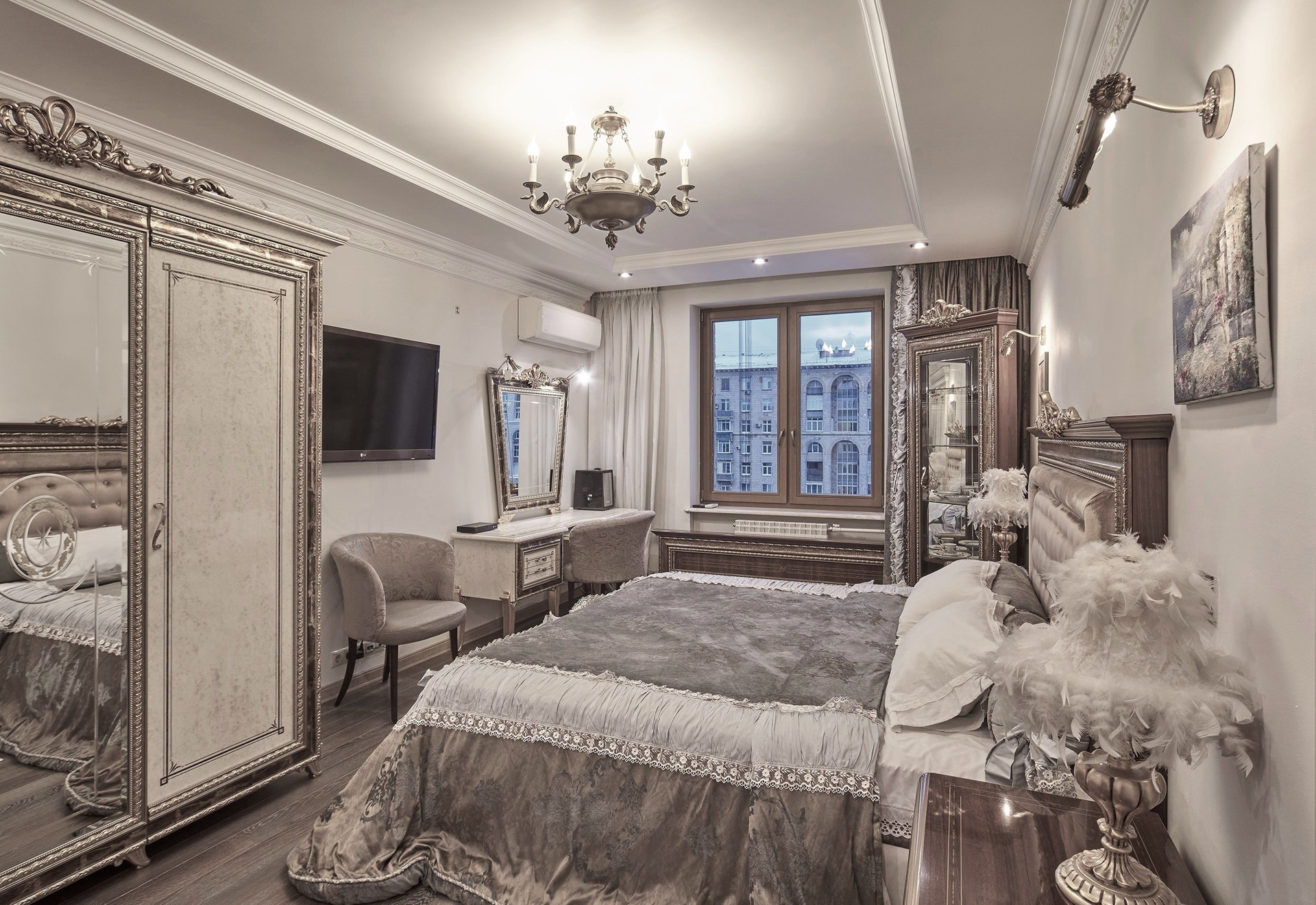 Окна - деревянные стеклопакеты немецкого производителя, полы - патинированный дуб. Сантехника Villeroy & Boch. Мебель Antonelli Moravio и прочих ведущих итальянских брендов. Приятные опции в виде туалетного стола с подсветкой, кровать Super King size - более 2Х2м, дорогой ортопедический матрац, гипоаллергенное белье. Бытовая техника ведущих производителей: варочная стекло керамическая панель Miele, духовой шкаф и стиральная машина Miele, посудомоечная машина и холодильник Bosch, чайник Bork, пылесос. Кондиционеры Daikin с функцией увлажнения, охлаждения, нагрева и ионизации воздуха. Дверные ручки – серебро 950*, мозаика 24 каратное золото. Комфортная рабочая зона с письменным столом. Кабельное телевидение 700 каналов, высокоскоростной интернет, домофон и видео наблюдение в подъезде и на этаже.