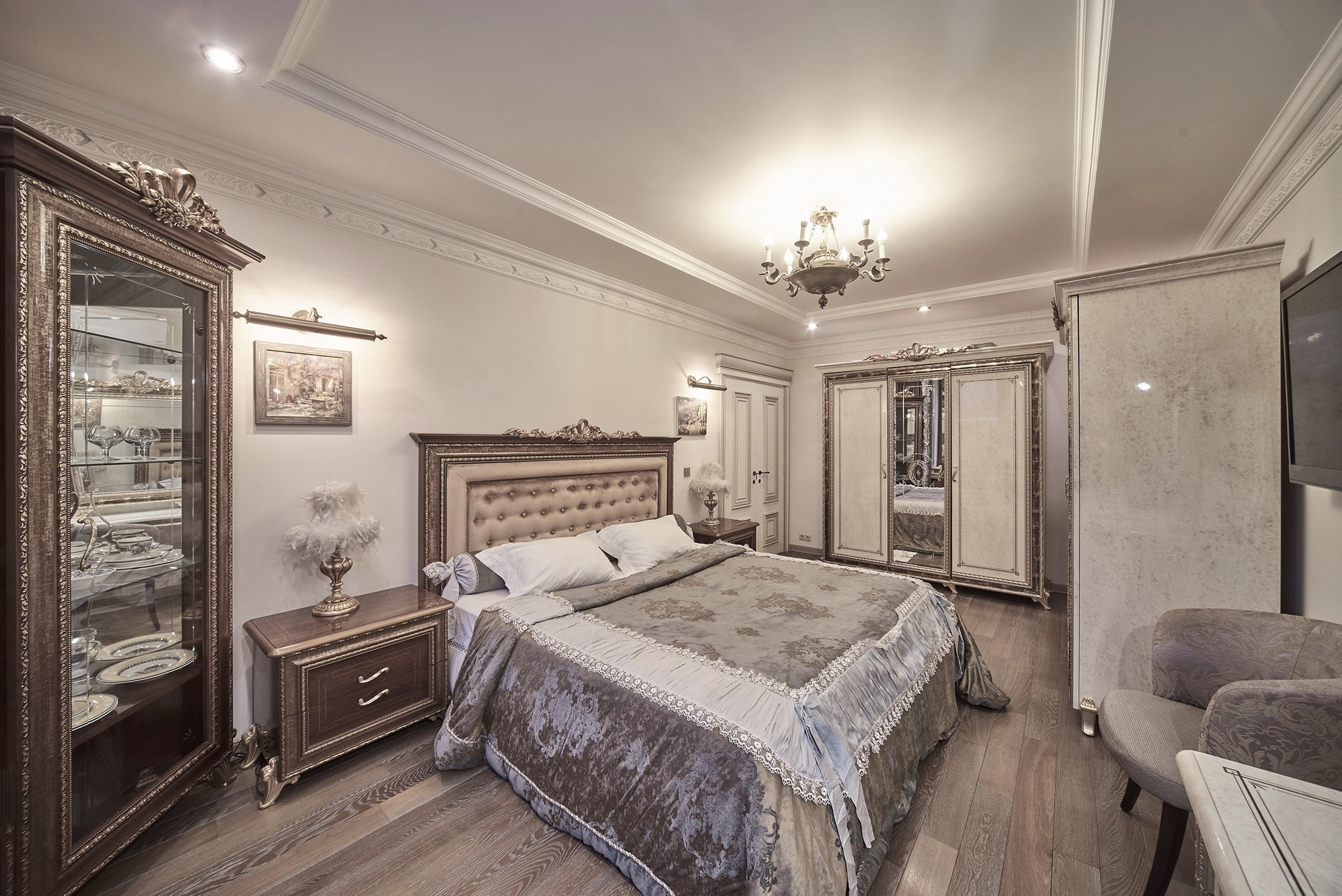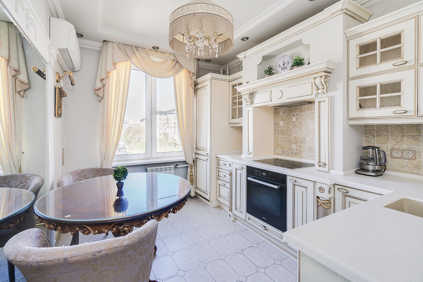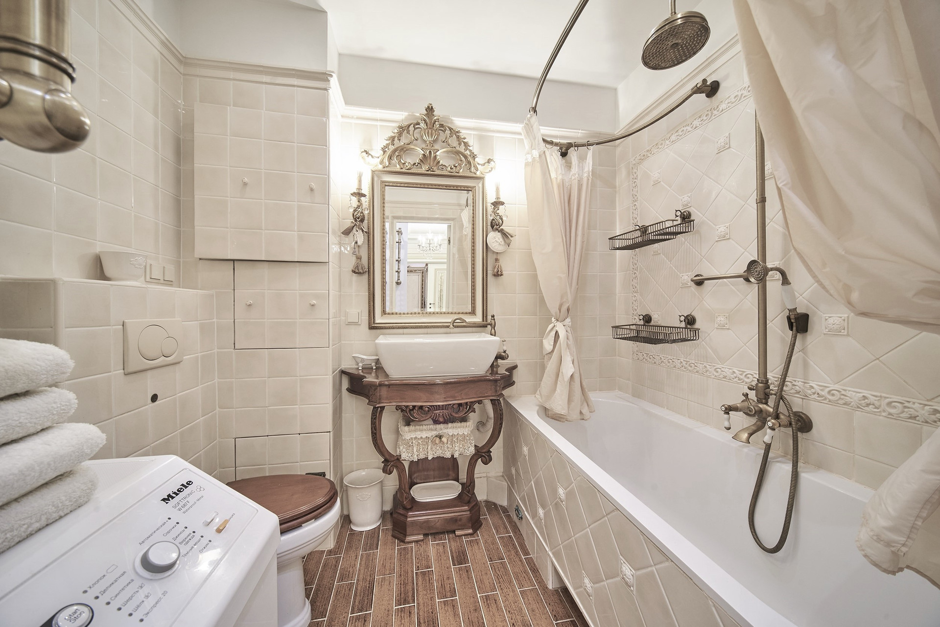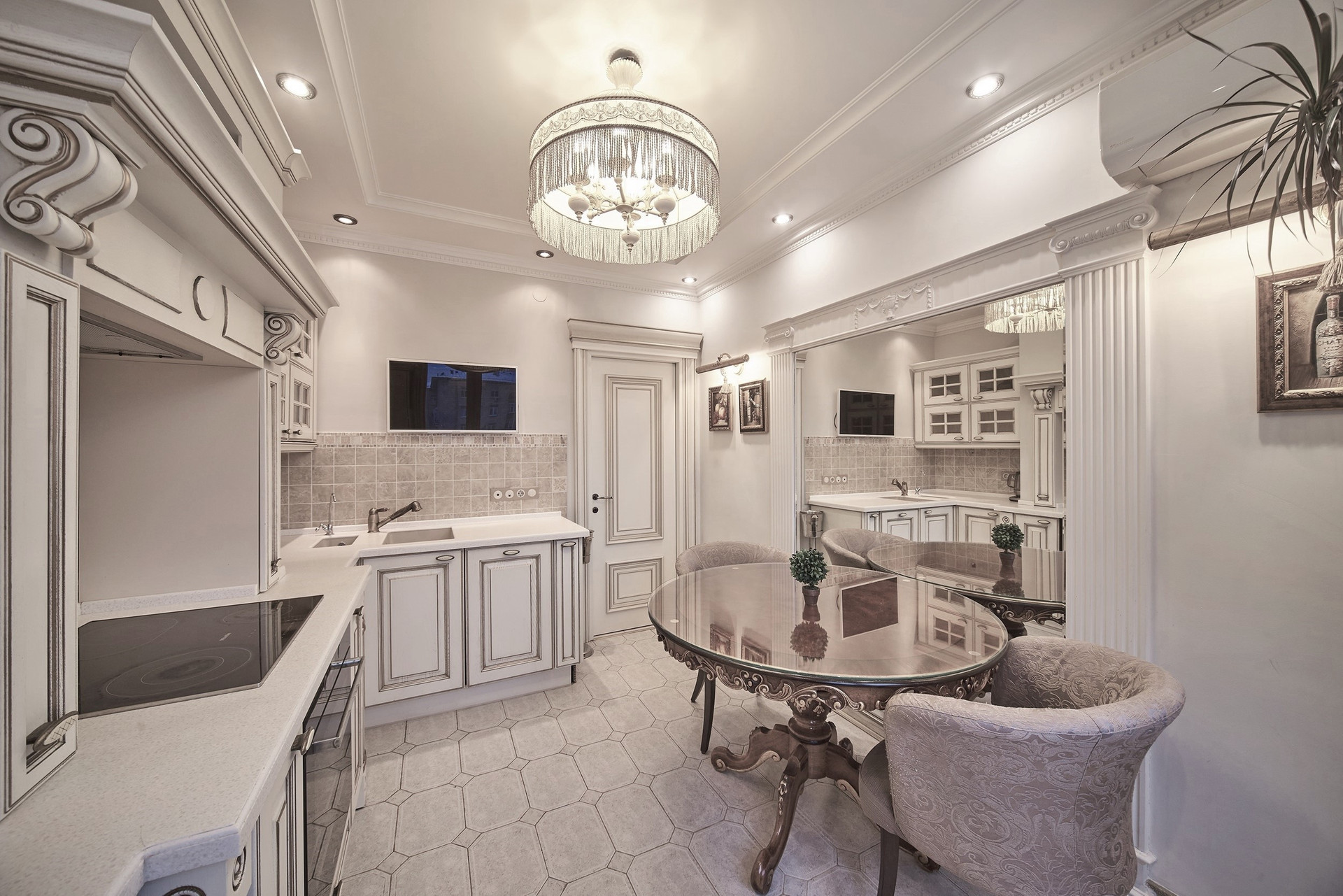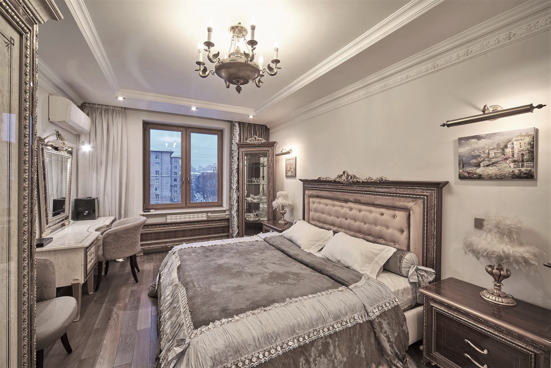 Окна - деревянные стеклопакеты немецкого производителя, полы - патинированный дуб. Сантехника Villeroy & Boch. Мебель Antonelli Moravio и прочих ведущих итальянских брендов. Приятные опции в виде туалетного стола с подсветкой, кровать Super King size - более 2Х2м, дорогой ортопедический матрац, гипоаллергенное белье. Бытовая техника ведущих производителей: варочная стекло керамическая панель Miele, духовой шкаф и стиральная машина Miele, посудомоечная машина и холодильник Bosch, чайник Bork, пылесос. Кондиционеры Daikin с функцией увлажнения, охлаждения, нагрева и ионизации воздуха. Дверные ручки – серебро 950*, мозаика 24 каратное золото. Комфортная рабочая зона с письменным столом. Кабельное телевидение 700 каналов, высокоскоростной интернет, домофон и видео наблюдение в подъезде и на этаже.