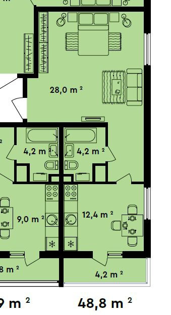 Общая площадь - 46,7 кв. м (комната – 42,5 кв. м, ванная комната -4,2 кв. м)