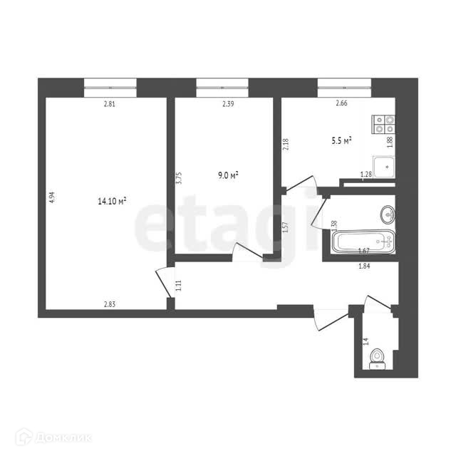 Площадь квартиры 40.4 кв.м. Комнаты: 14.1 и 9.0 кв.м, кухня 5.5 кв. м квадратной формы. Санузел раздельный.