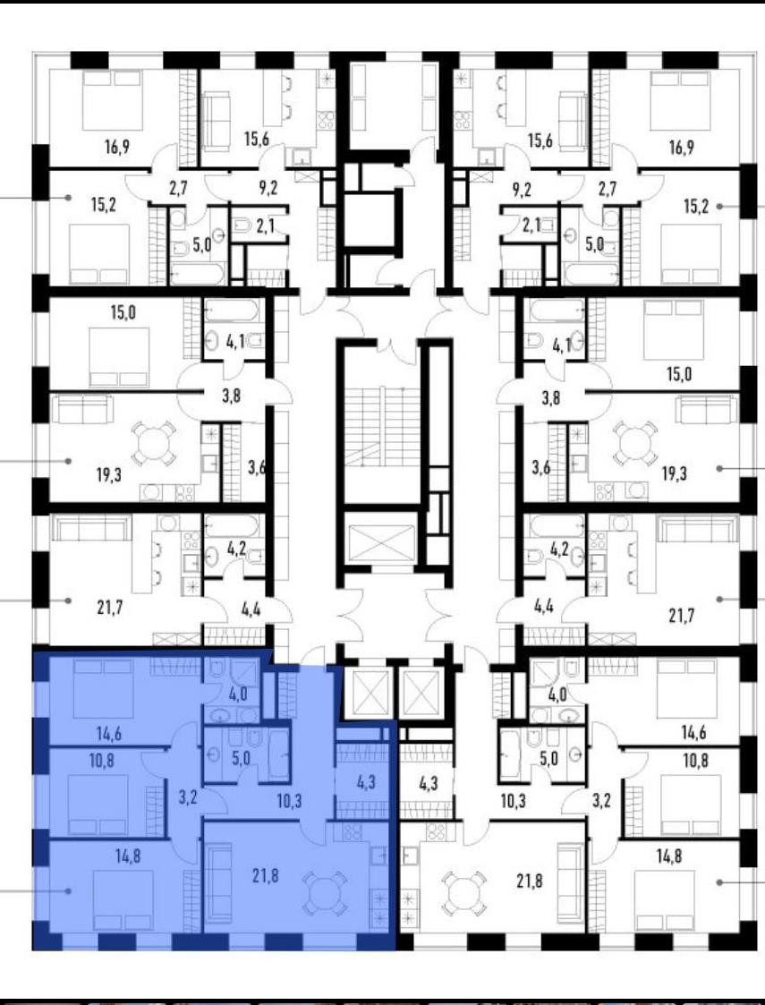 Продаётся просторная, светлая, квартира в ЖК бизнес-класса Кварталы 21/19, расположенная на 16-м этаже( всего 23 этажа), общей площадью 88,4 кв.м, Свободная планировка (возможный вариант: комнаты 14,8-14,4-10,8 кв.м., кухня-гостиная 21,8 кв. м., 2 с/у), гардеробная 4,3 кв.м . Окна из гостиной (21,8 кв.м .) и спальни (14,8 кв.м.) выходят на юг, остальные окна на запад.
