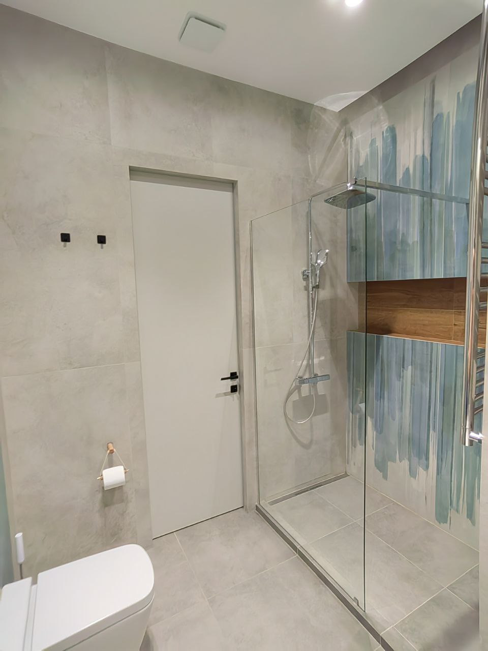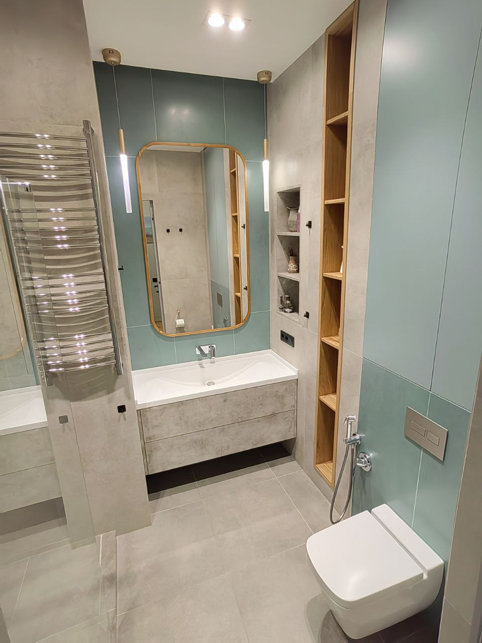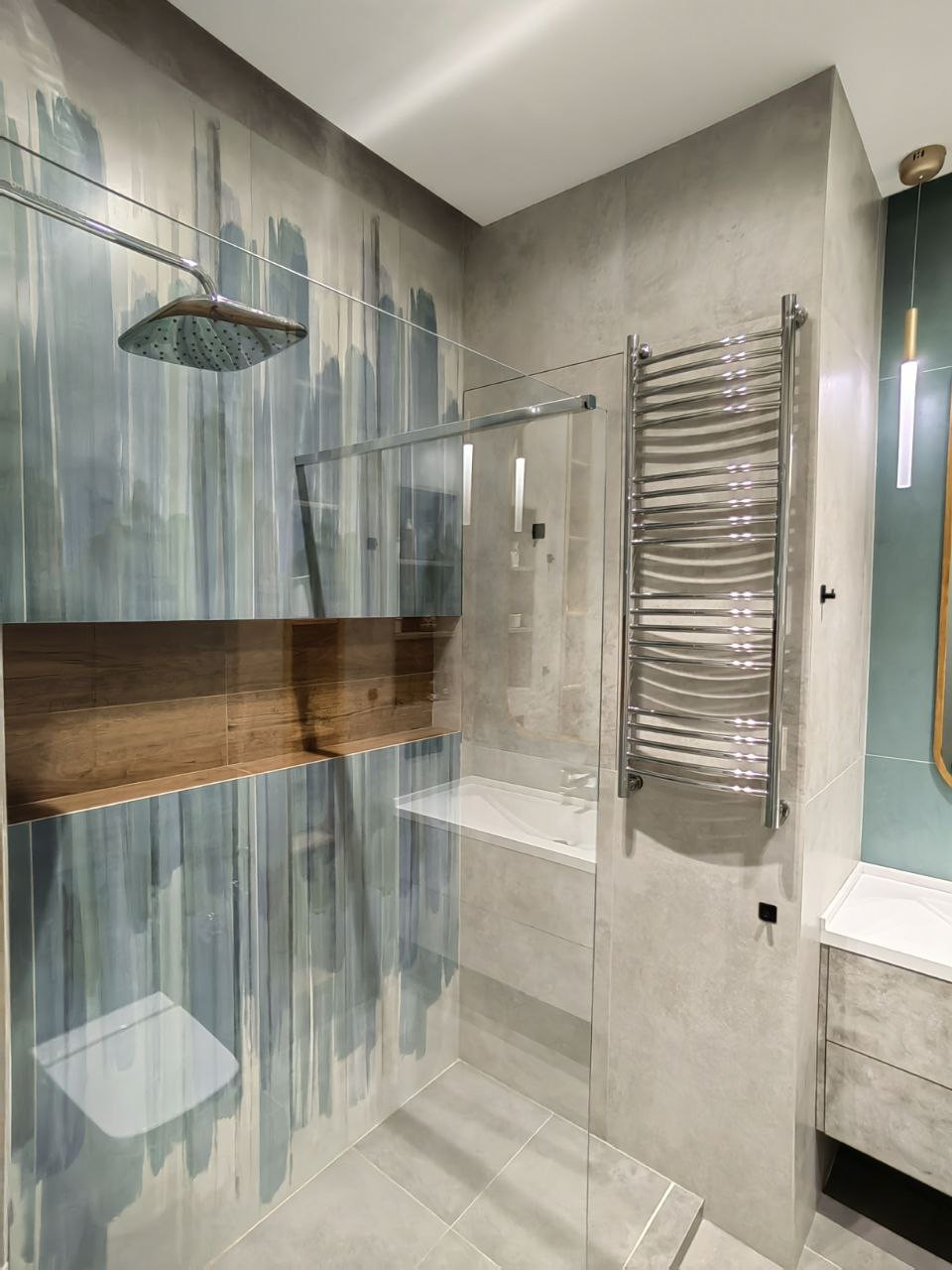 Теплый пол в ванной, на лоджии и постирочной. Дизайнерские радиаторы отопления, с запасом по мощности, зимой максимум % на 30, очень тепло. Пол- инженерная доска; ванная, лоджия, постирочная - керамогранит.